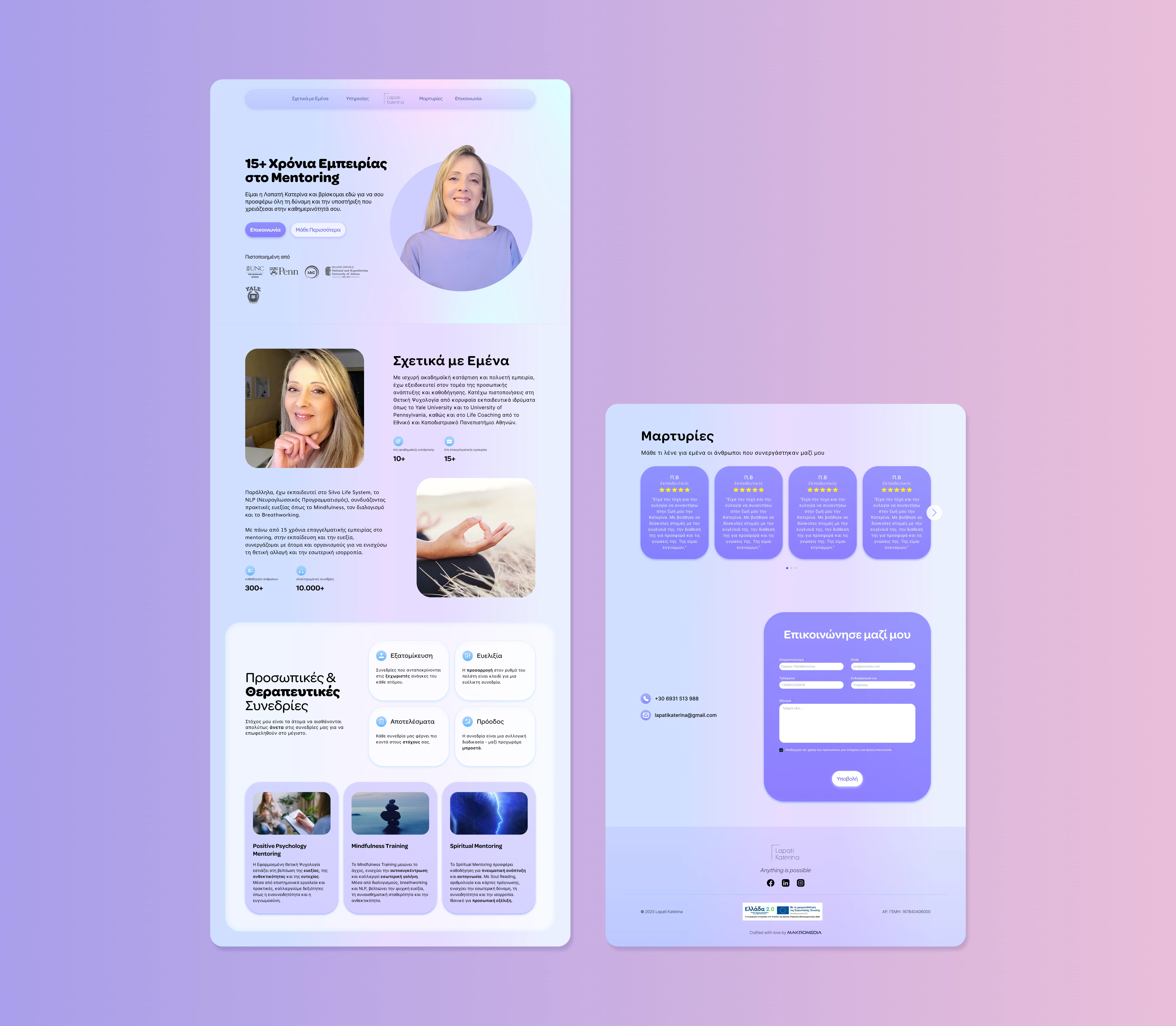 This project involves the redesign of Lapati Katerina's landing page. The goal was to modernize the existing page and adhere to her preferred colour palette (pastel colours). Since Katerina is a mentor offering mindfulness, coaching and meditation services to greek and international customers, the website should reflect a calm vibe.