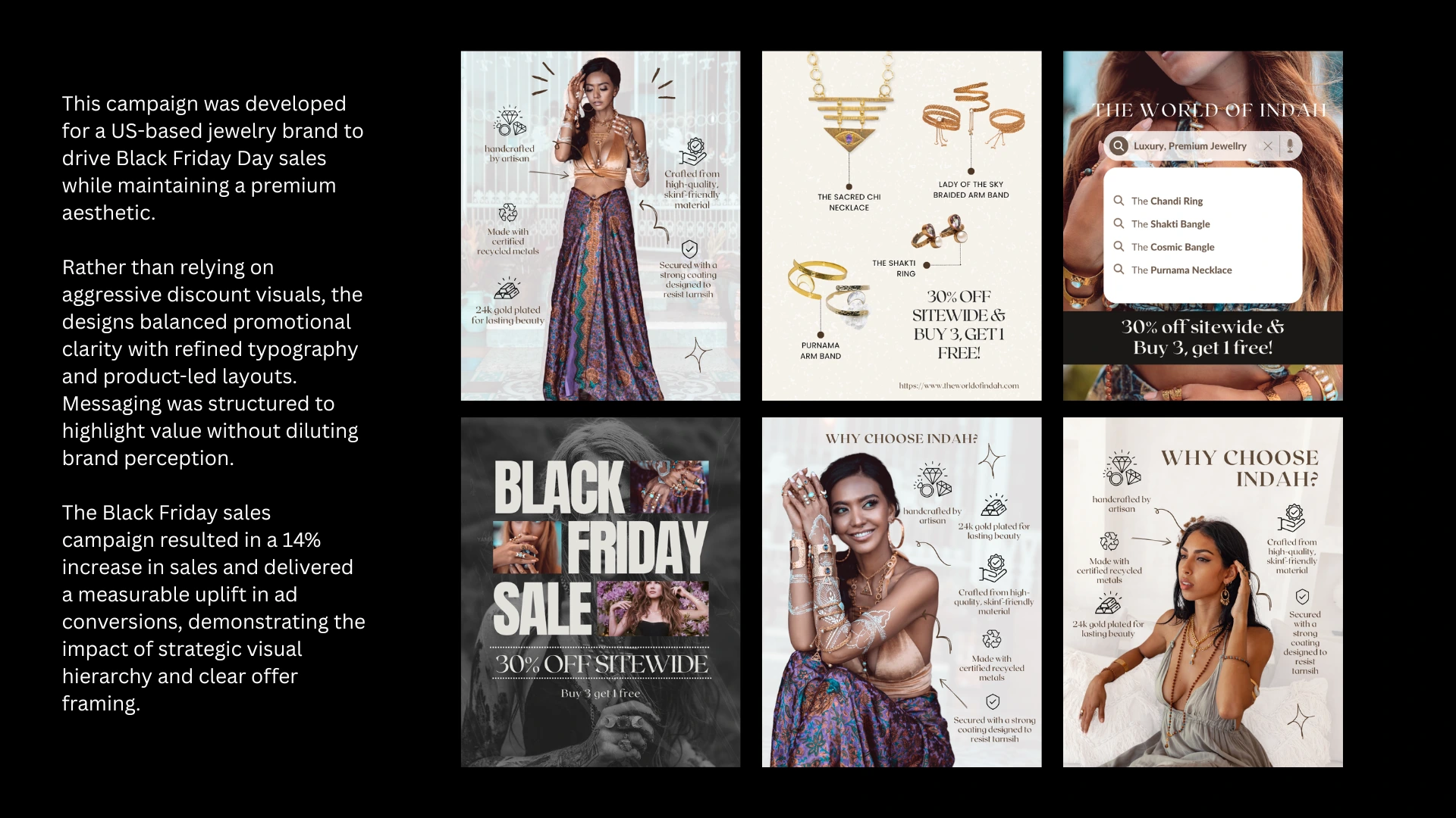 The Black Friday campaign resulted in a 14% increase in sales and delivered measurable uplift in ad conversions. The campaign validated that luxury positioning and promotional clarity can coexist when visual hierarchy is strategically structured.