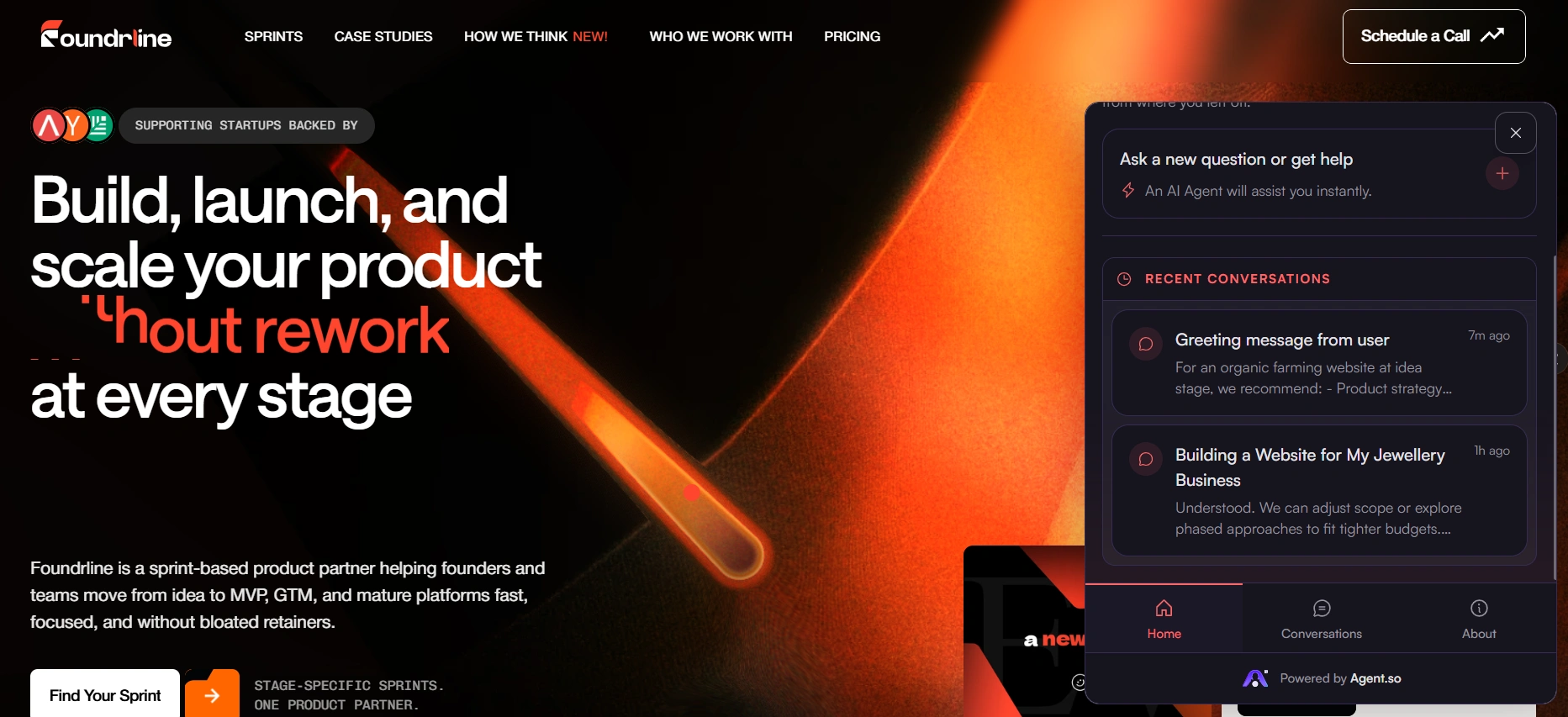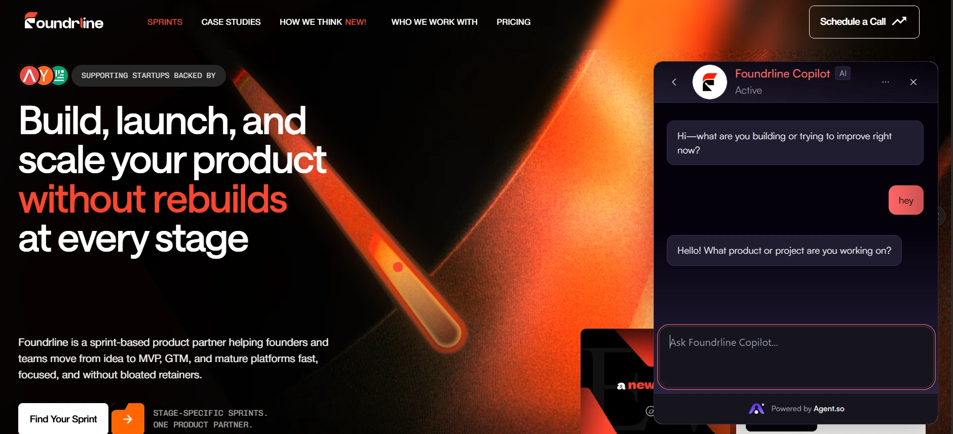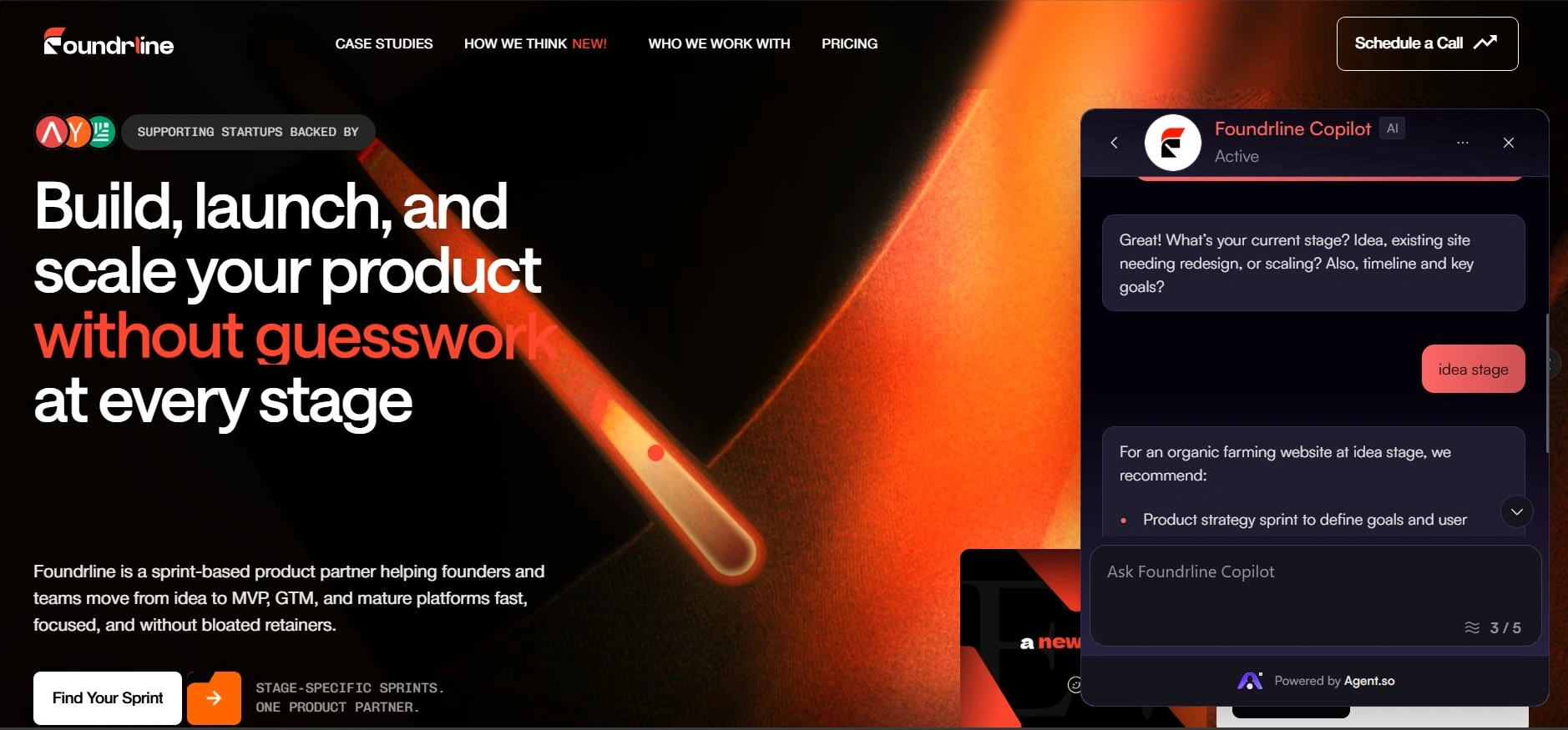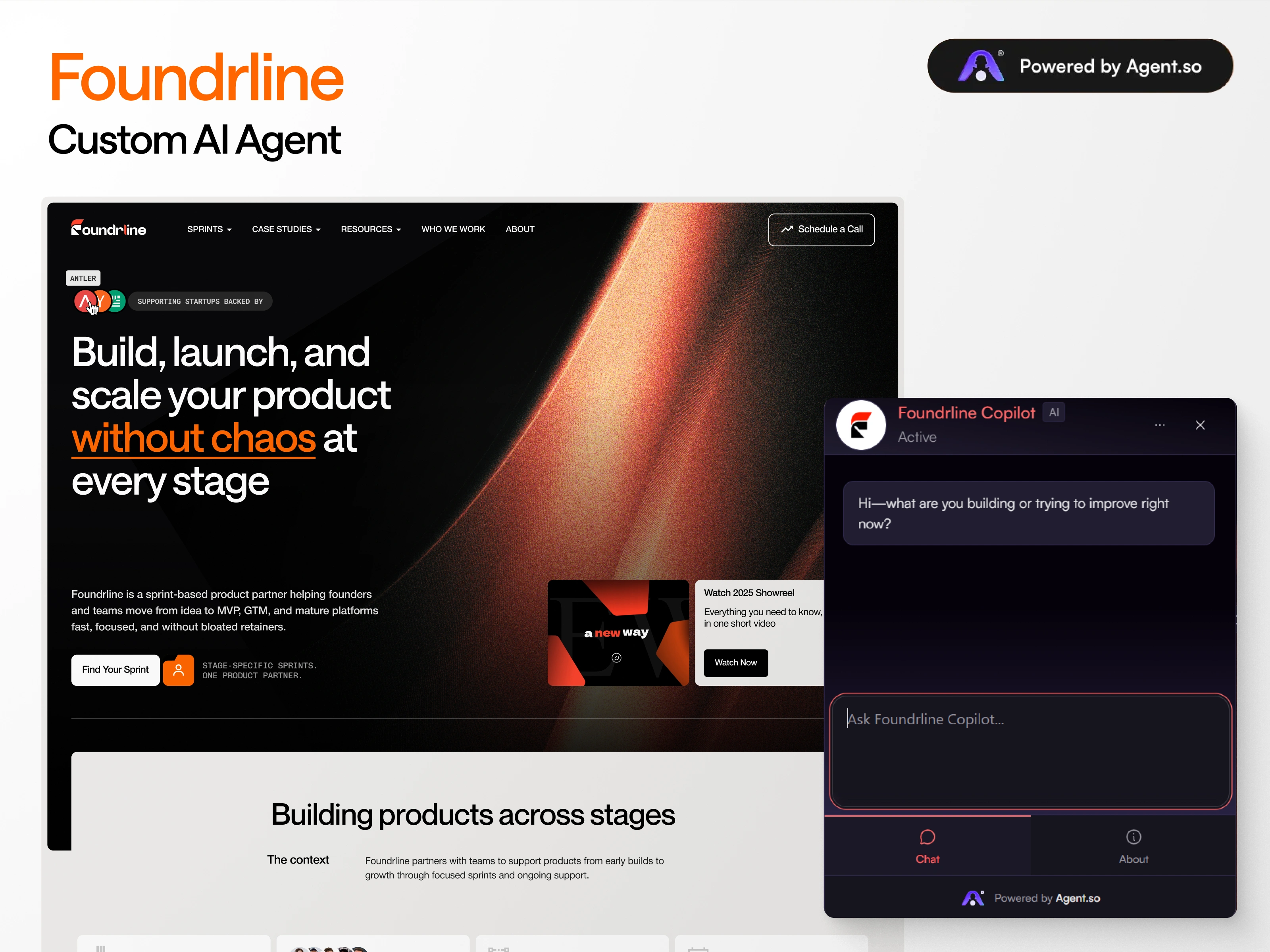 Foundrline deployed a senior-positioned AI agent (“Foundrline Strategist”) across key pages (Homepage, Programs, Services).
