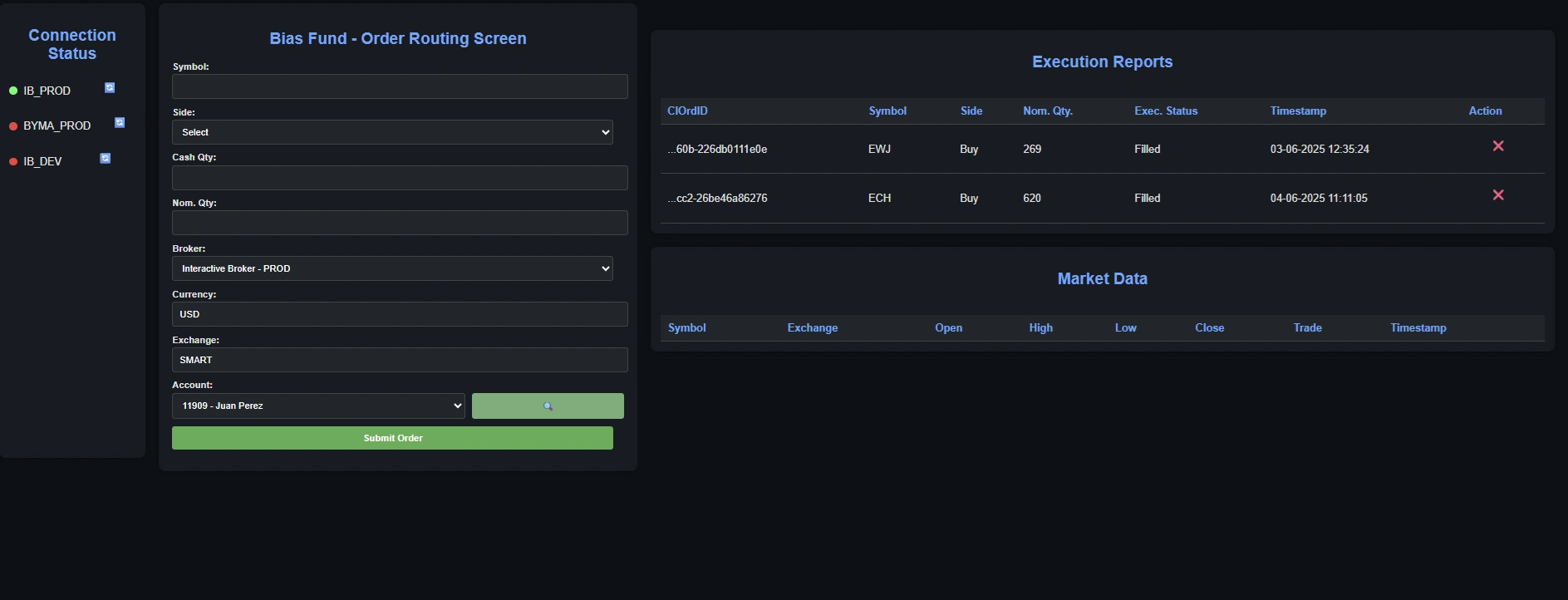 Built a trading dashboard for advisors, integrating IBKR/BYMA for order routing, account control, and execution tracking across clients.