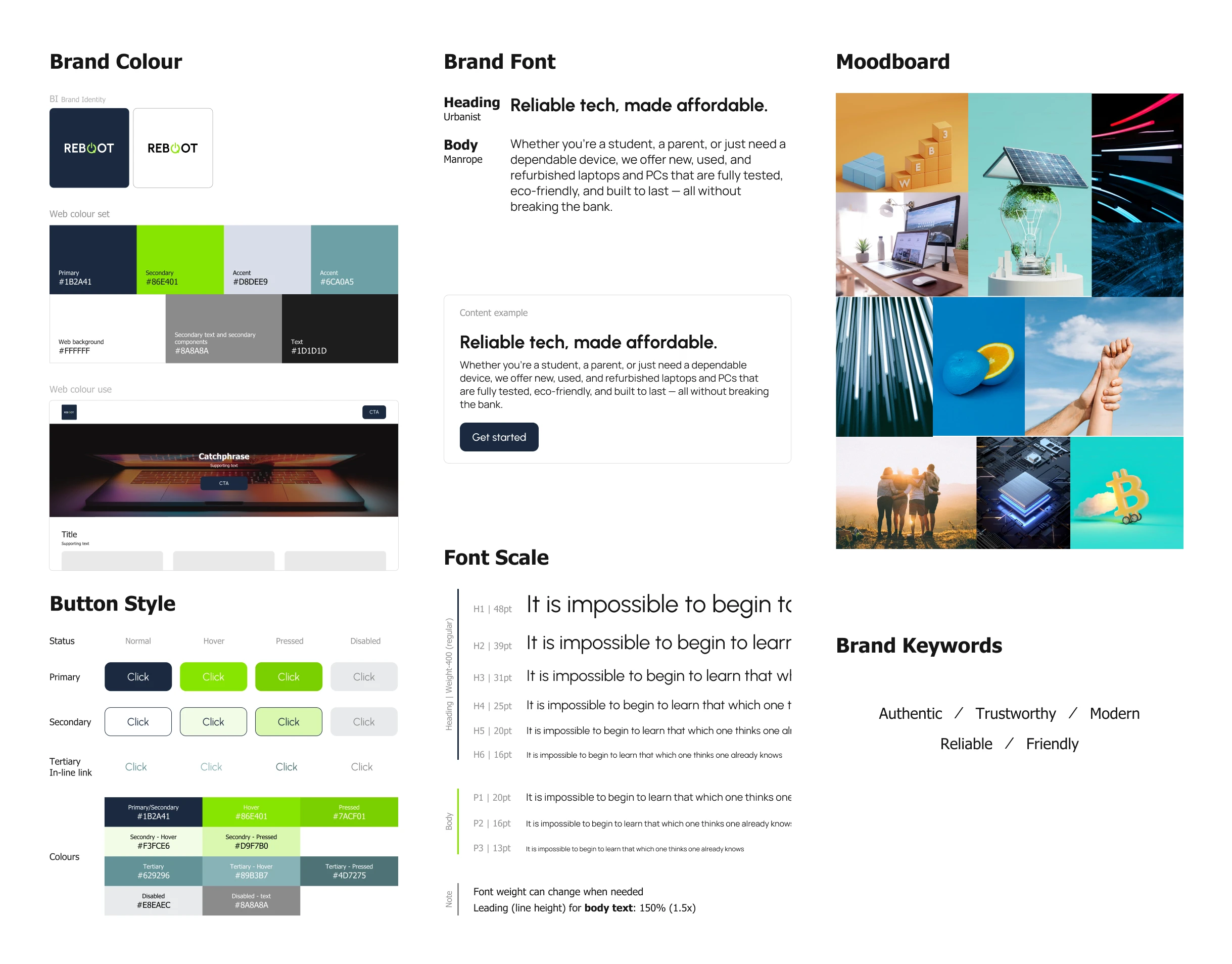 I led a collaborative brand development process, starting with a questionnaire and founder interview to uncover the company's core values and mission. Through workshopping sessions, we landed on "Reboot", a name that perfectly captured both giving people second chances and giving hardware a second life. I developed moodboards to establish the emotional direction: clean and modern while conveying sustainability, warmth, and support. From there, I explored multiple color palettes (bold, corporate, neutral) to find the right balance, then paired typography with the chosen system through website mockups. The logo concept drew from the universal tech power/restart symbol along with a play on the traditional arrow-recycle symbol. Final brand guidelines packaged everything: logo usage, color systems, typography, tone, and website mockups, giving the startup a complete foundation to launch with consistency.