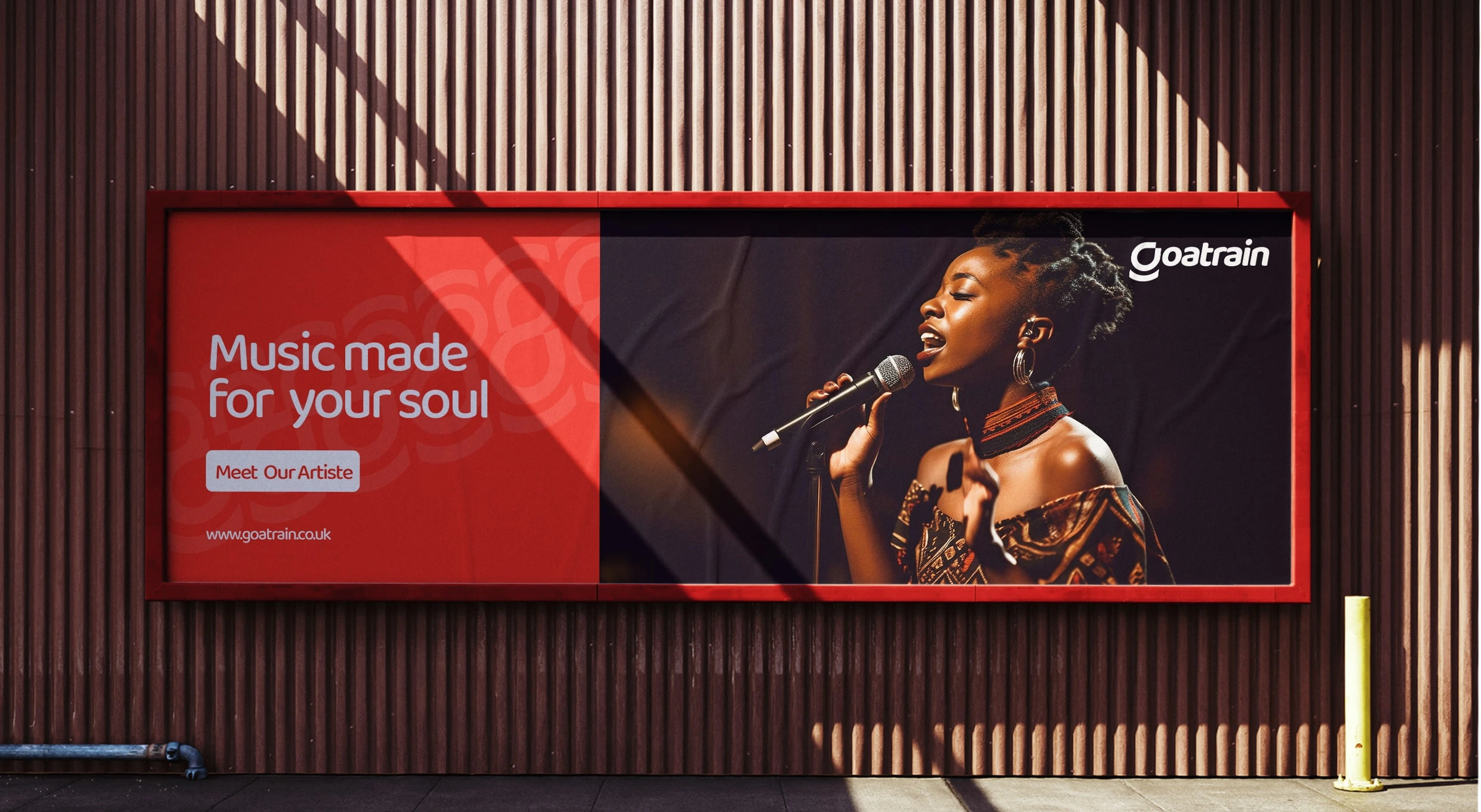 Goatrain is a UK-based music talent agency that needed a fresh identity to connect with a younger audience. We replaced their outdated logo with a bold new system: a vibrant red palette, a clean wordmark, and a stylized “G” symbol that radiates energy and joy.