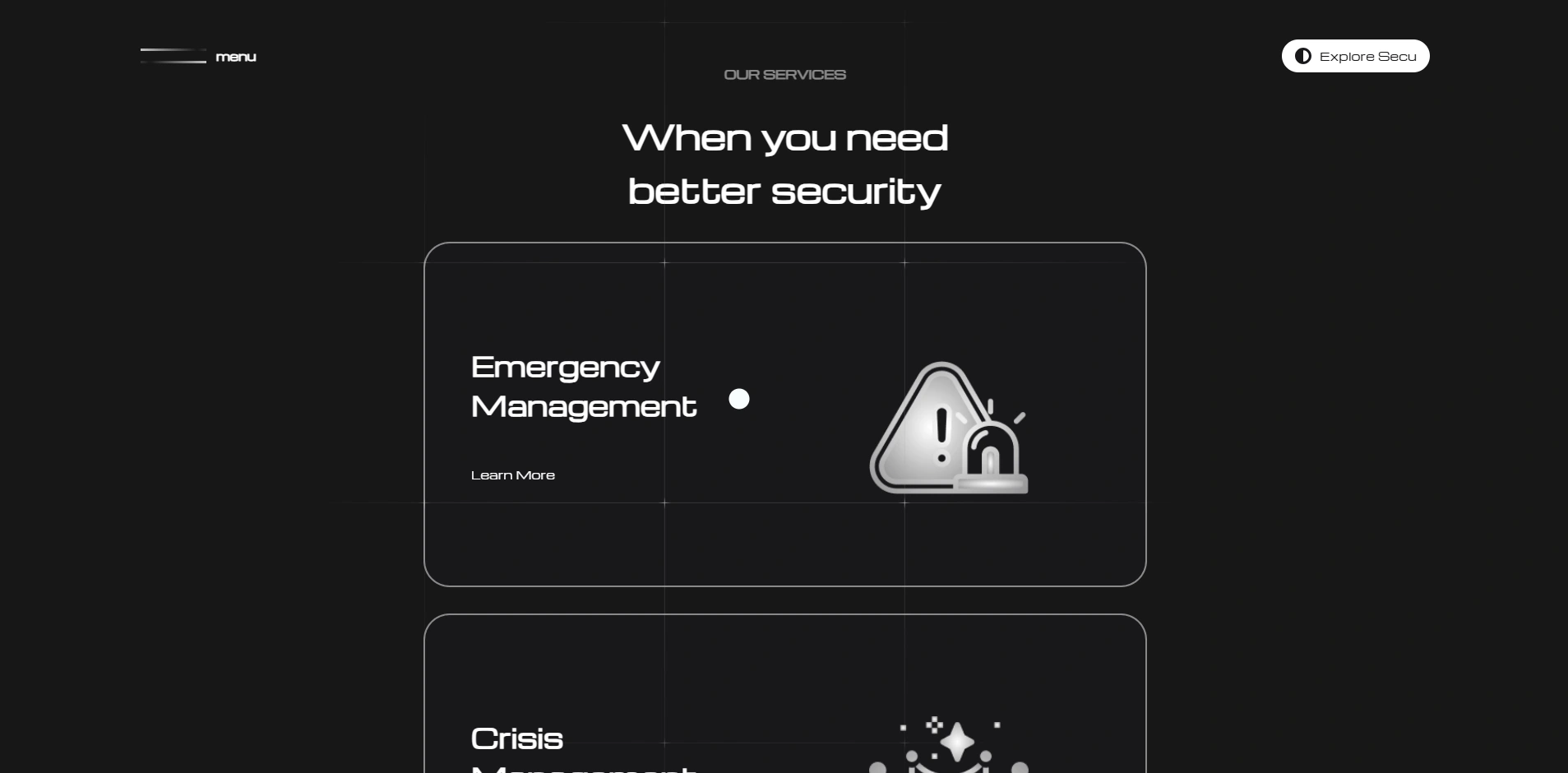 The experience prioritizes clarity and sophistication — 3D visuals are integrated in a way that enhances content without overpowering usability. The aesthetic reflects the professionalism and reliability of SECU’s real-world security services.