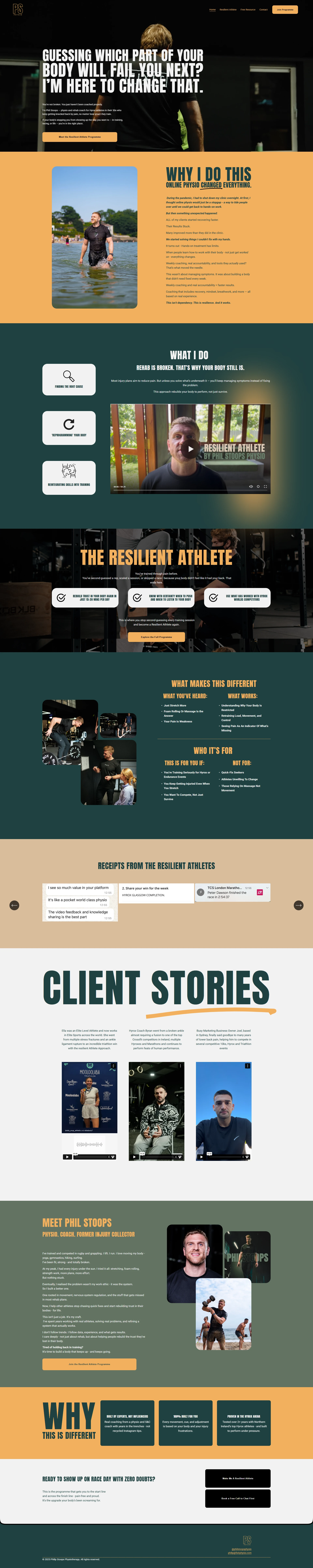 The user journey is strategically mapped through "What I Do" and "The Resilient Athlete" modules, utilizing a rugged, high-contrast visual hierarchy that reflects the intensity of the training program. I implemented a tiered lead generation structure featuring prominent "Join the Team" CTAs and a robust social proof section titled "Client Stories" to validate long-term results through video testimonials.