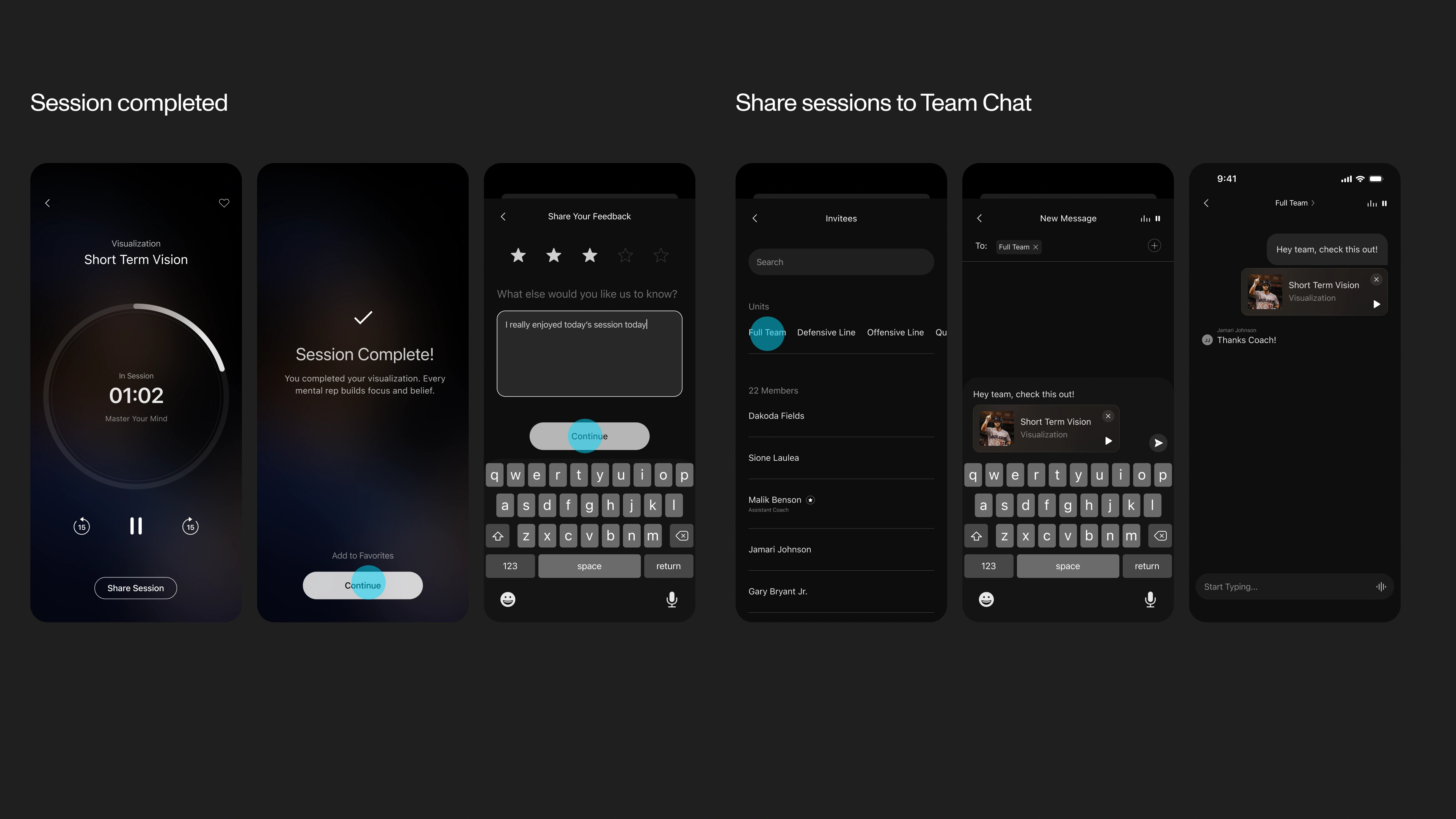 Designed a lightweight completion moment that rewards progress and guides the next step without breaking momentum. Extended the experience into team chat by designing shareable session cards and a smooth posting flow.