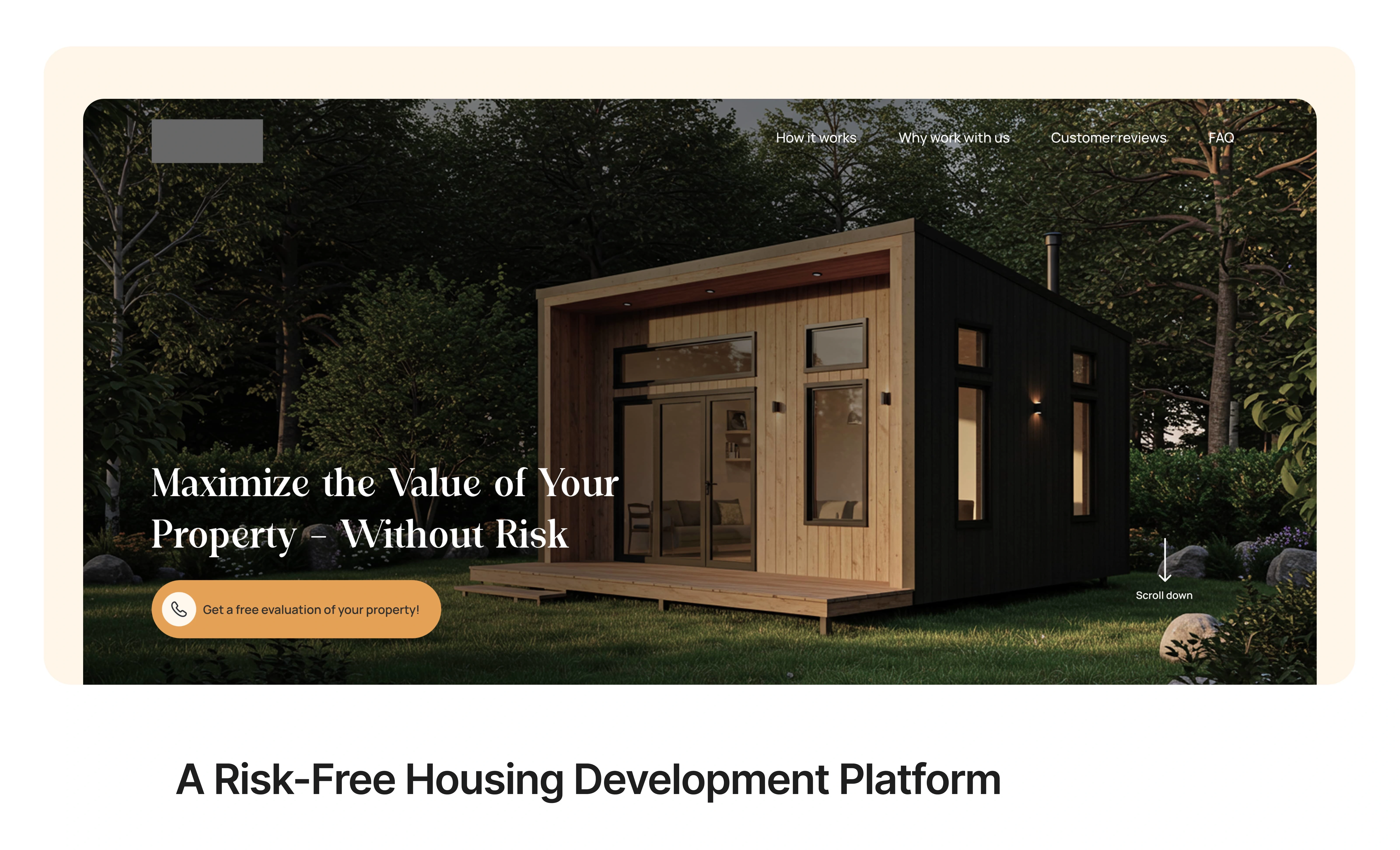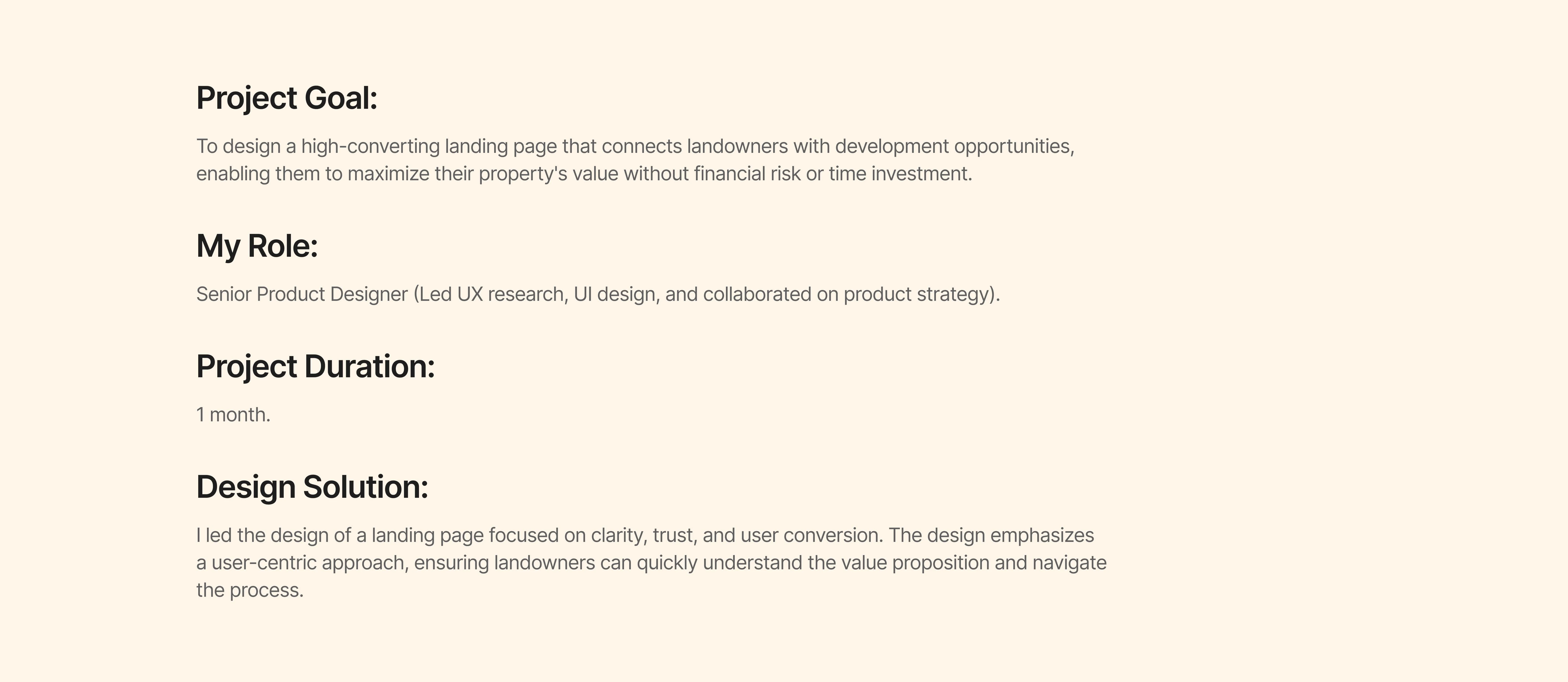 The design of the landing page is focused on clarity, trust, and user conversion ensuring landowners can quickly understand the value proposition.