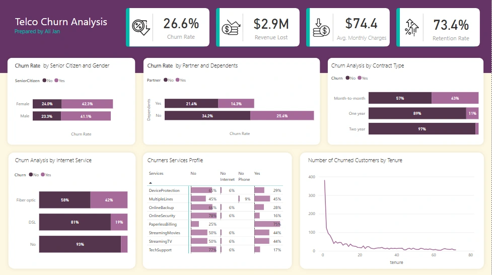 Analyzed customer churn metrics for a telecom company.
