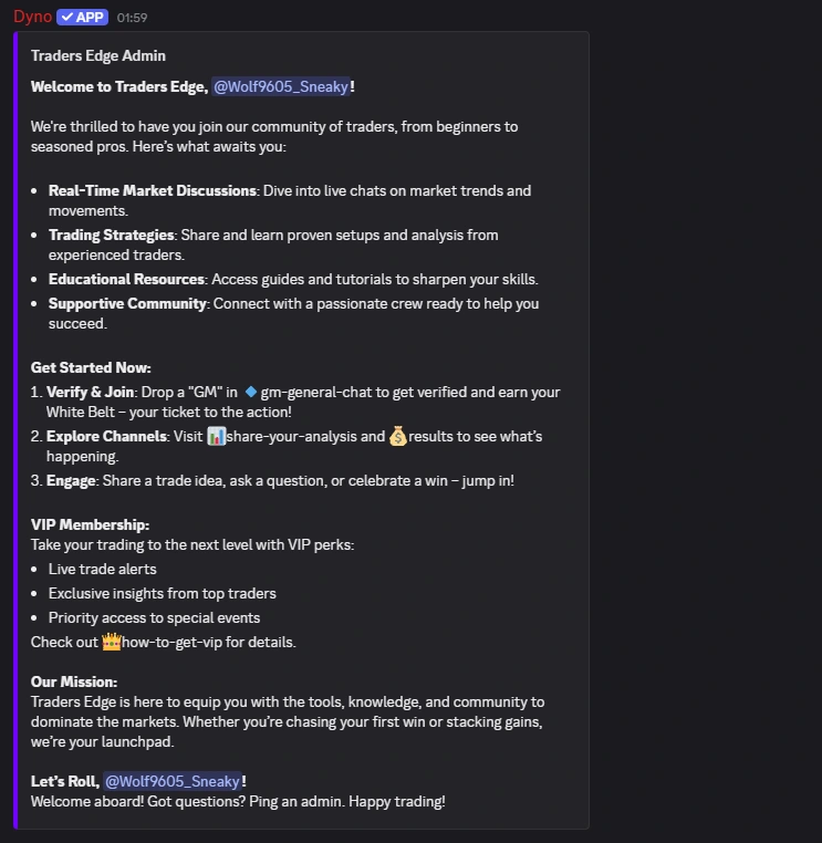I worked with a client running Traders Edge, a growing Discord community for traders seeking to enhance their trading skills and engagement. Their goal was to automate community management and provide real-time trading insights to attract 1,000+ members by year-end, boosting retention with valuable tools. The client needed a progress bot to track member milestones, a crypto trading bot for market updates and live, a gold trading bot which followed their trading systems and a Dyno welcome message bot to greet new joins and guide them through the server for onboarding.
