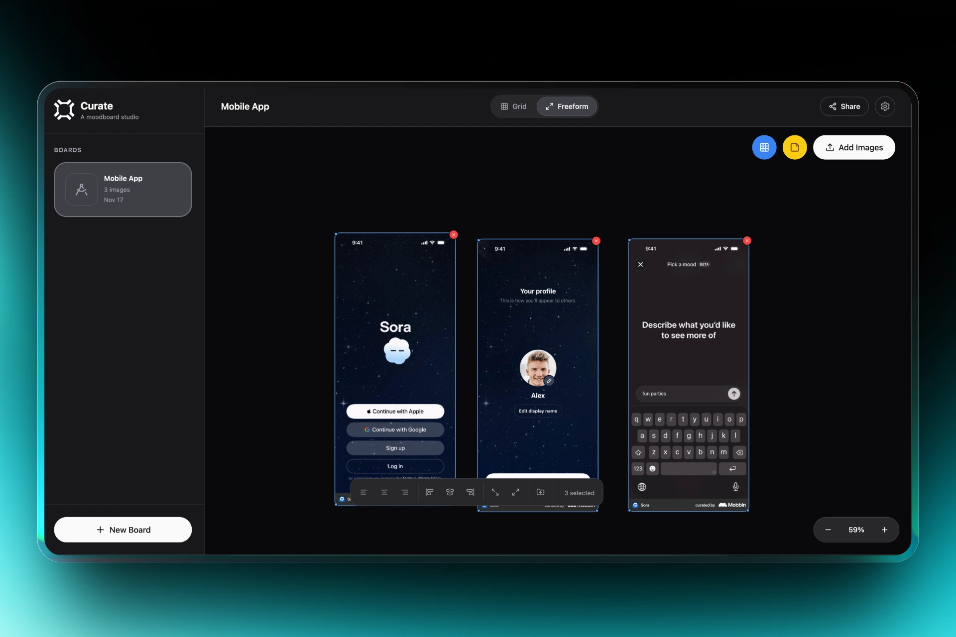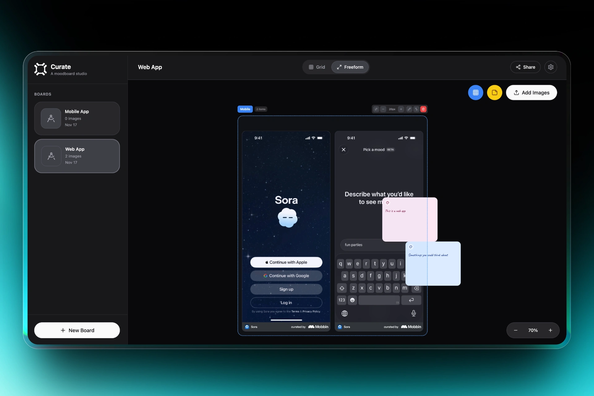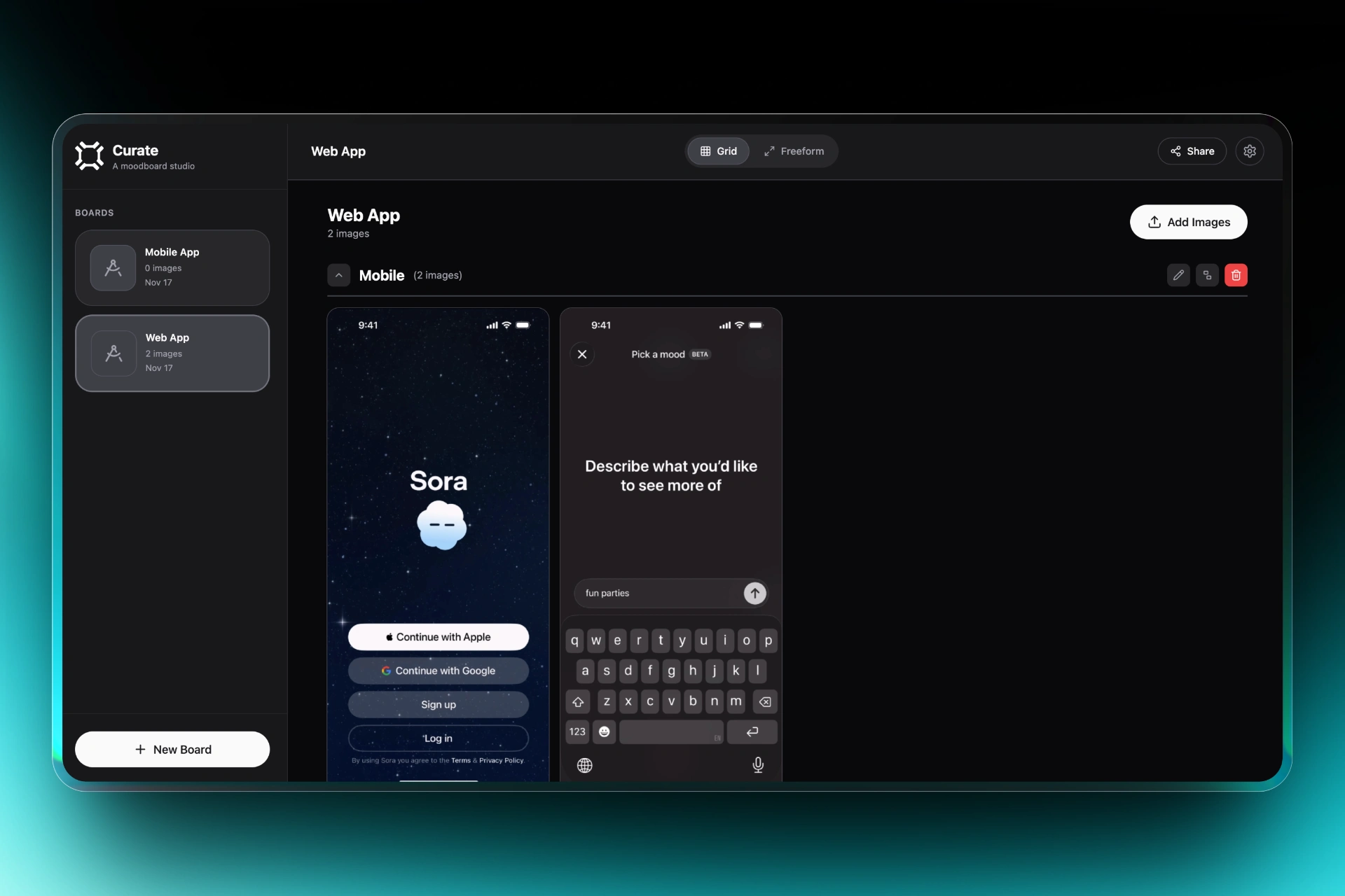 Grid Mode - A responsive masonry layout that automatically arranges images into columns. Images can be grouped into collapsible sections with headers, making it easy to categorize different types of inspiration (navigation examples, hero sections, color palettes, etc.).