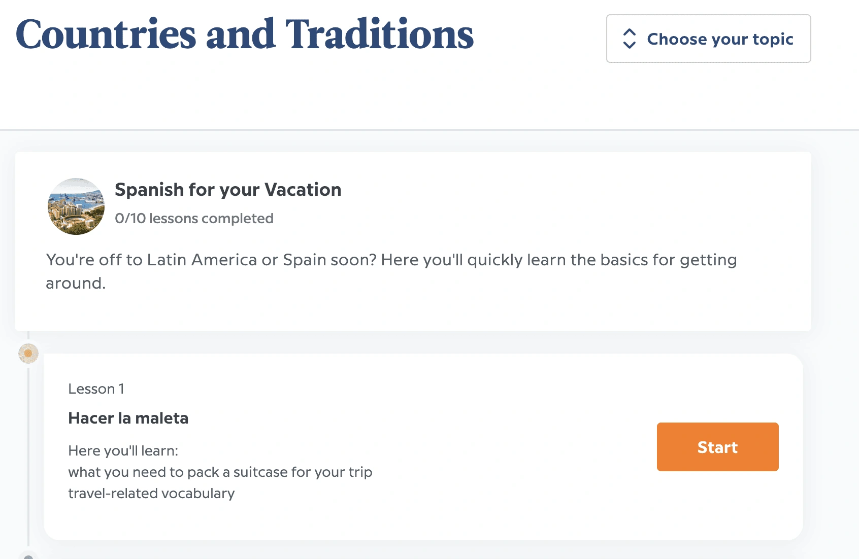 I ran into a technical issue where I found it hard to choose my level from the get-go. If you’re already at an intermediate level in Spanish, you might have to pass through the Newcomer lessons in order to get to the more advanced classes.