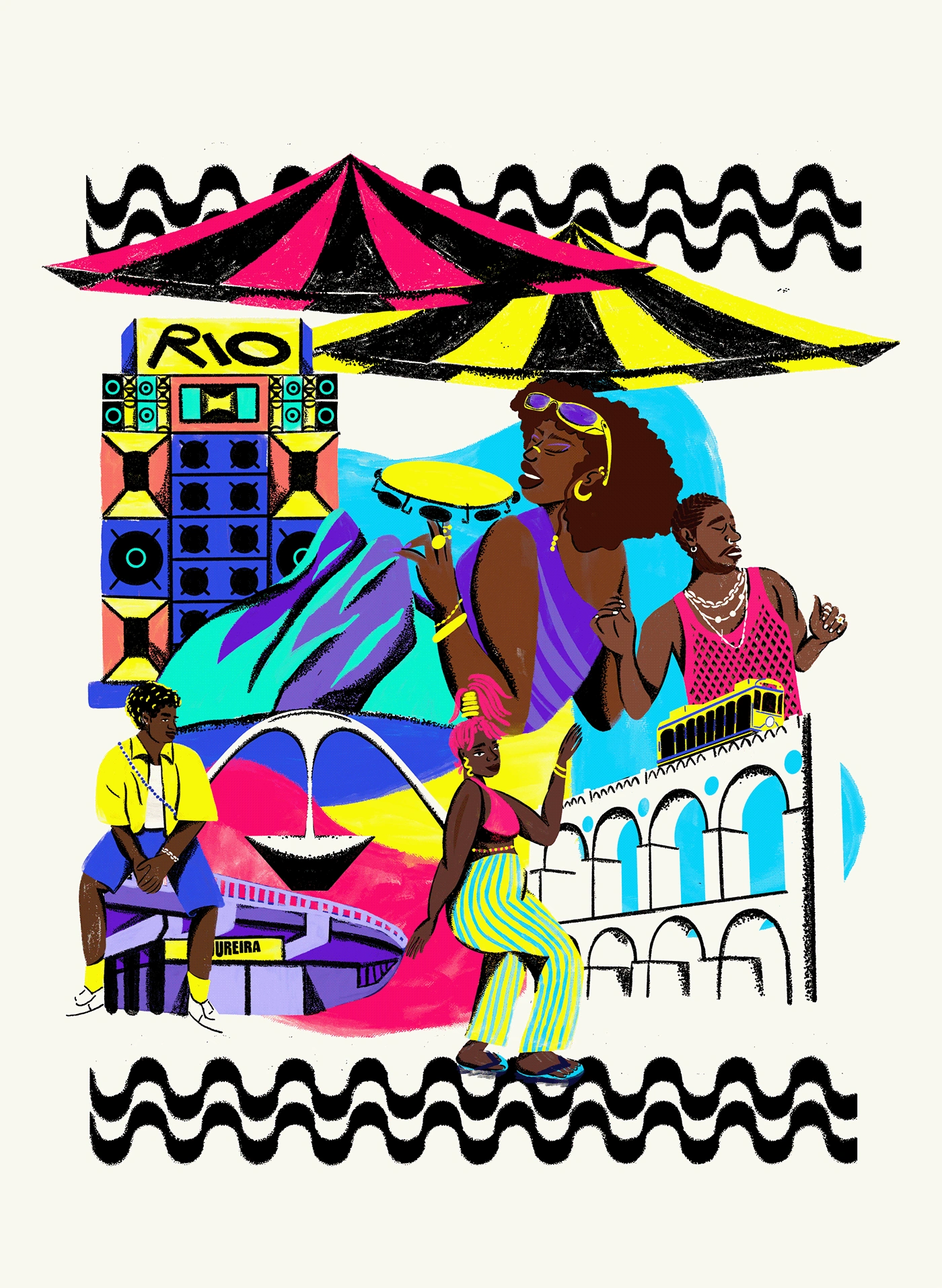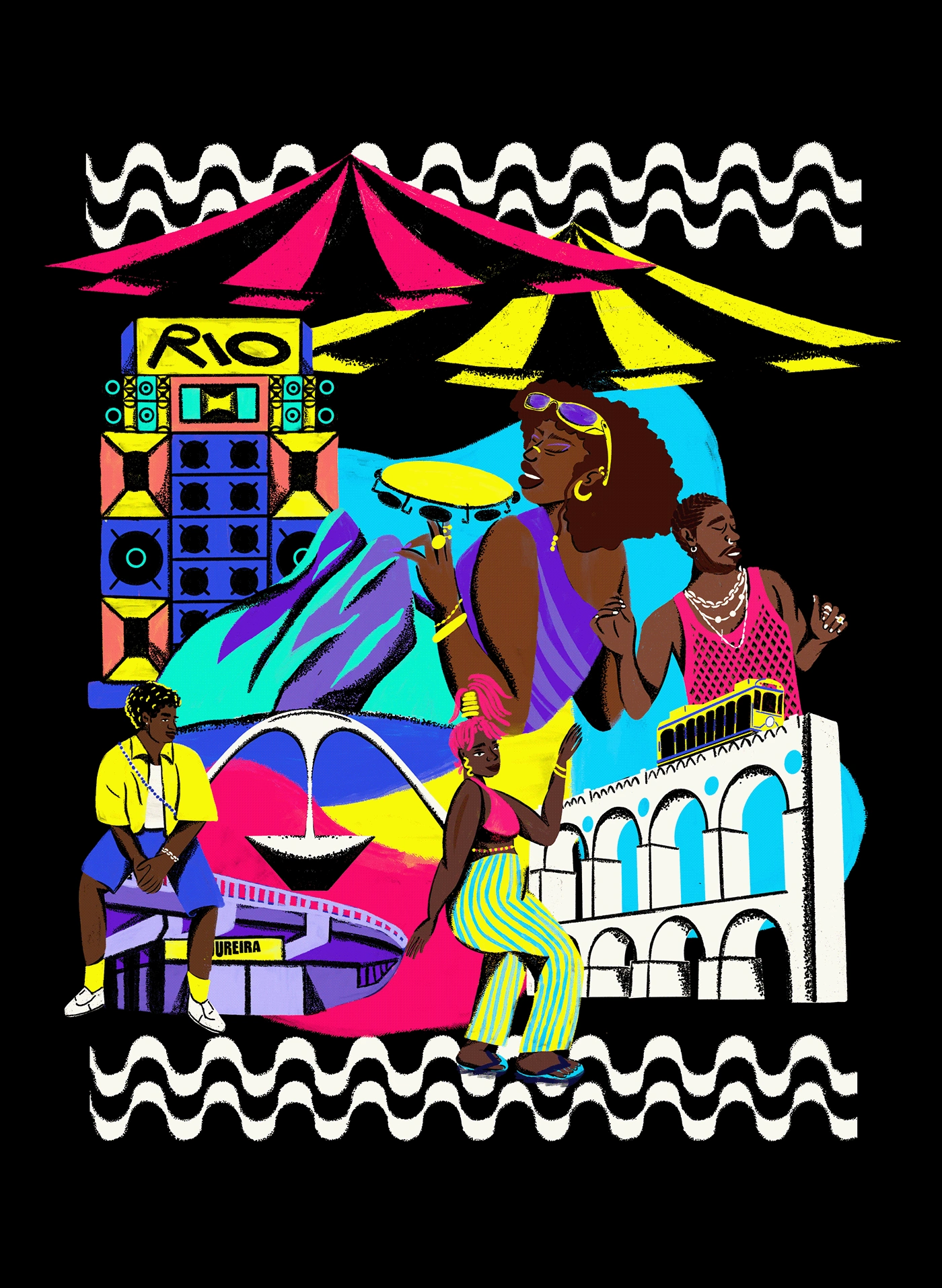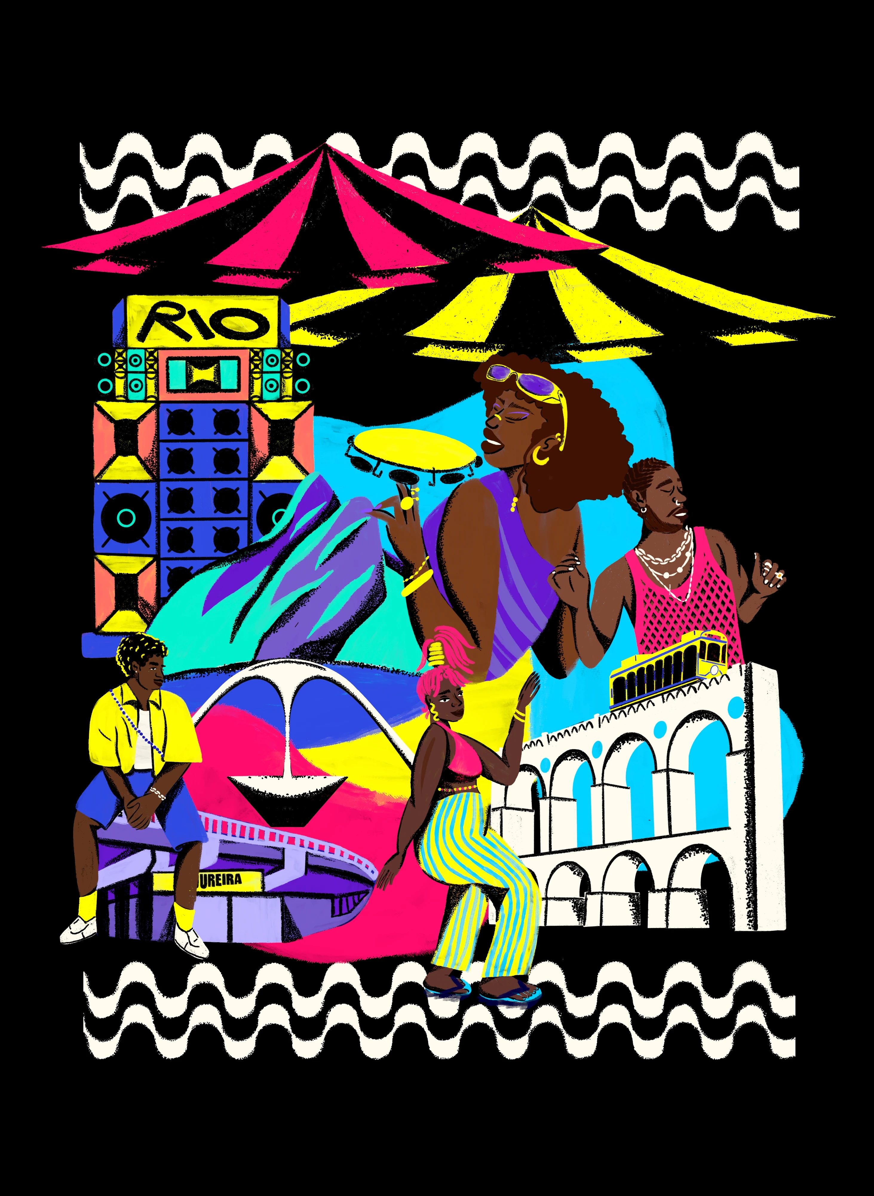 The composition balances globally recognized icons—such as the Arcos da Lapa, the Copacabana boardwalk, and Morro Dois Irmãos—with elements of the “inner Rio,” including the Madureira Viaduct, the Sapucaí Sambadrome, funk parties, street markets, and characters that express music, style, and resistance. The result is a celebration of the diverse and powerful presence of Black culture in Rio de Janeiro.