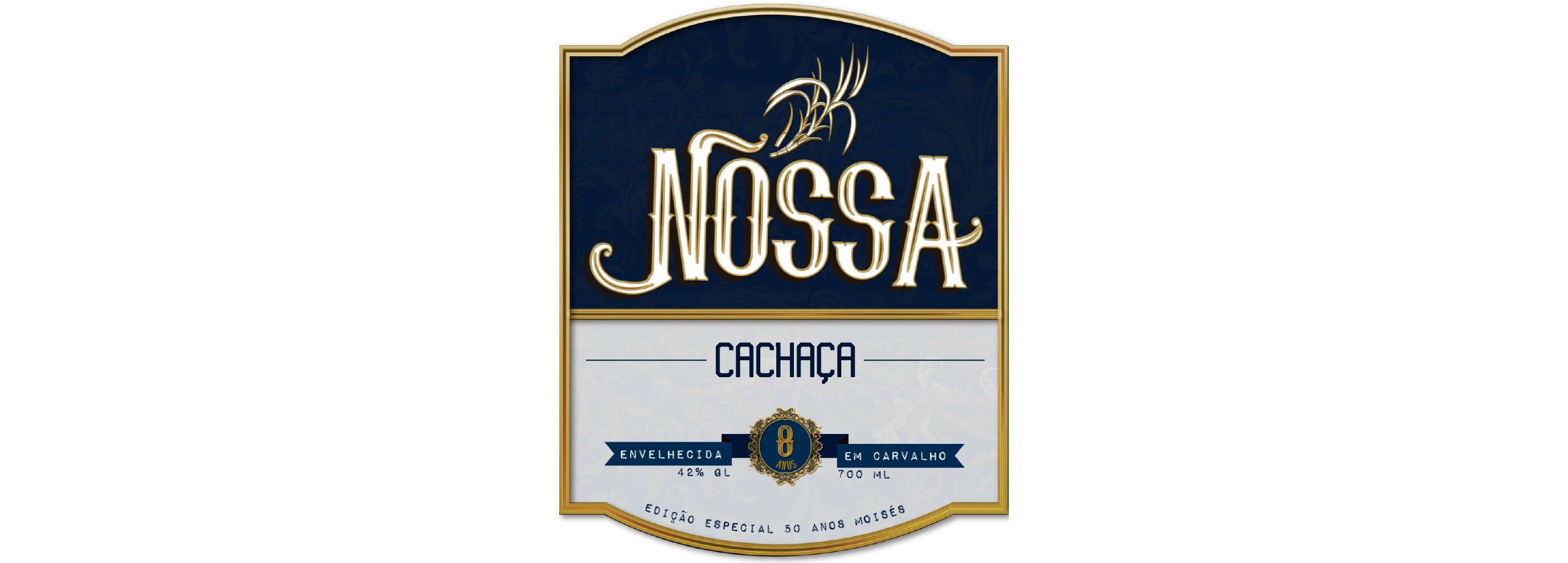 Rótulo de cachaça desenvolvido para presentear os convidados do aniversário de 50 anos do pai do cliente. O pedido era entregar a tradicionalidade de rótulos antigos para uma família conservadora. O rótulo foi impresso em vinil leitoso, laminado para resistir à líquidos e umidade, e acabado com um hot stamping.