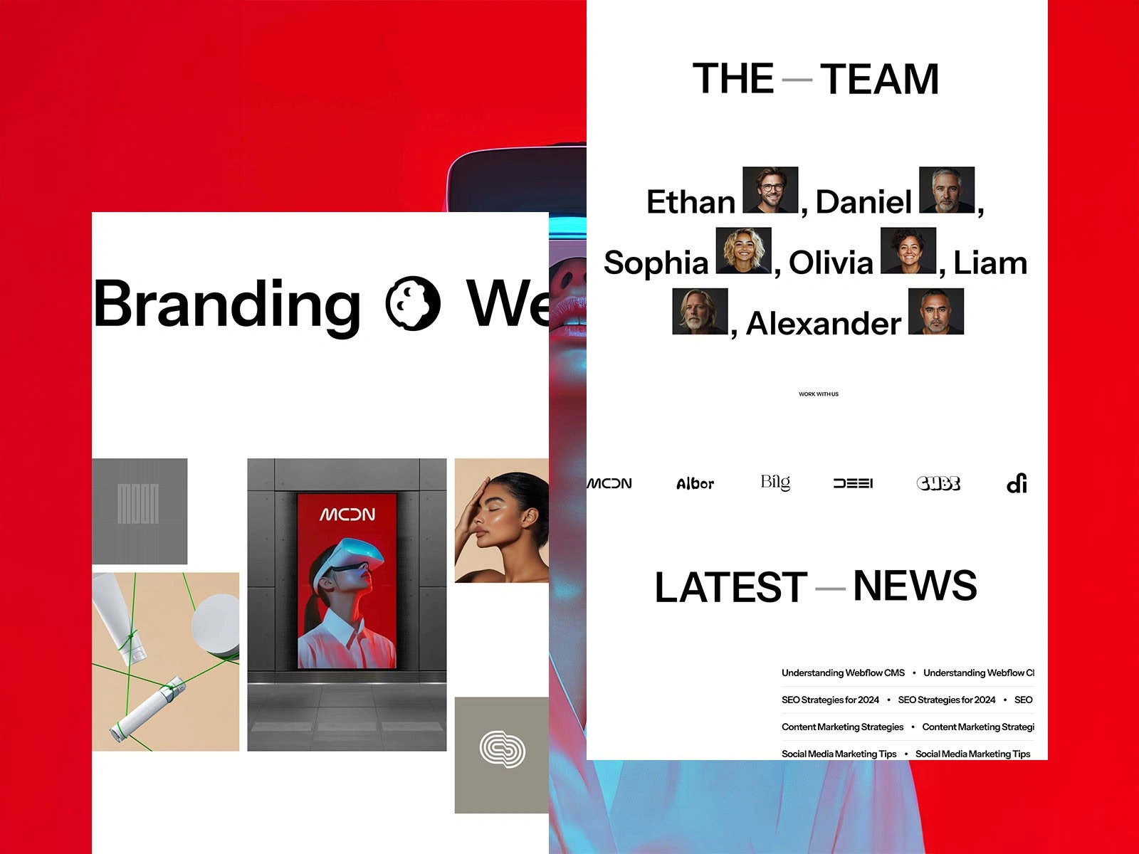 The design mixed stark black and white with bold red accent moments — a high-contrast combination that demanded precise Framer development to execute without losing responsiveness