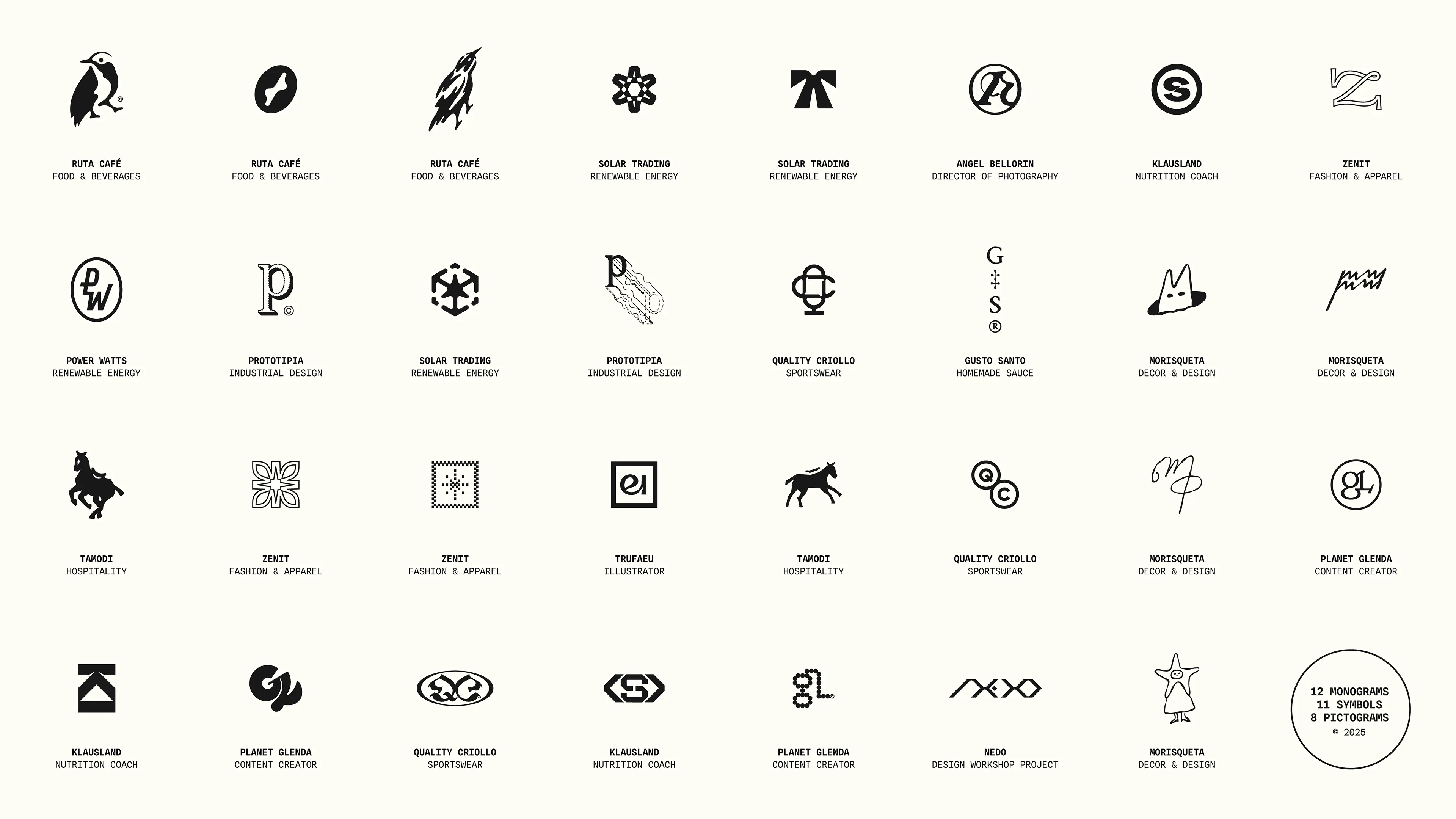 A collection of monograms, pictograms and symbols designed throughout 2025 for clients from several types of industries.