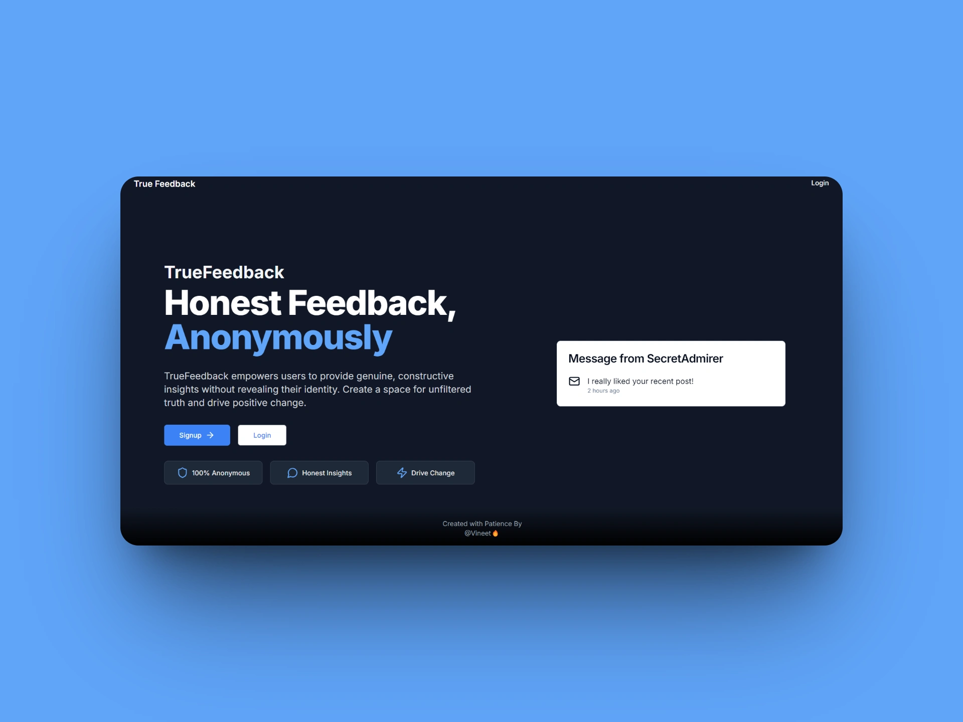 TrueFeedback is a platform where users can provide anonymous feedback to individuals or organizations without revealing their identity.