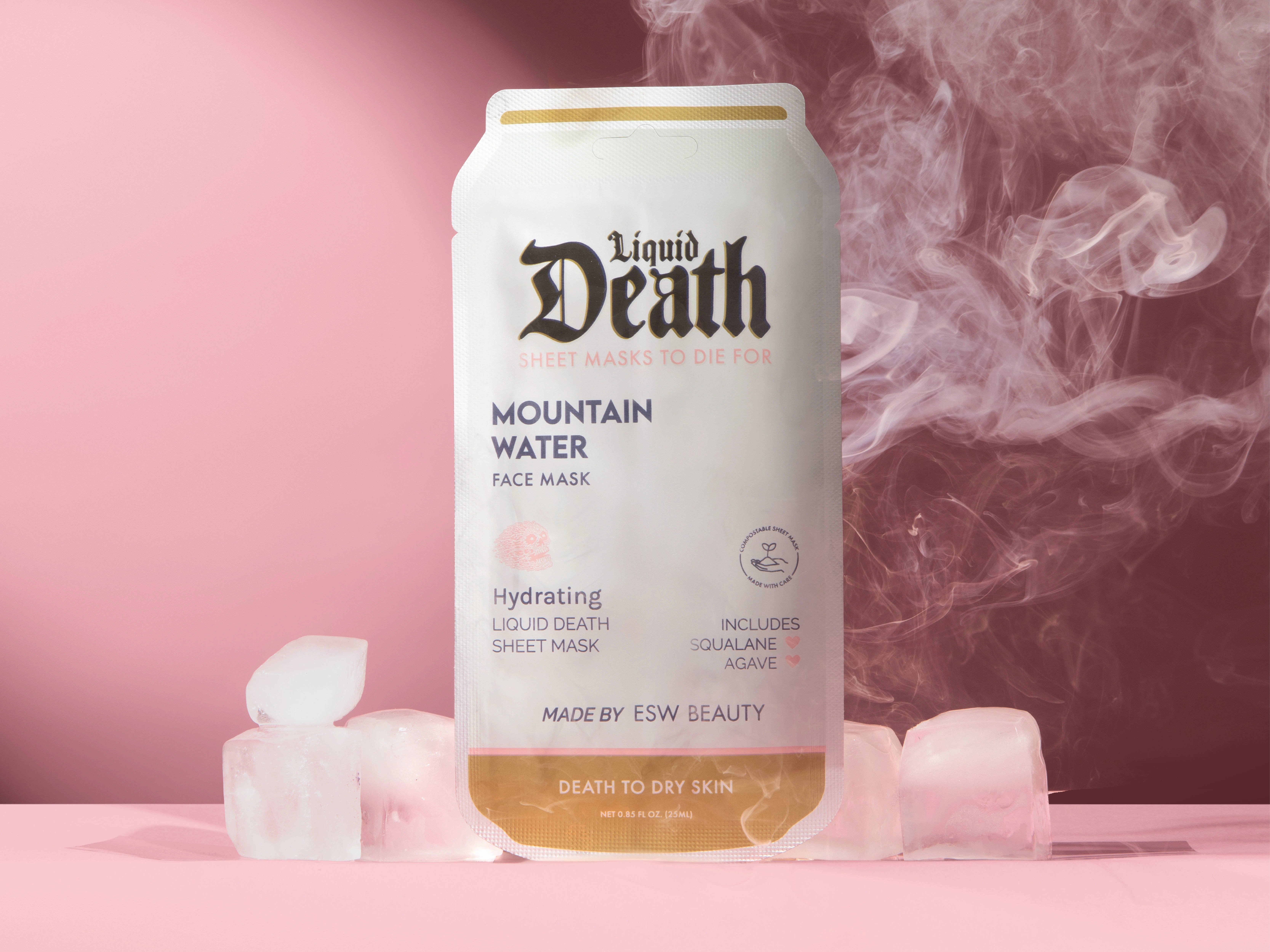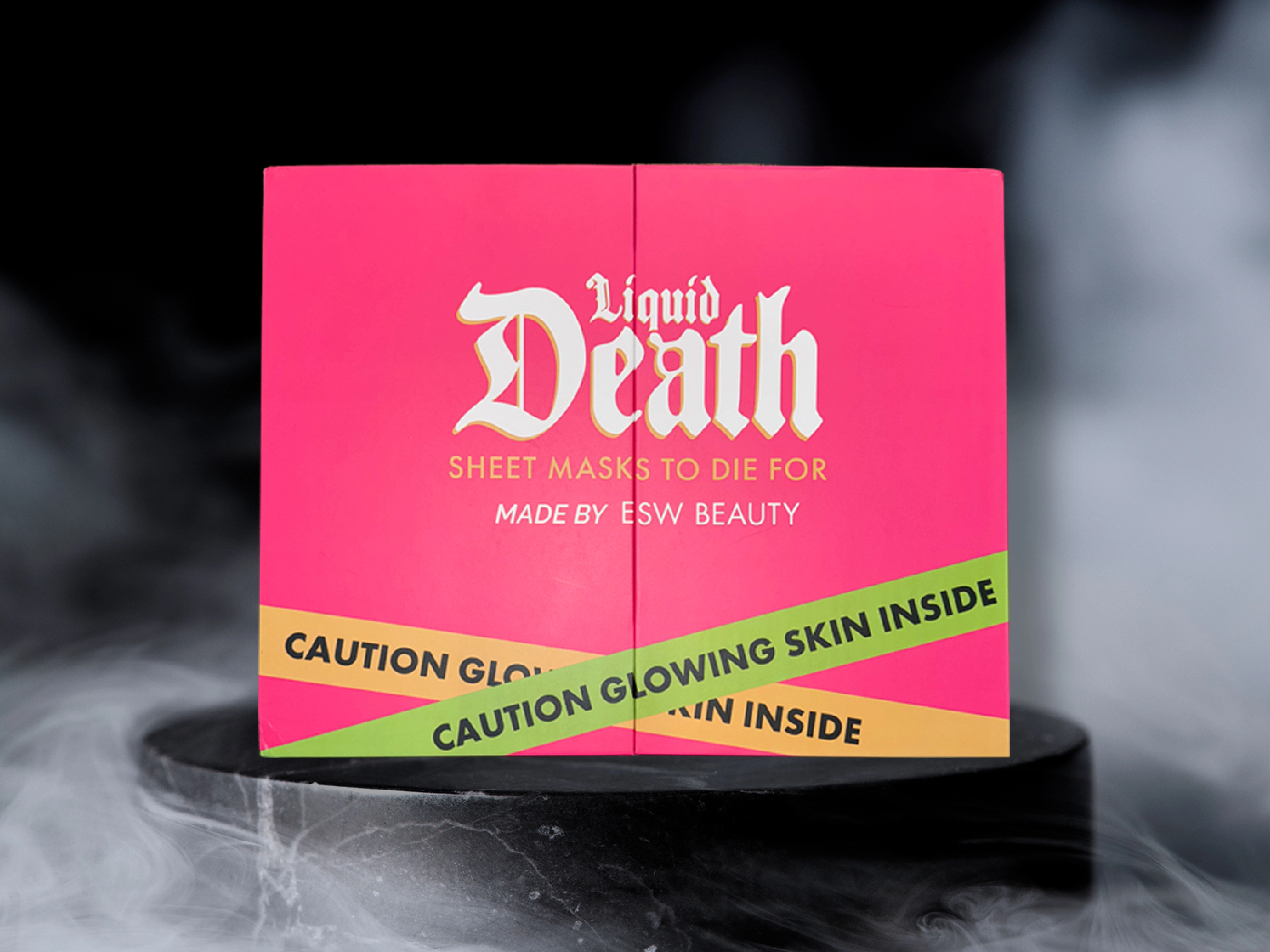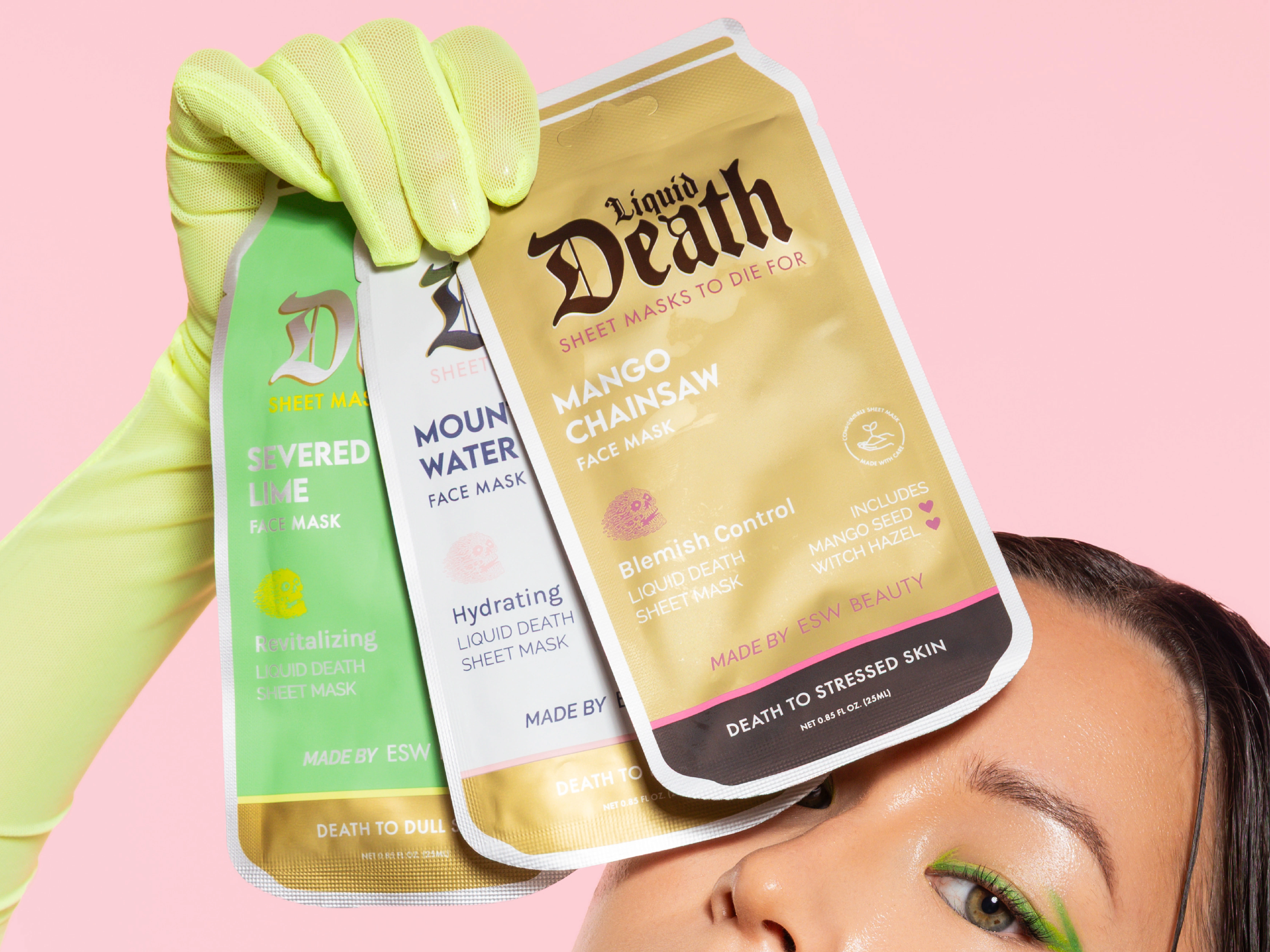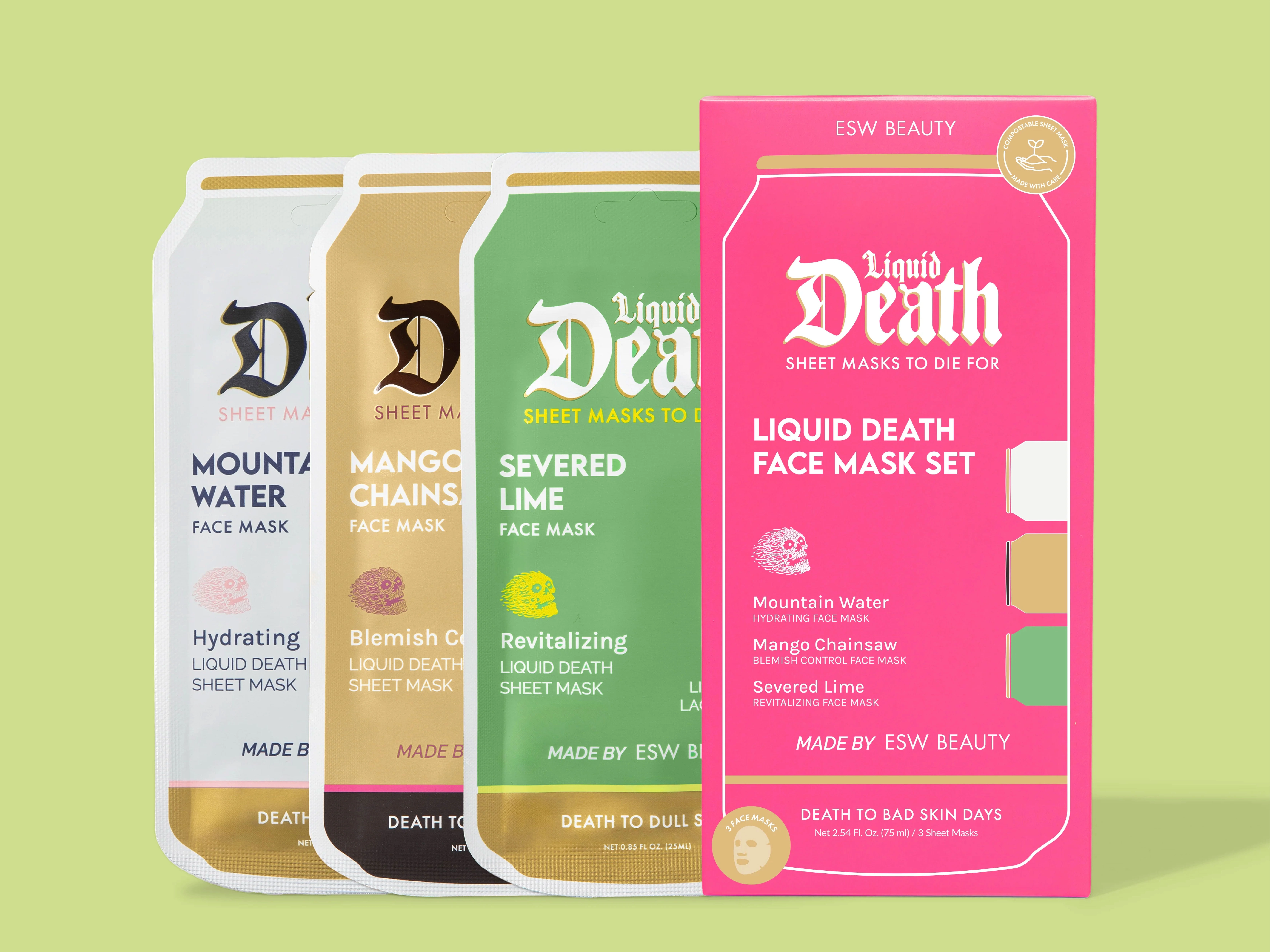 Designed a sheet mask trio merging ESW Beauty and Liquid Death's aesthetics.