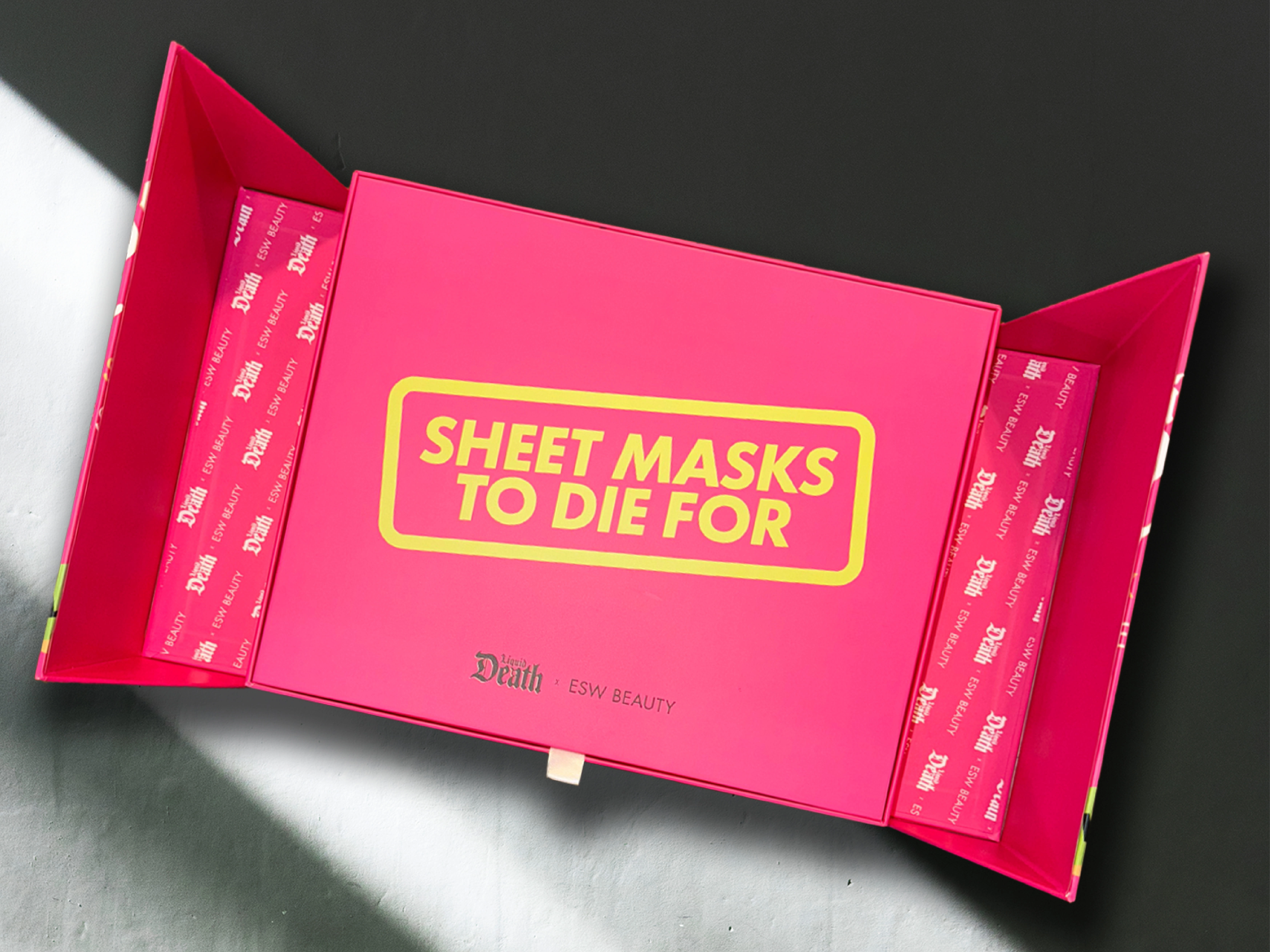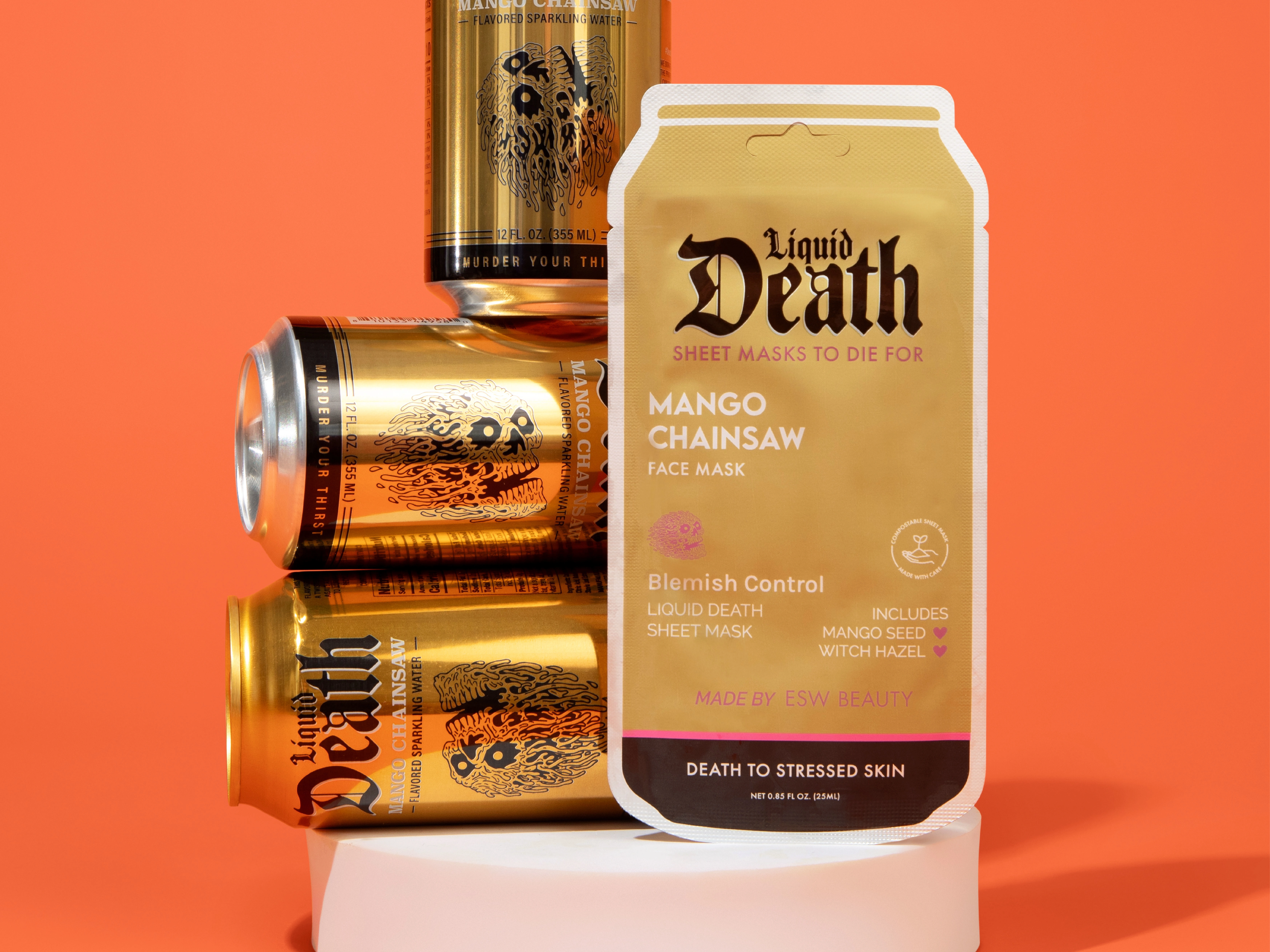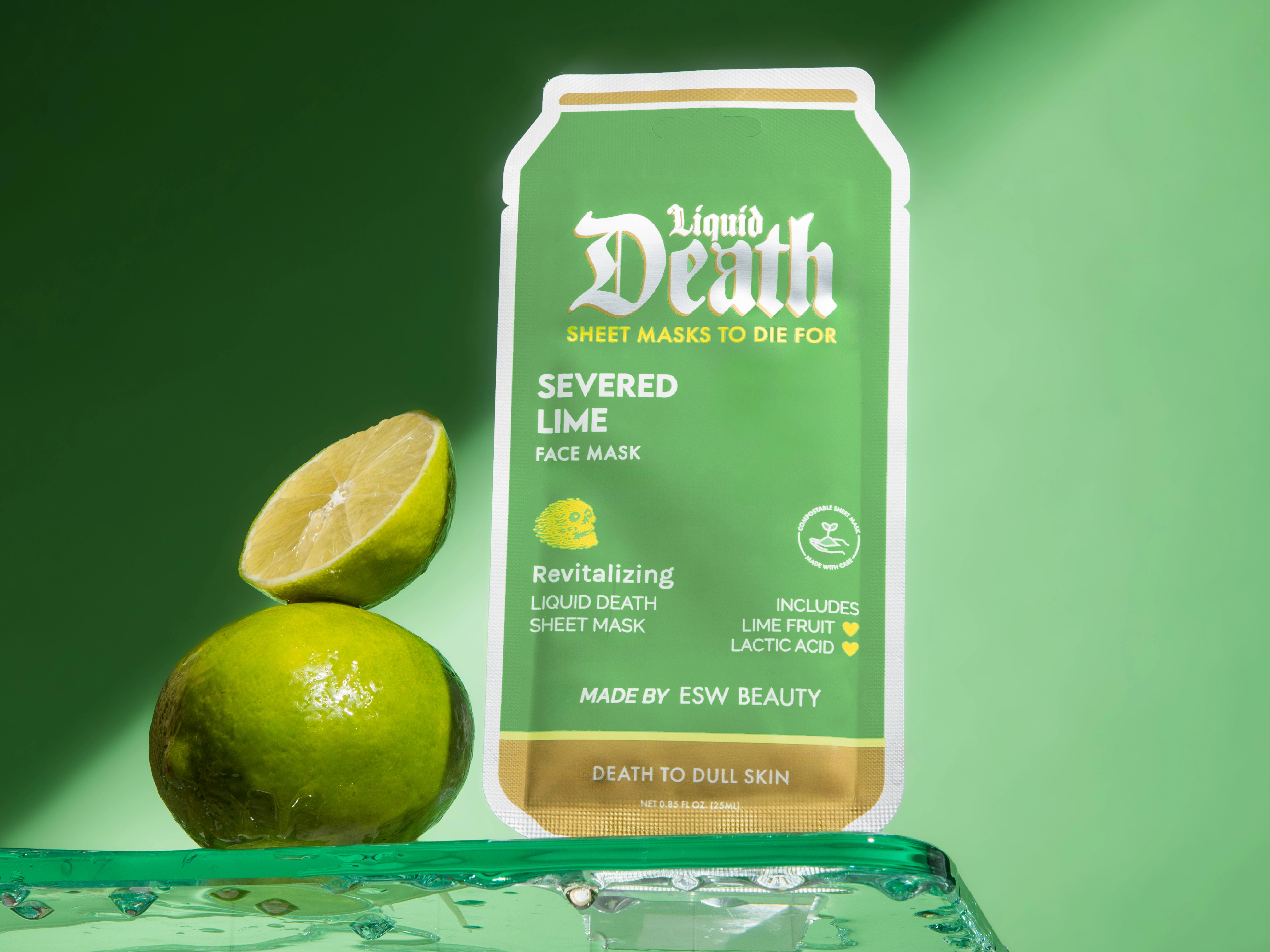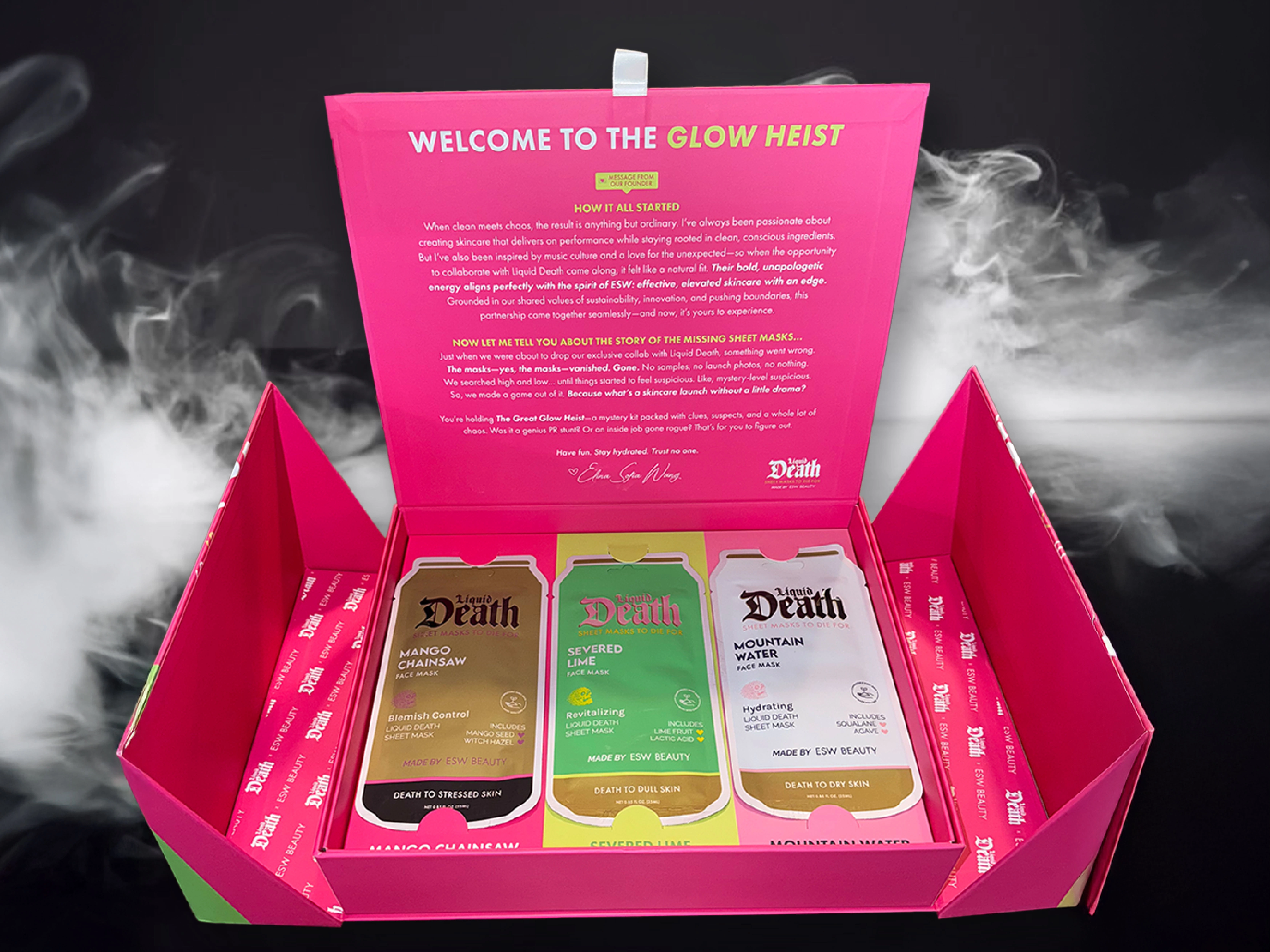 Designed a sheet mask trio merging ESW Beauty and Liquid Death's aesthetics.