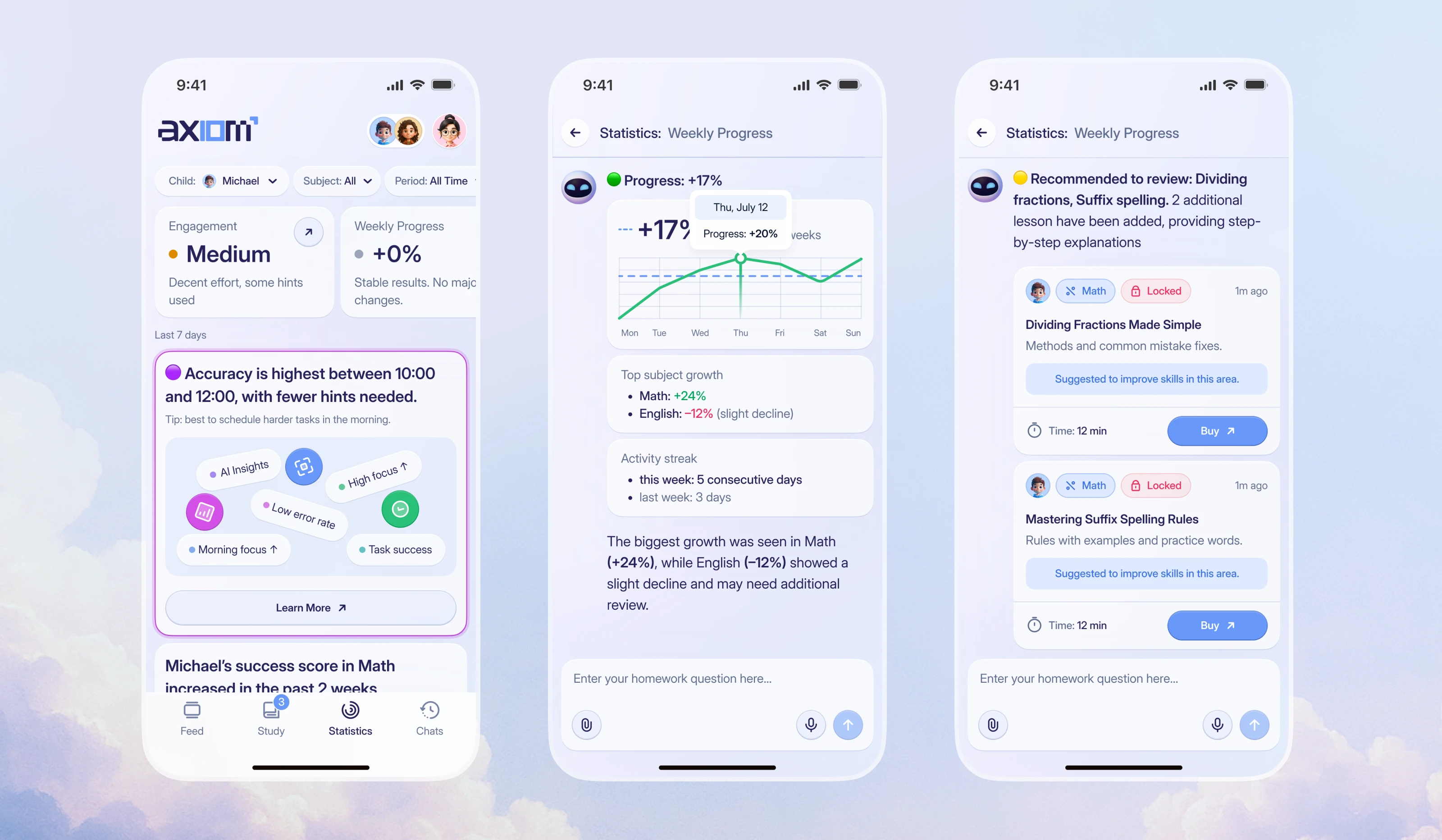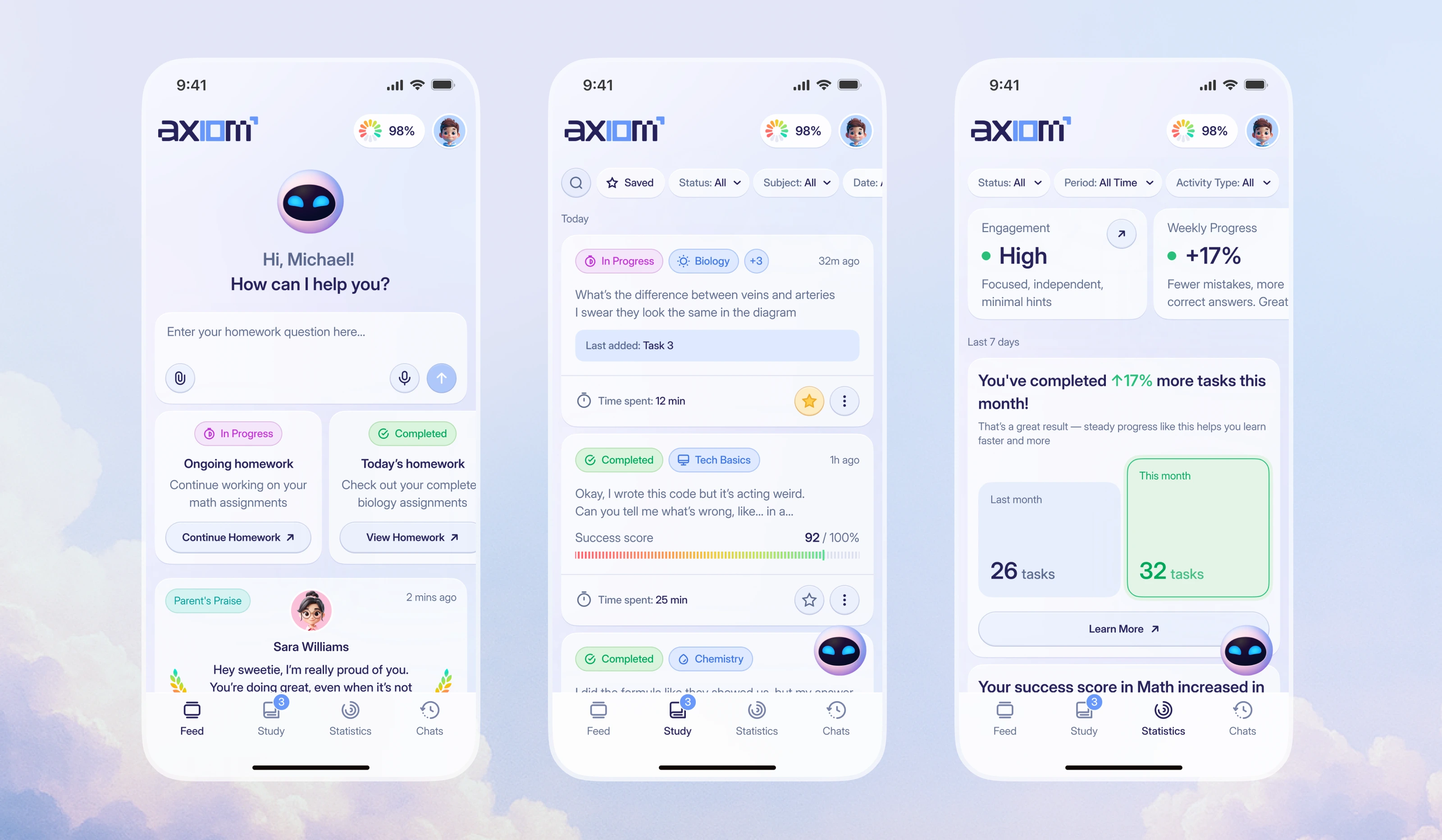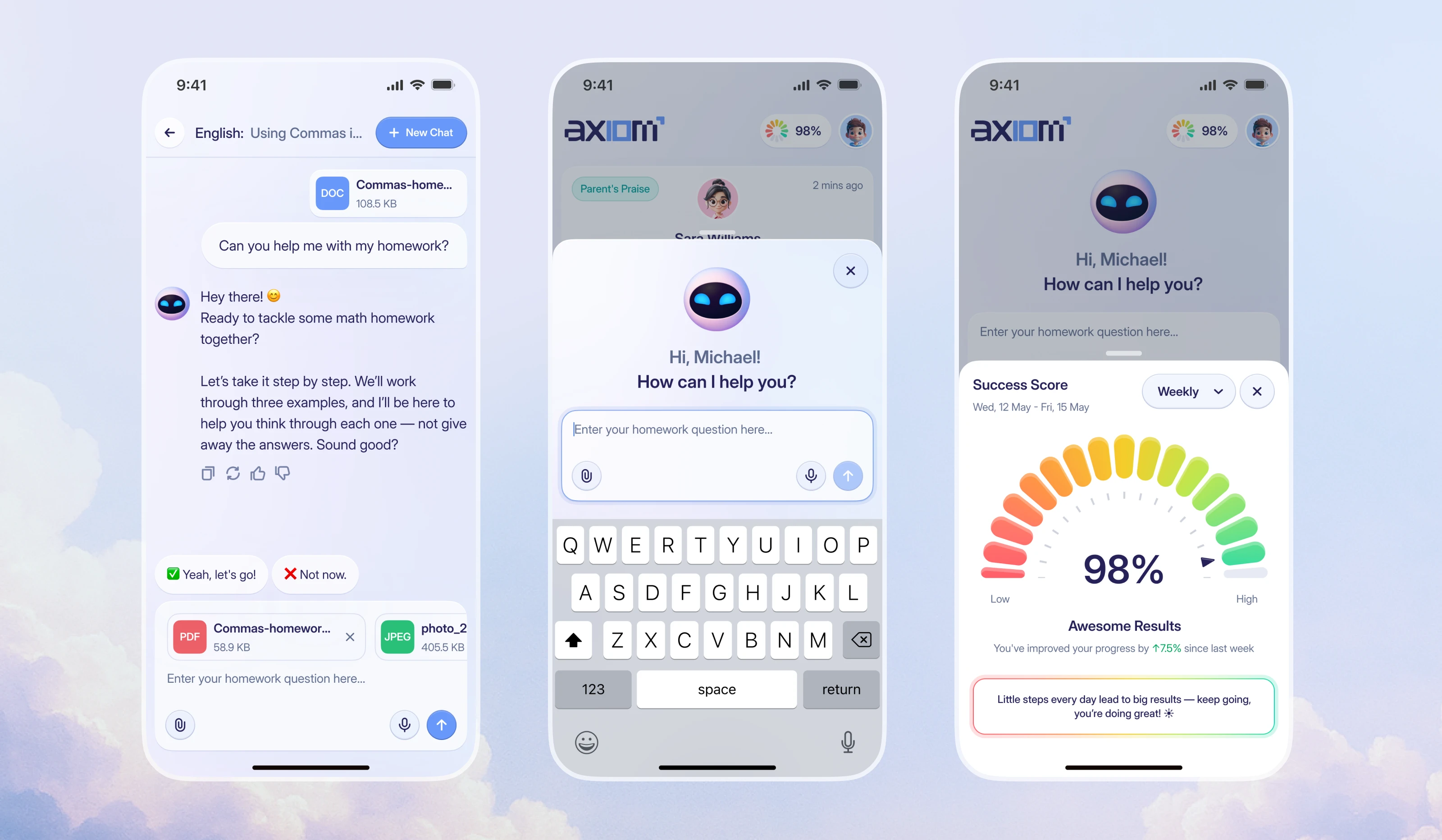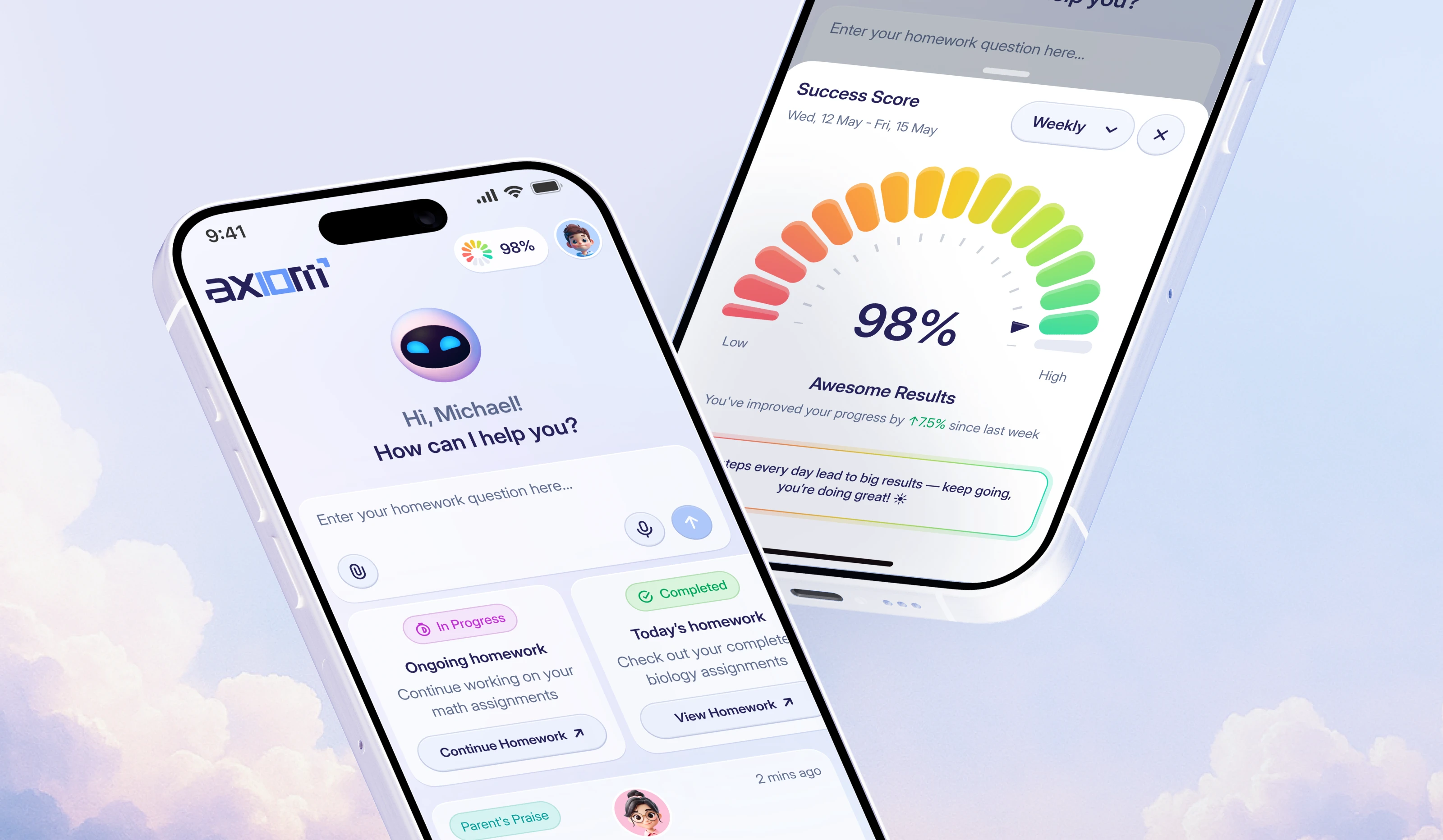 Axiom is an AI-powered app that helps children and parents make learning faster and more effective. Kids can send their homework to a smart AI companion, which provides step-by-step support with solutions. At the same time, parents receive clear, at-a-glance insights into their child’s performance and progress.