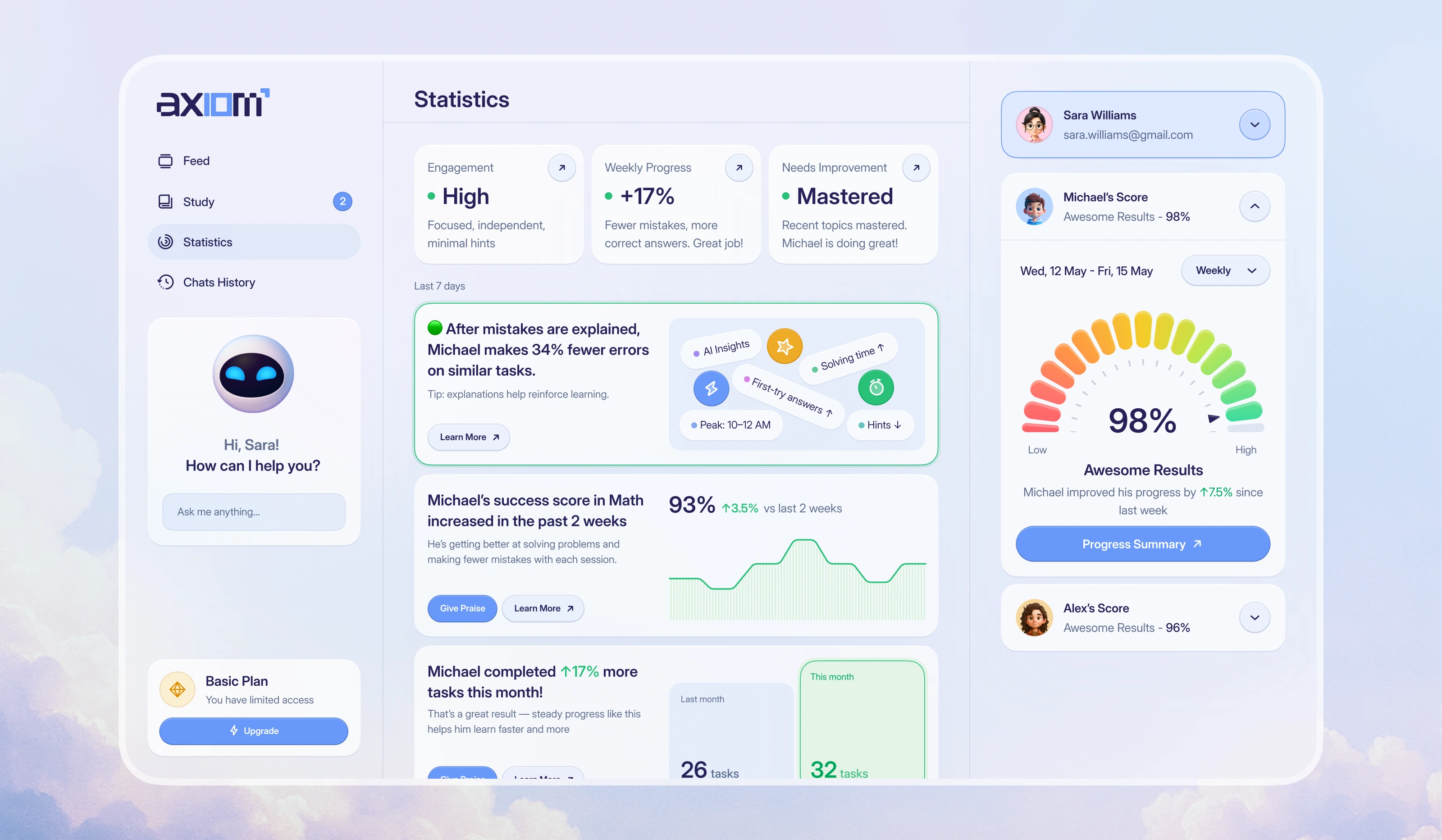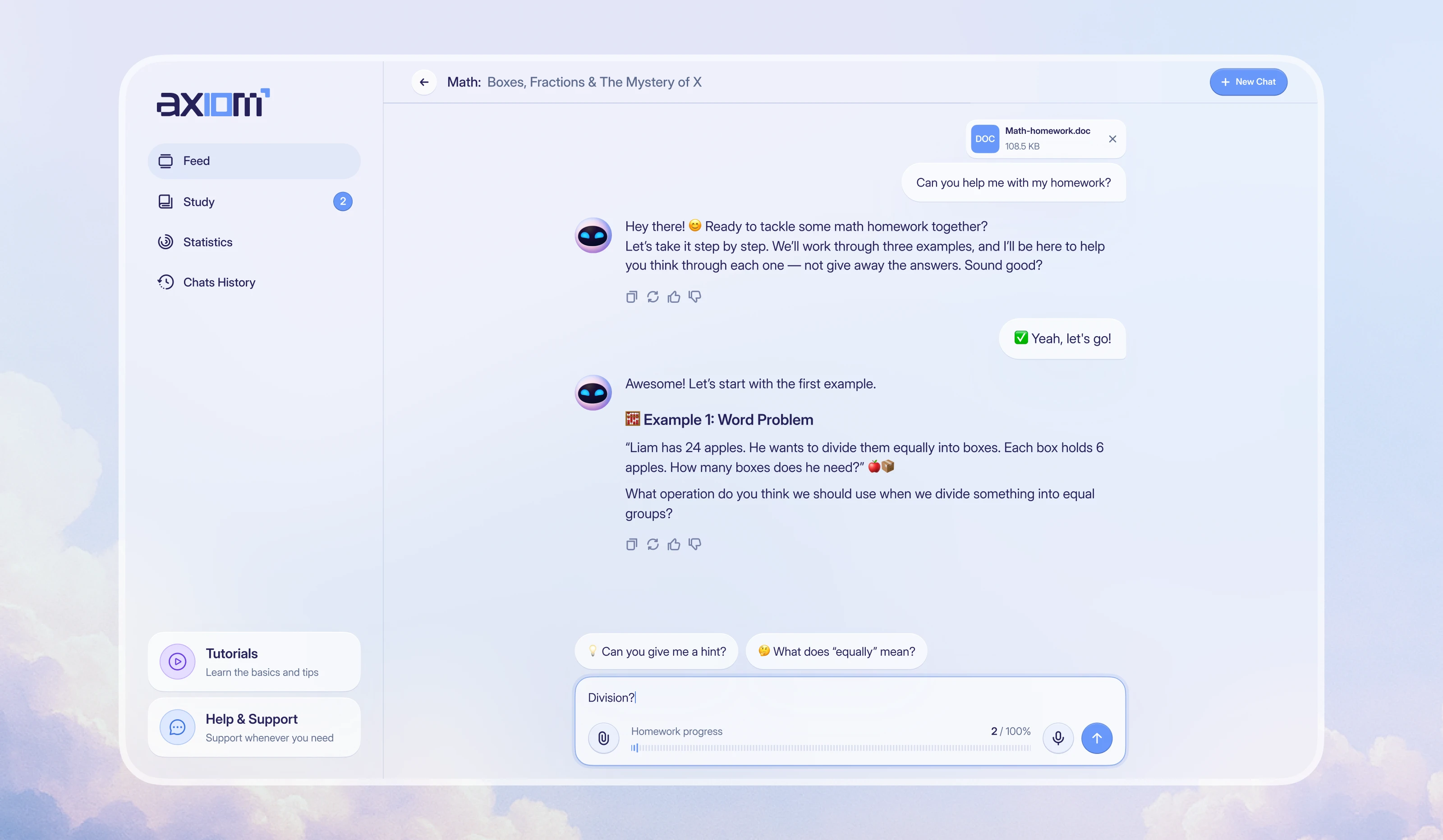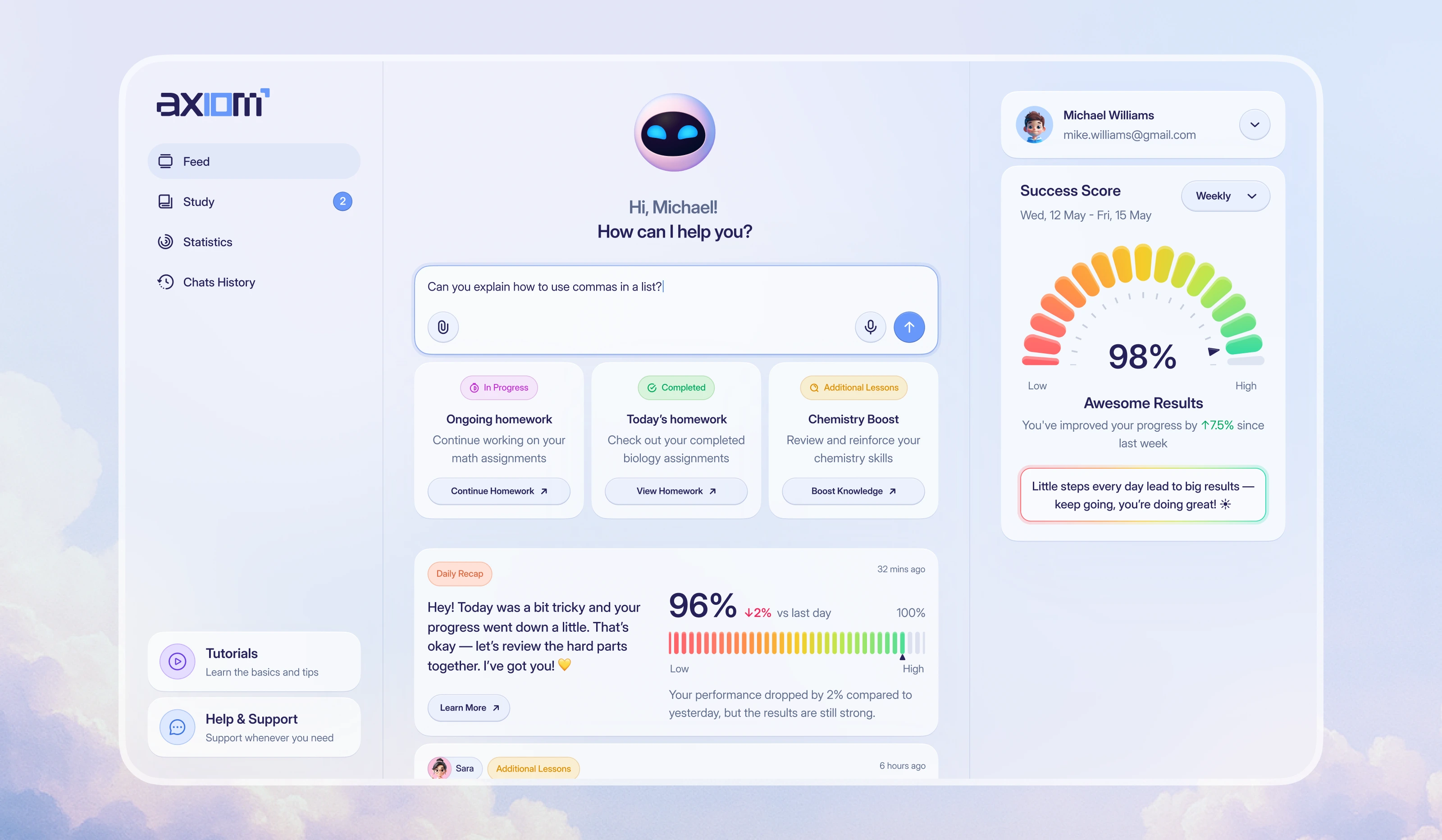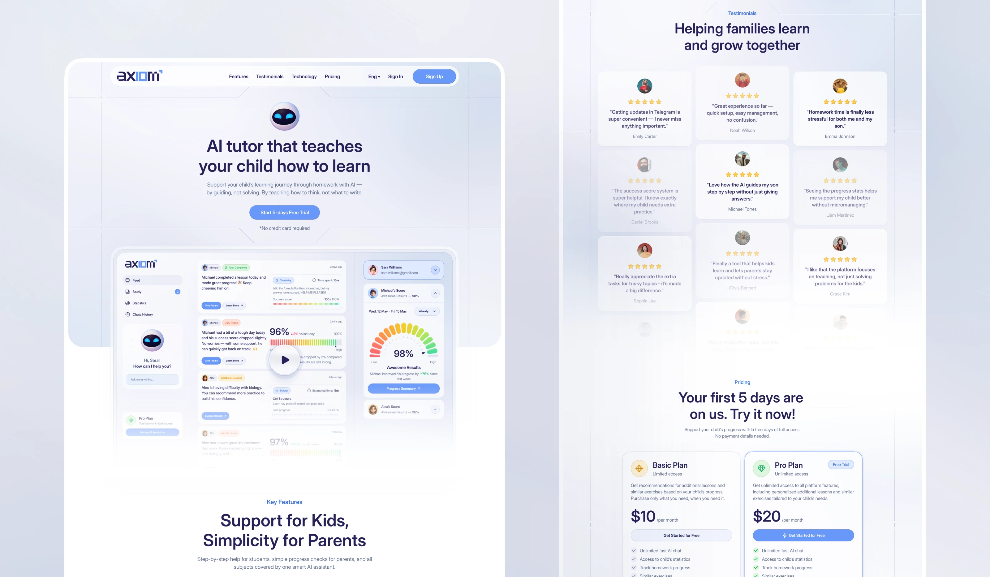 Axiom is an AI-powered app that helps children and parents make learning faster and more effective. Kids can send their homework to a smart AI companion, which provides step-by-step support with solutions. At the same time, parents receive clear, at-a-glance insights into their child’s performance and progress.