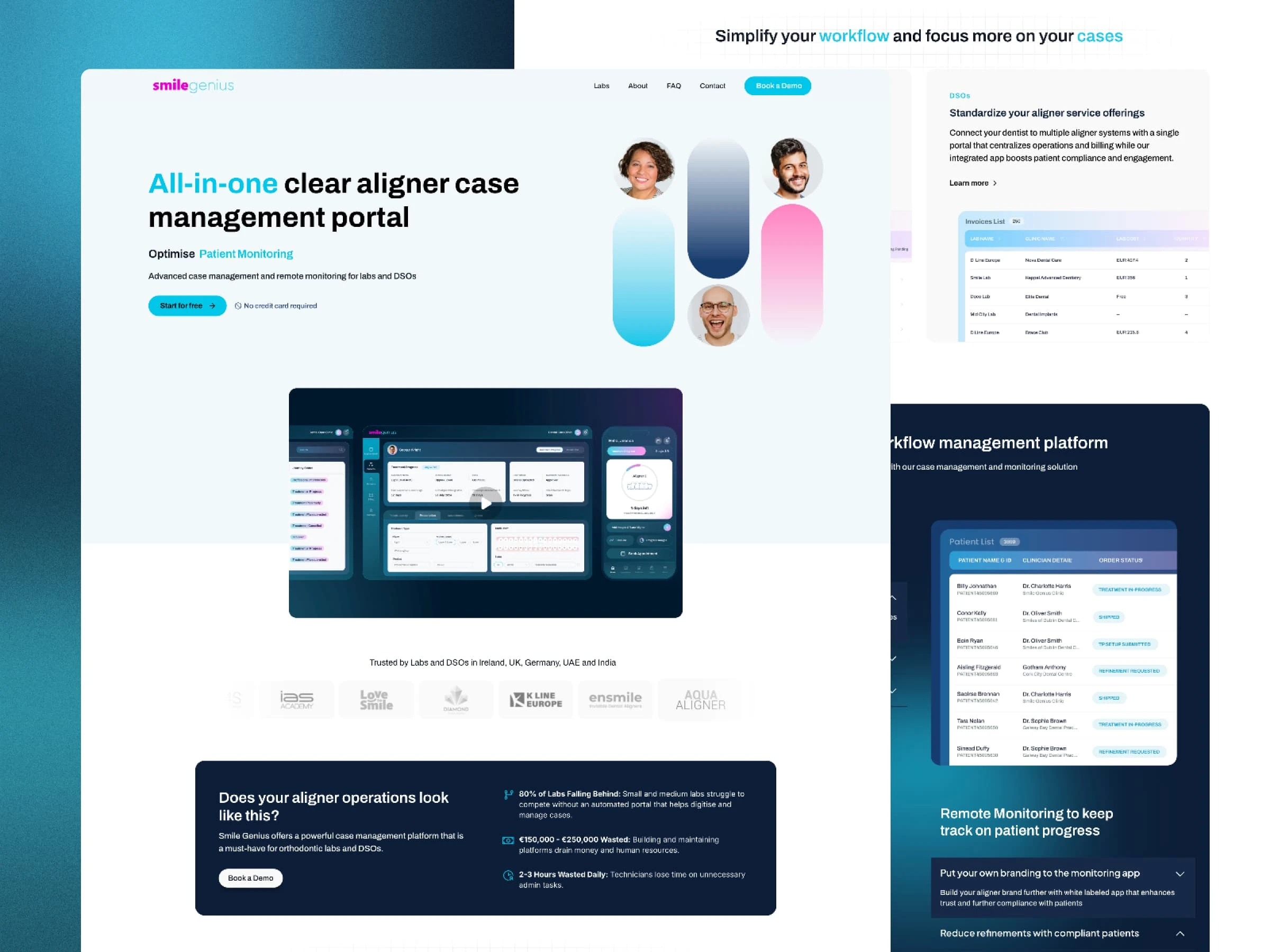 Smile Genius Dental helps orthodontic labs with an all-in-one platform for case management and remote monitoring. I designed wireframes, visual design, development, set up automations with CRM & scheduling tools, and handled WordPress to Framer data migration.