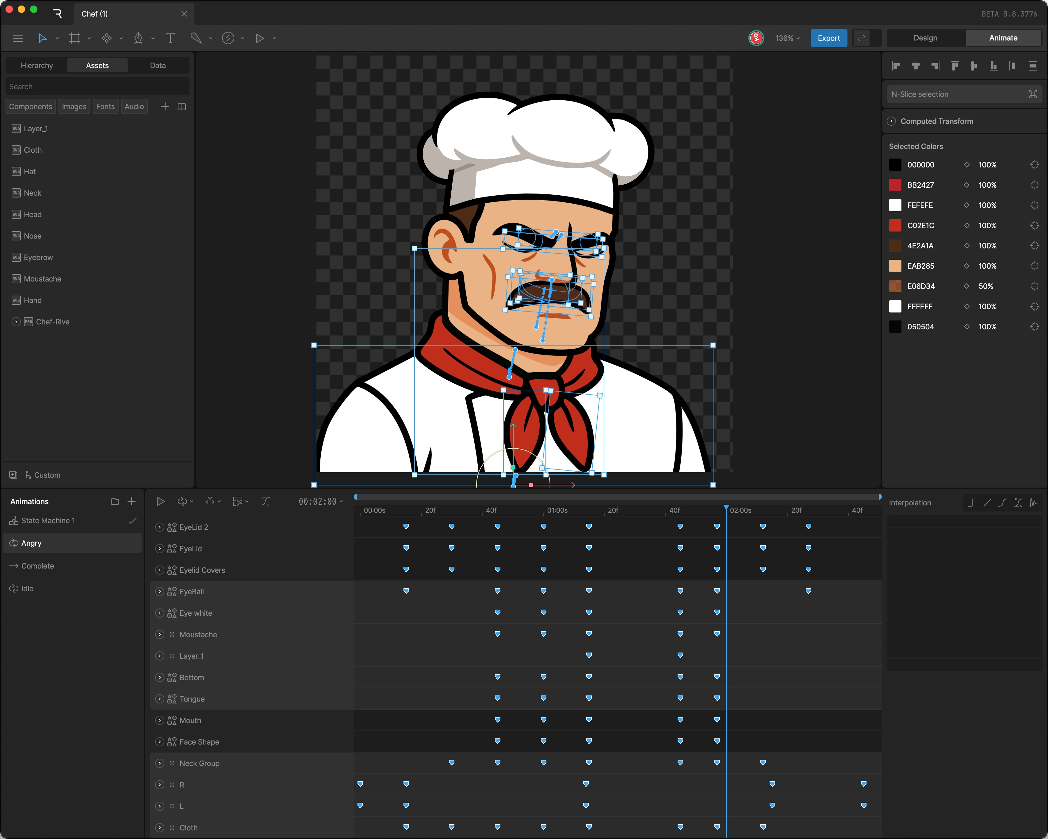 The process began with static character designs provided in Figma. I was responsible for rigging the character and building all its animations from scratch entirely in Rive, optimizing them for the game engine.