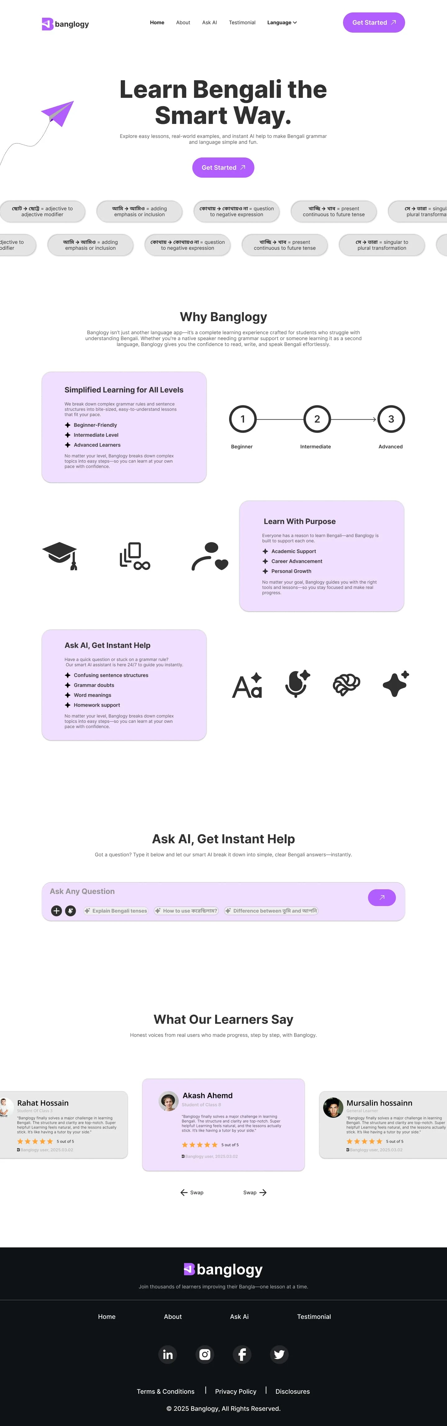 Banglogy is a modern, responsive web platform designed to help students learn Bengali grammar with ease and confidence. From the login experience to personalized learning paths, every screen was crafted to ensure simplicity, accessibility, and purpose-driven design.