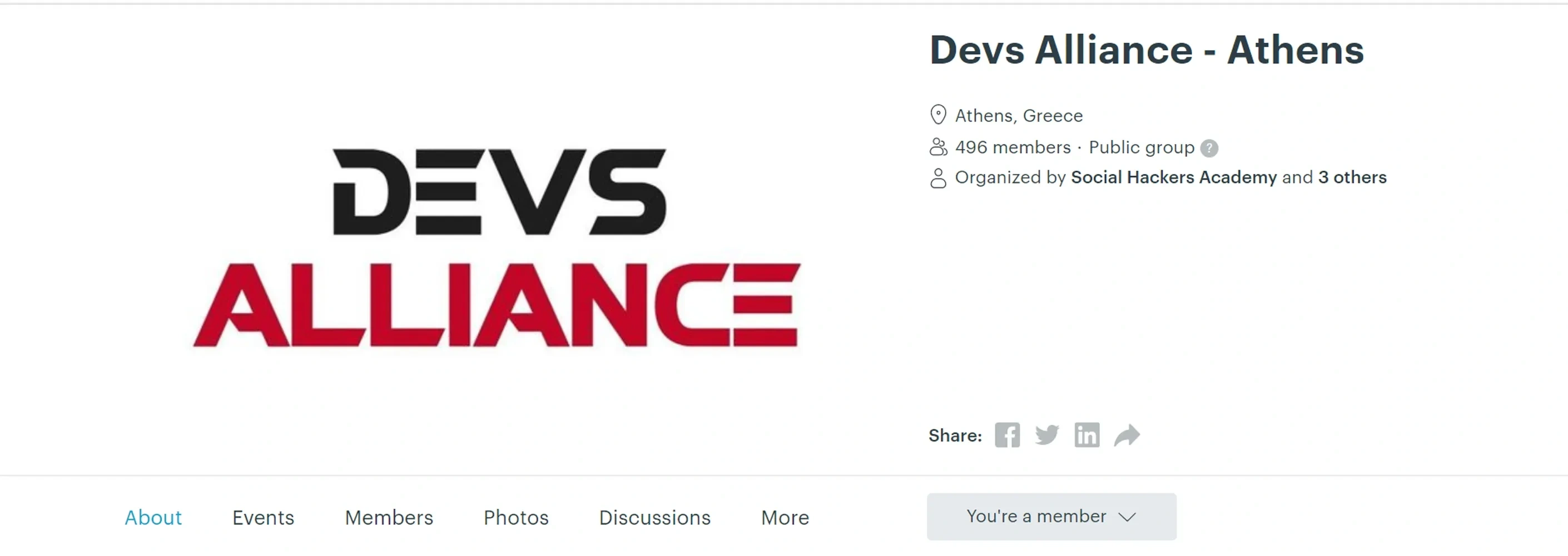 Social Hackers Academy managed a Meetup group called “Devs Alliance,” which aimed to create a hub for students and developers in Athens to network with potential employers and partners.