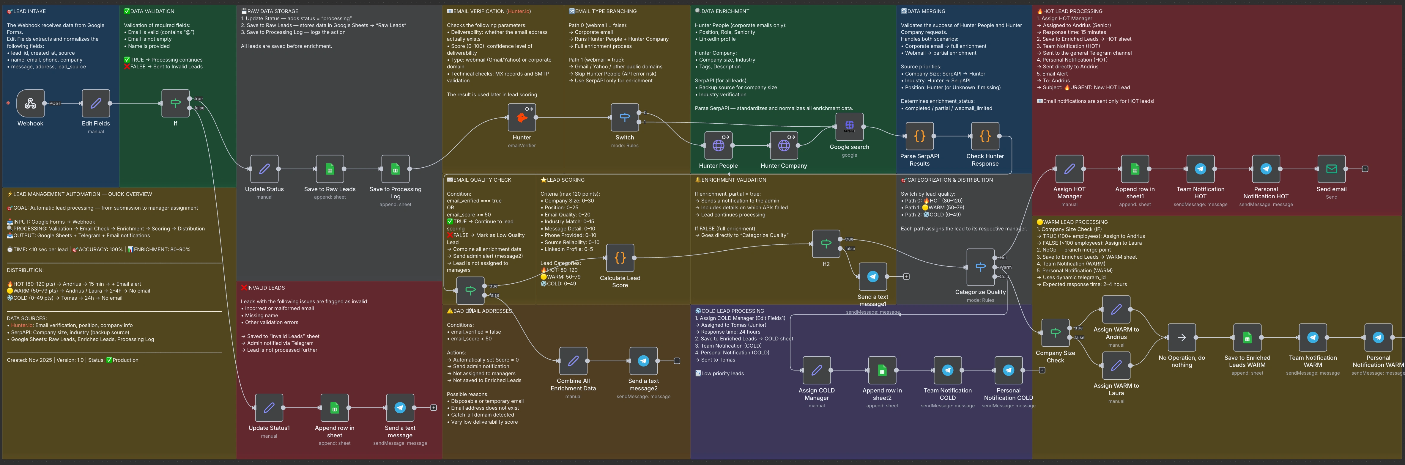 Smart lead automation built with n8n: each client request is validated, enriched with data, scored, and instantly assigned to the right manager — all in just seconds. No code. No delays.