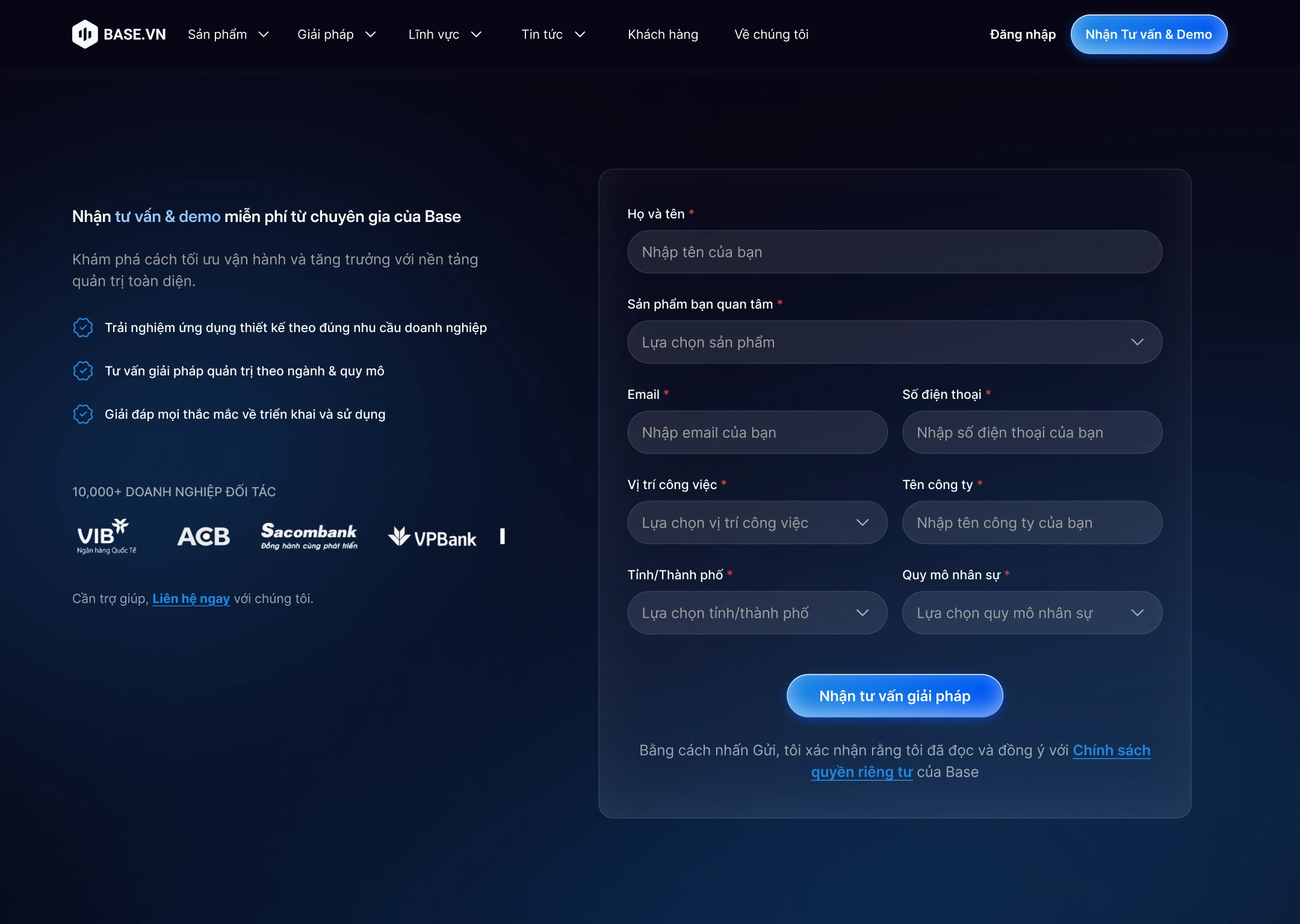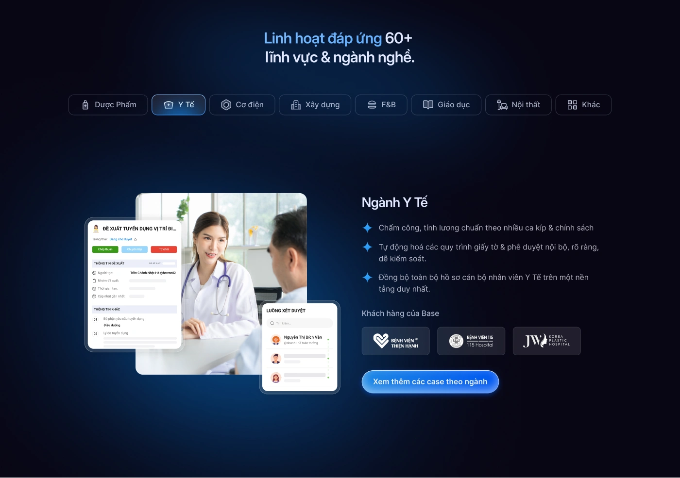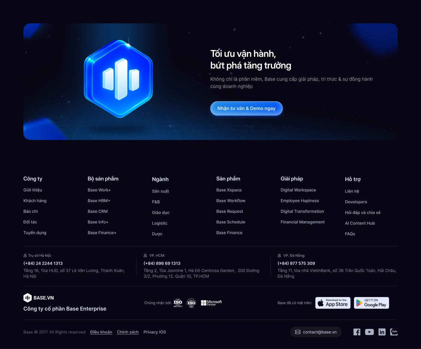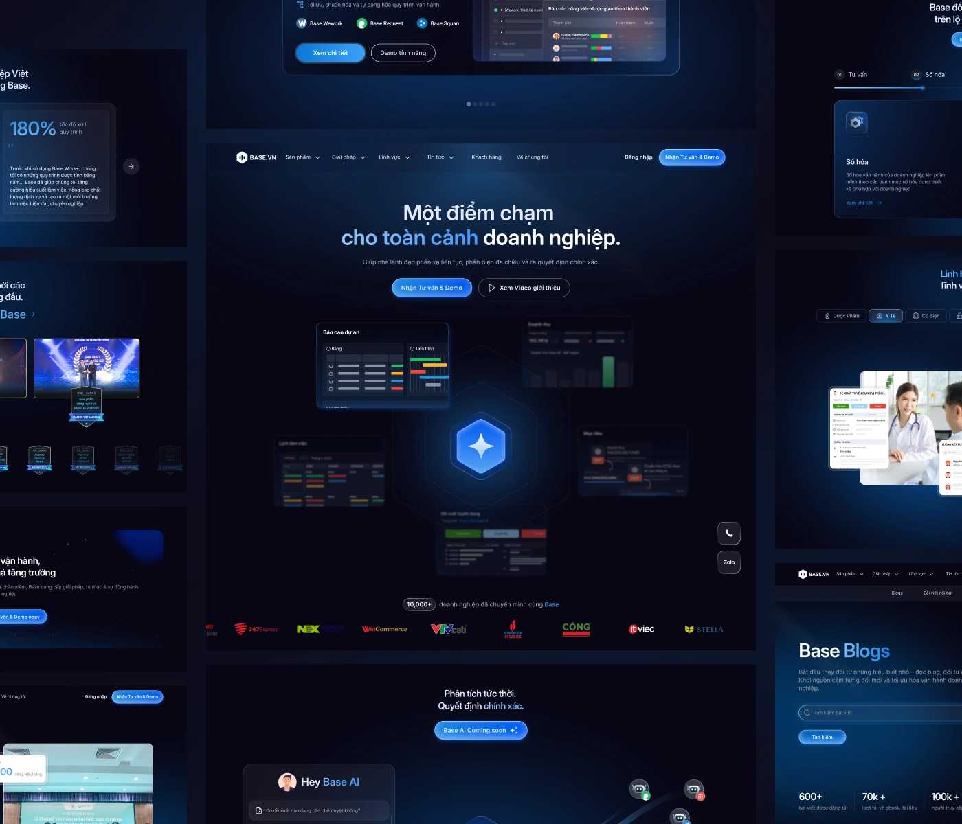 Base.vn’s strategy into a functional digital platform by designing 58 responsive screens across their core product ecosystem, including Work+, HRM+, and Finance. We then executed the Webflow development, integrating CRM APIs and analytics tracking while maintaining a strict Client-first style guide and purposeful animations.