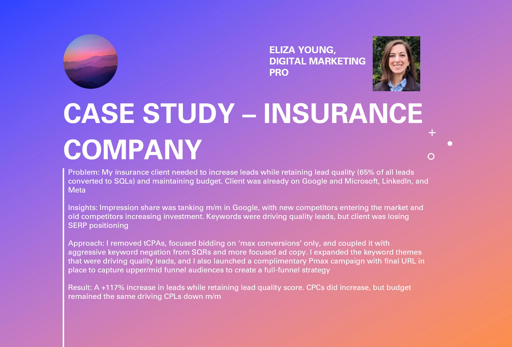 Needs: Increase lead volume + retain quality Action: Removed low tCPAs to get back market share. Optimized keywords, + added Pmax to drive upper/mid funnel