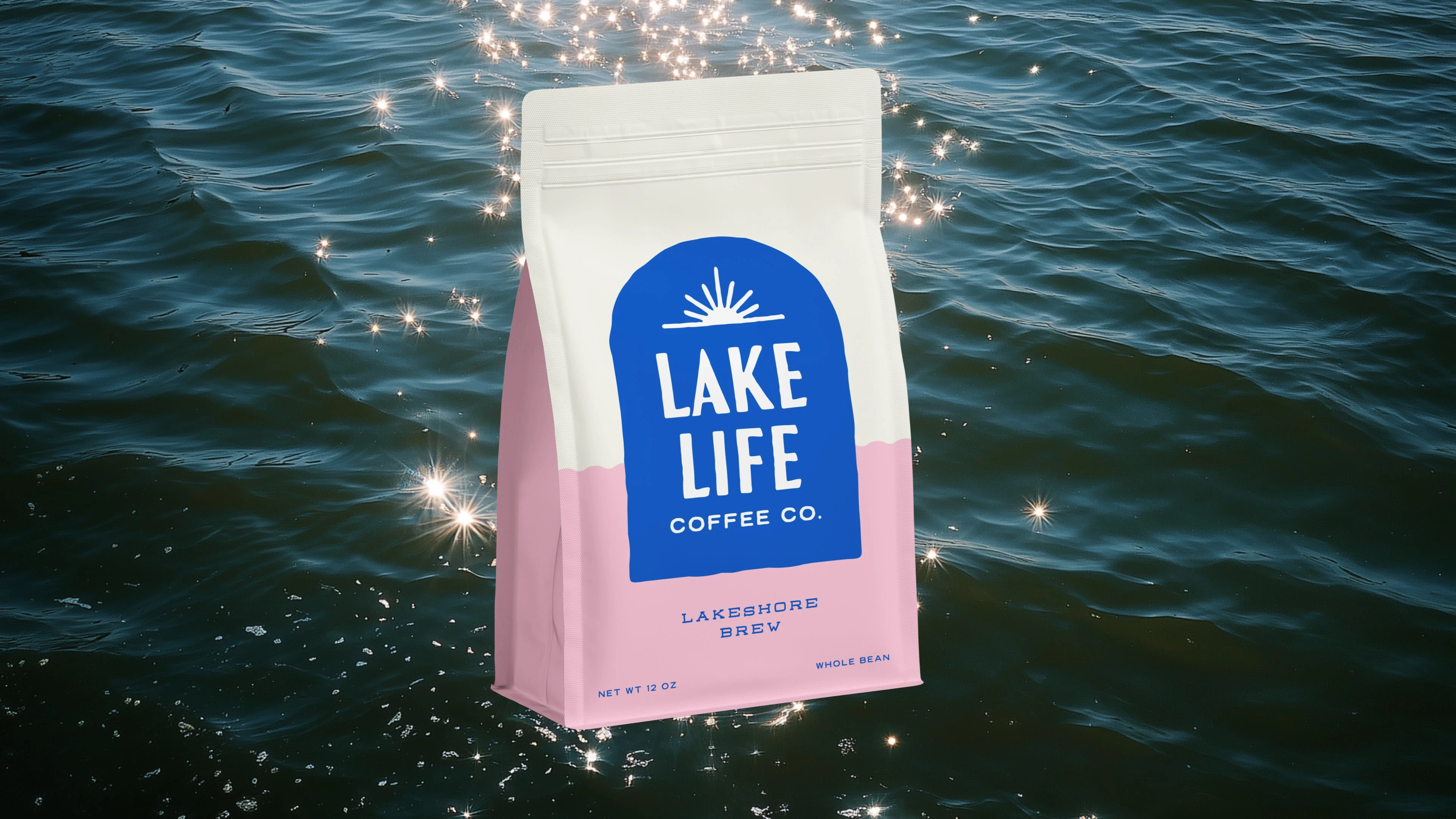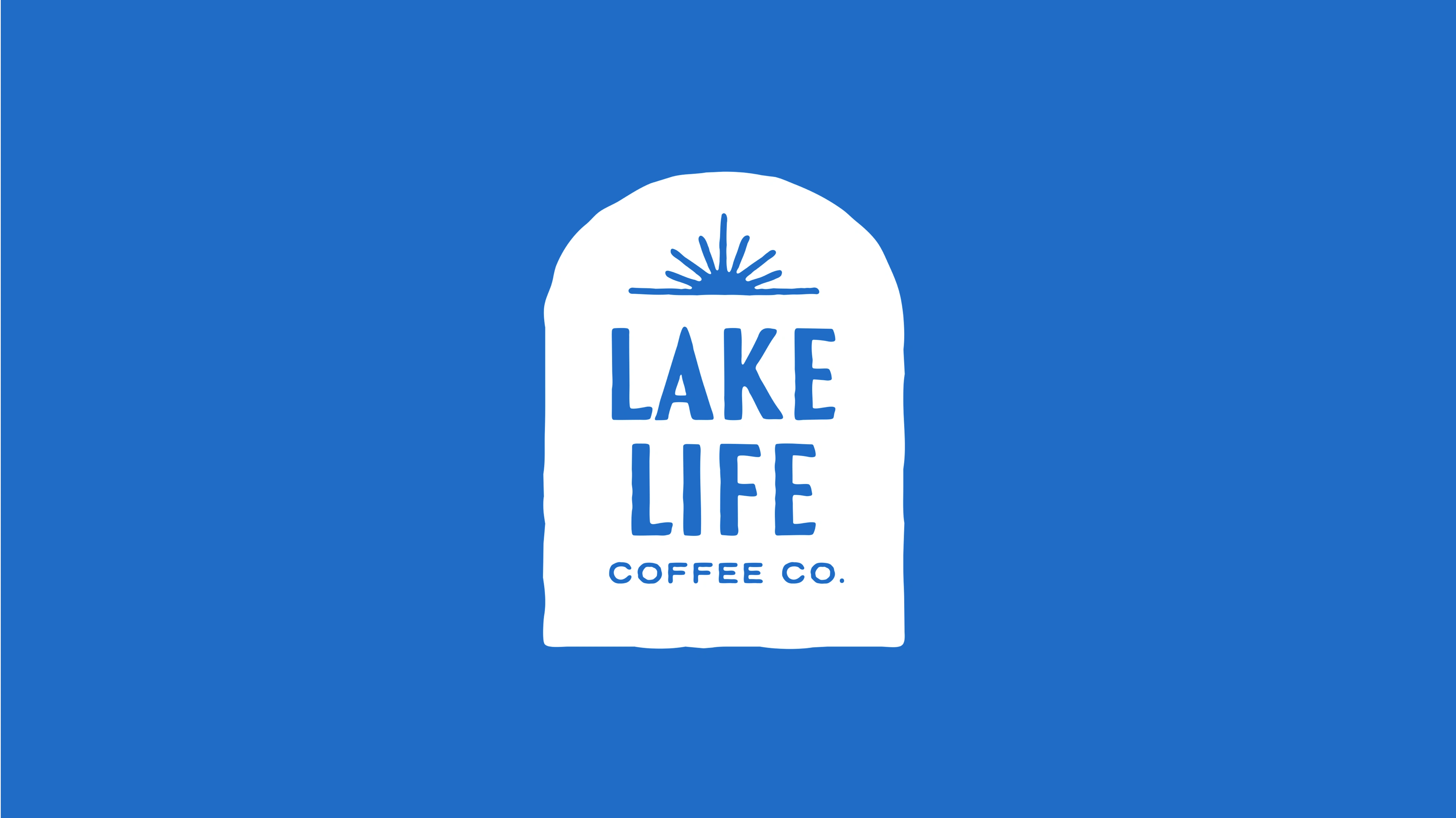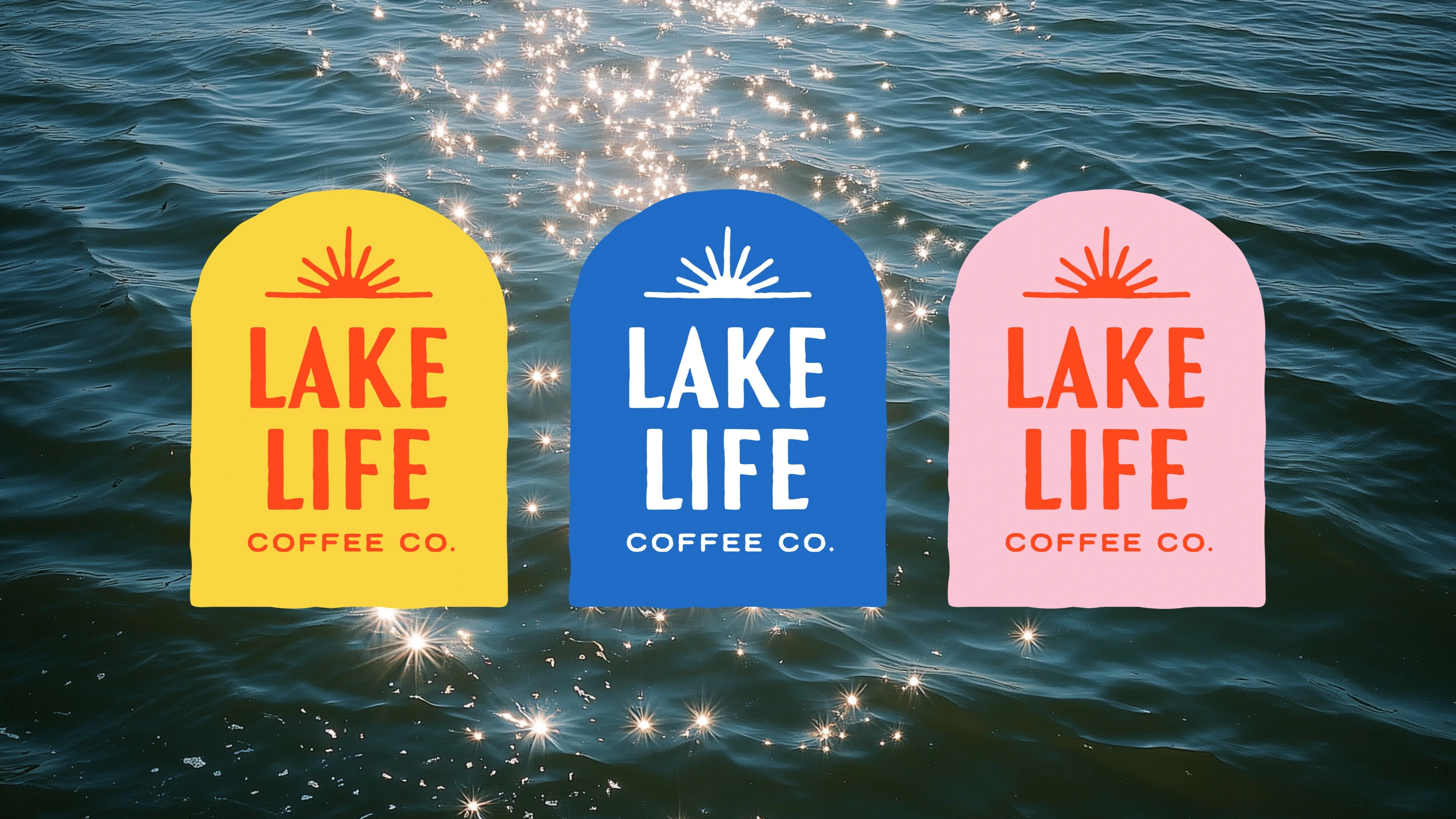 A nostalgic yet modern coffee brand identity with a sun-arch motif and bright palette, evoking the relaxed joy of lake living.