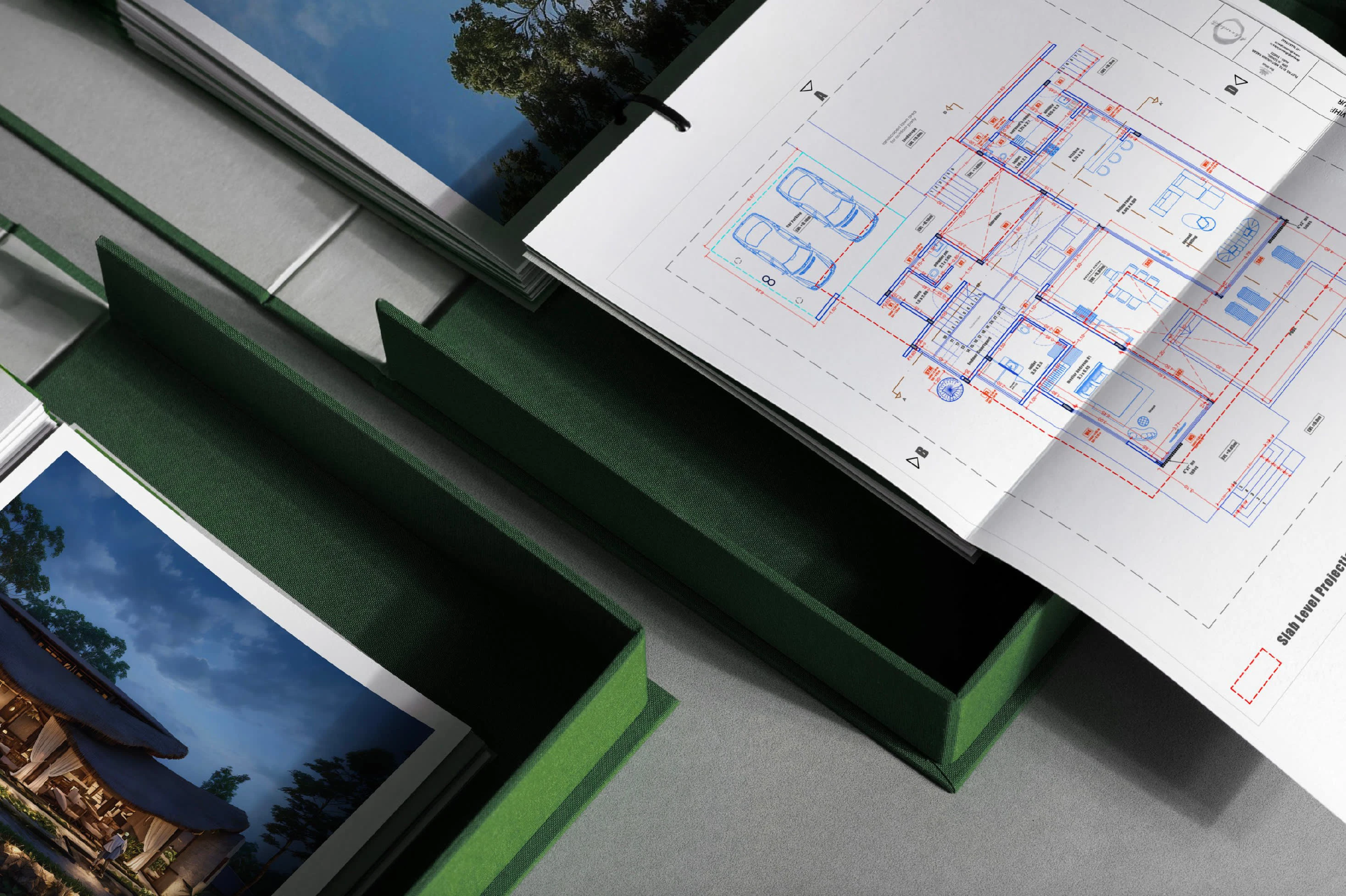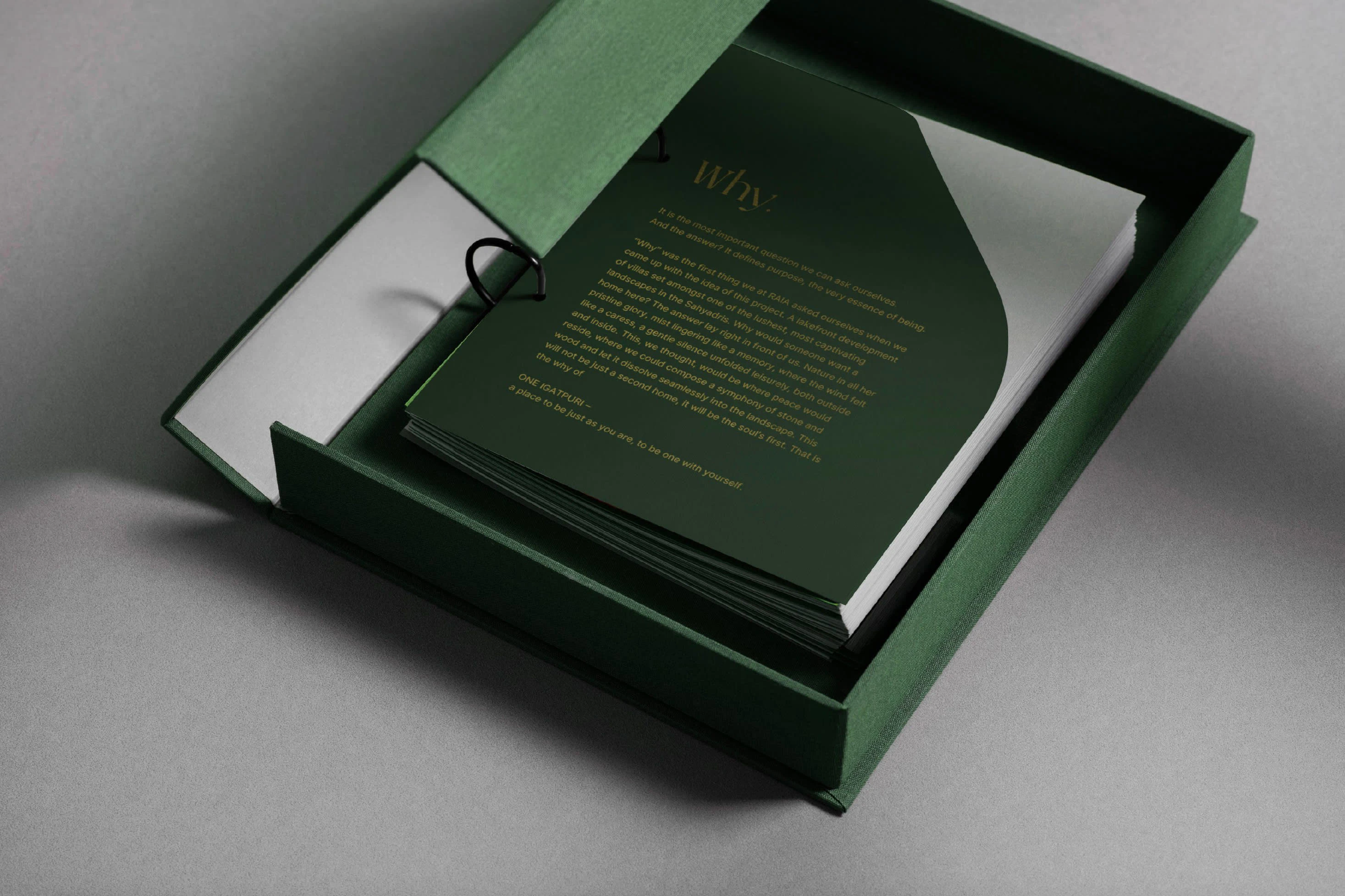 The "Unboxing" Sales Kit: We conceptualized the sales brochure not as a throwaway pamphlet, but as a rigid "Keepsake Box." This tactile experience turns the sales collateral into a physical asset, mirroring the permanence and value of the property itself.