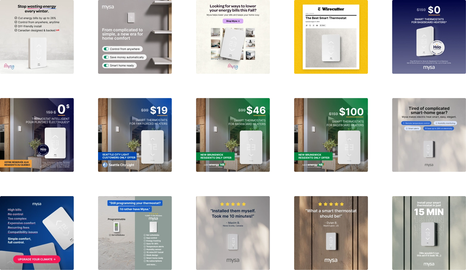 A library of 16 polished, ready-to-run animated ads optimized for Meta's key placements, giving Mysa a versatile content set for their paid campaigns.