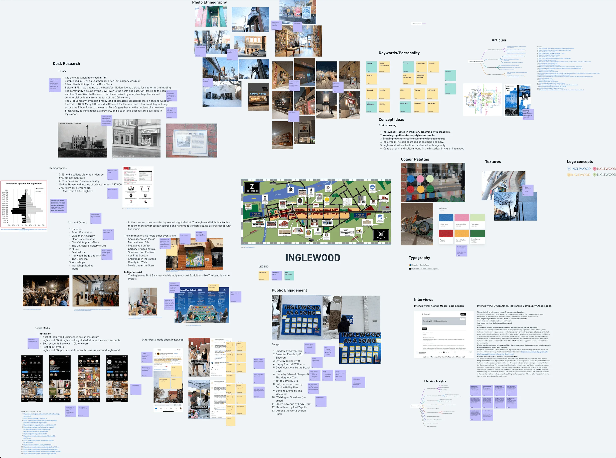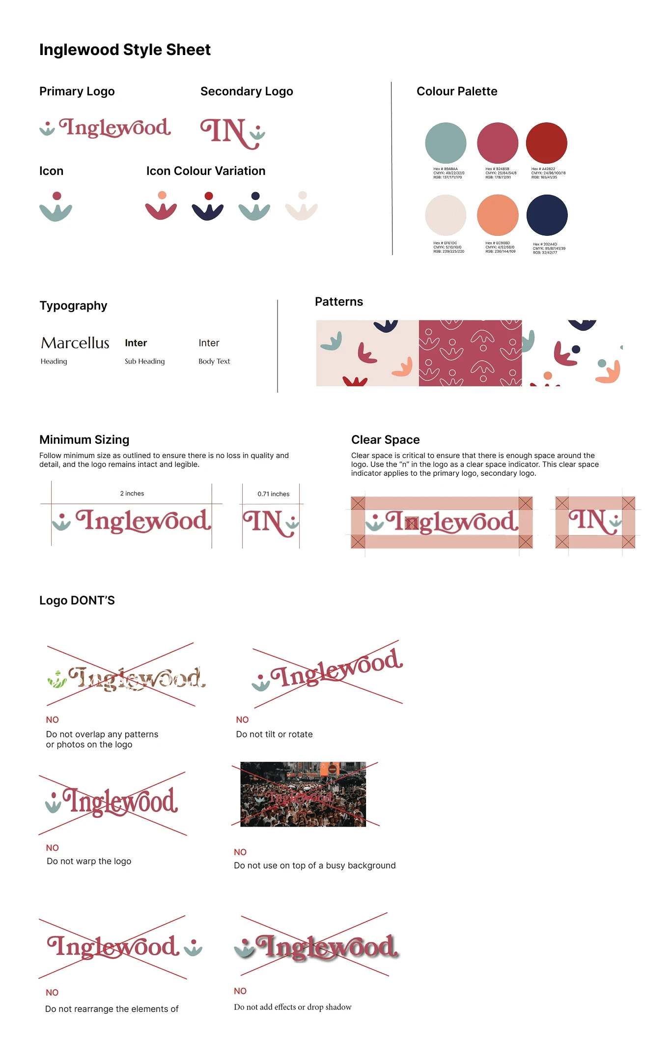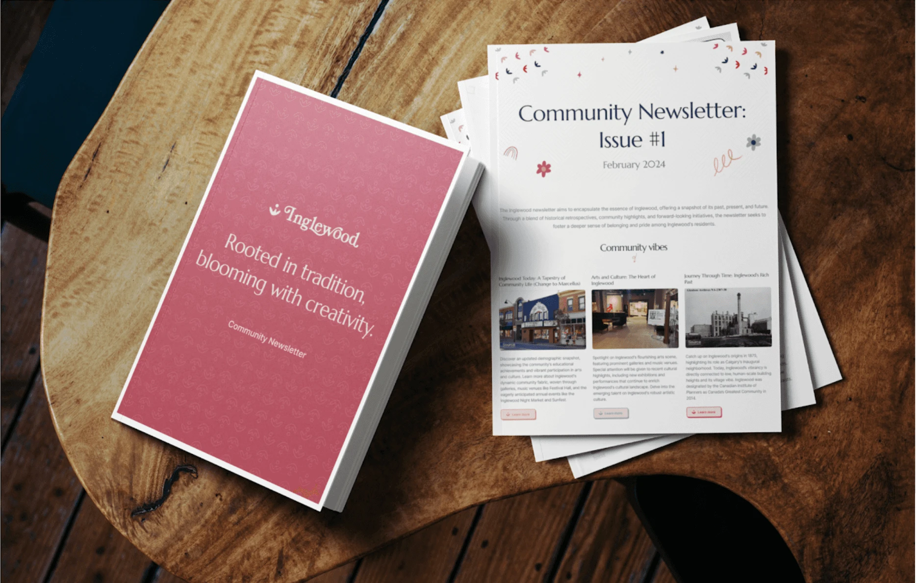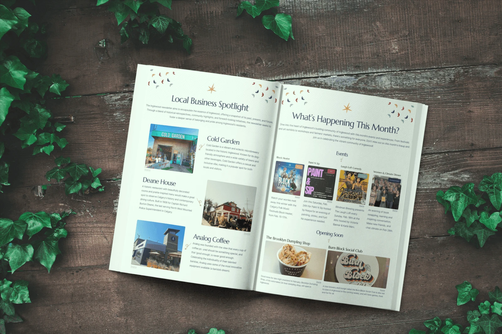 Our community newsletter incorporates all our brand elements, such as our logo, colours, icons, and patterns, to maintain a cohesive visual identity. It features articles about Inglewood's art and history, a local business spotlight, a map highlighting notable areas, and a collection of upcoming events to encourage community engagement. The recommended events align with our brand's concept statement and cover music, art, comedy, and environmentalism, all of which are integral to our brand identity.
