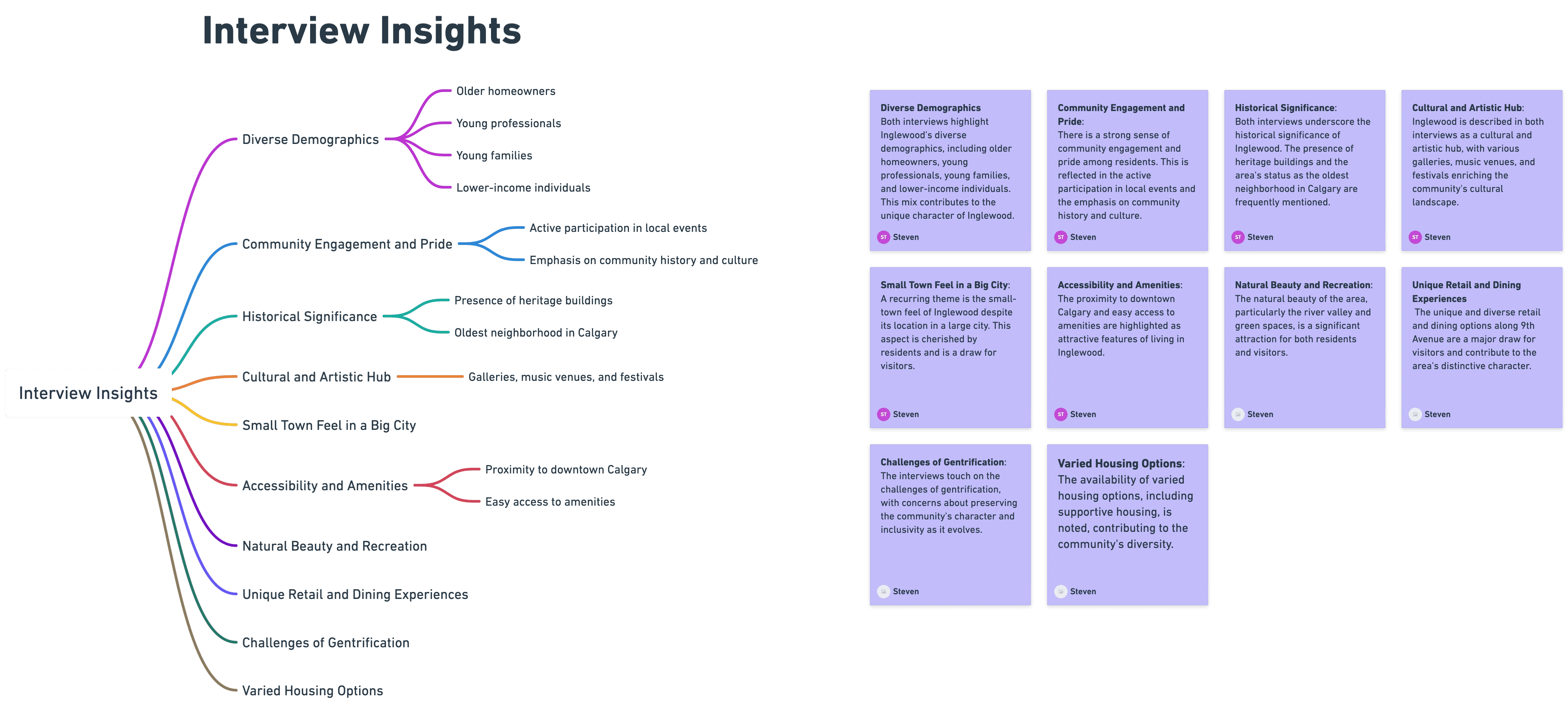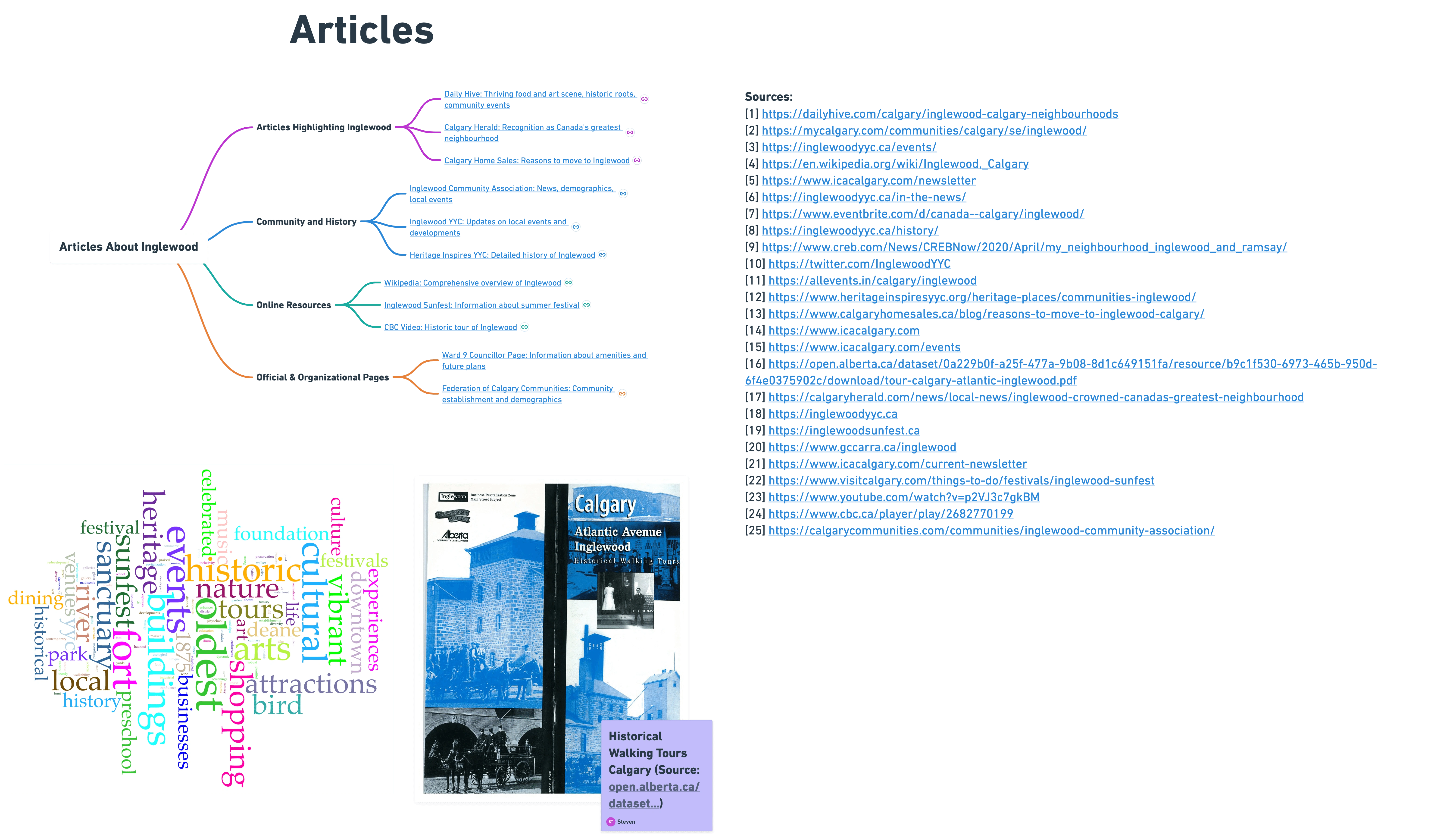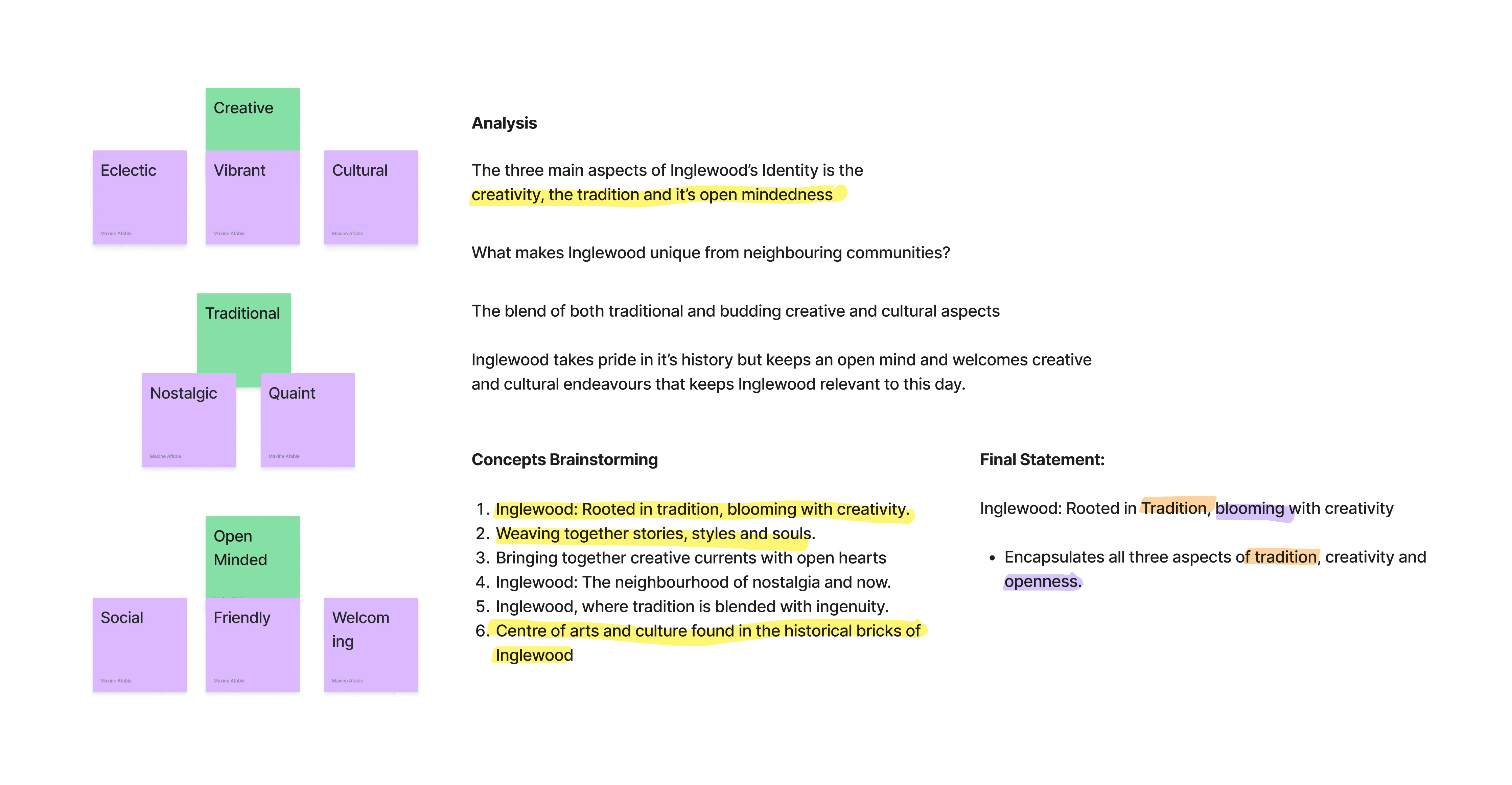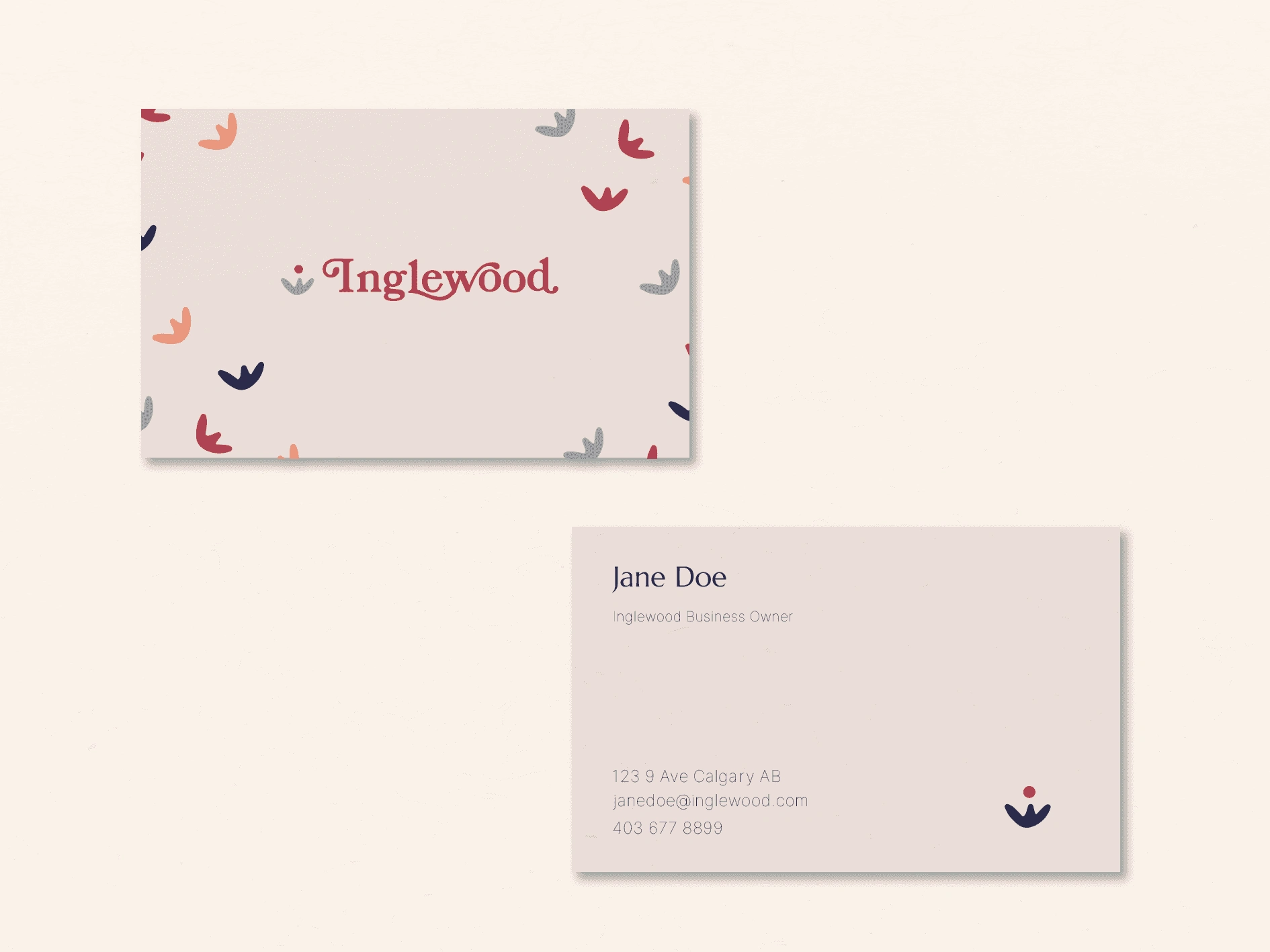 Our community newsletter incorporates all our brand elements, such as our logo, colours, icons, and patterns, to maintain a cohesive visual identity. It features articles about Inglewood's art and history, a local business spotlight, a map highlighting notable areas, and a collection of upcoming events to encourage community engagement. The recommended events align with our brand's concept statement and cover music, art, comedy, and environmentalism, all of which are integral to our brand identity.
