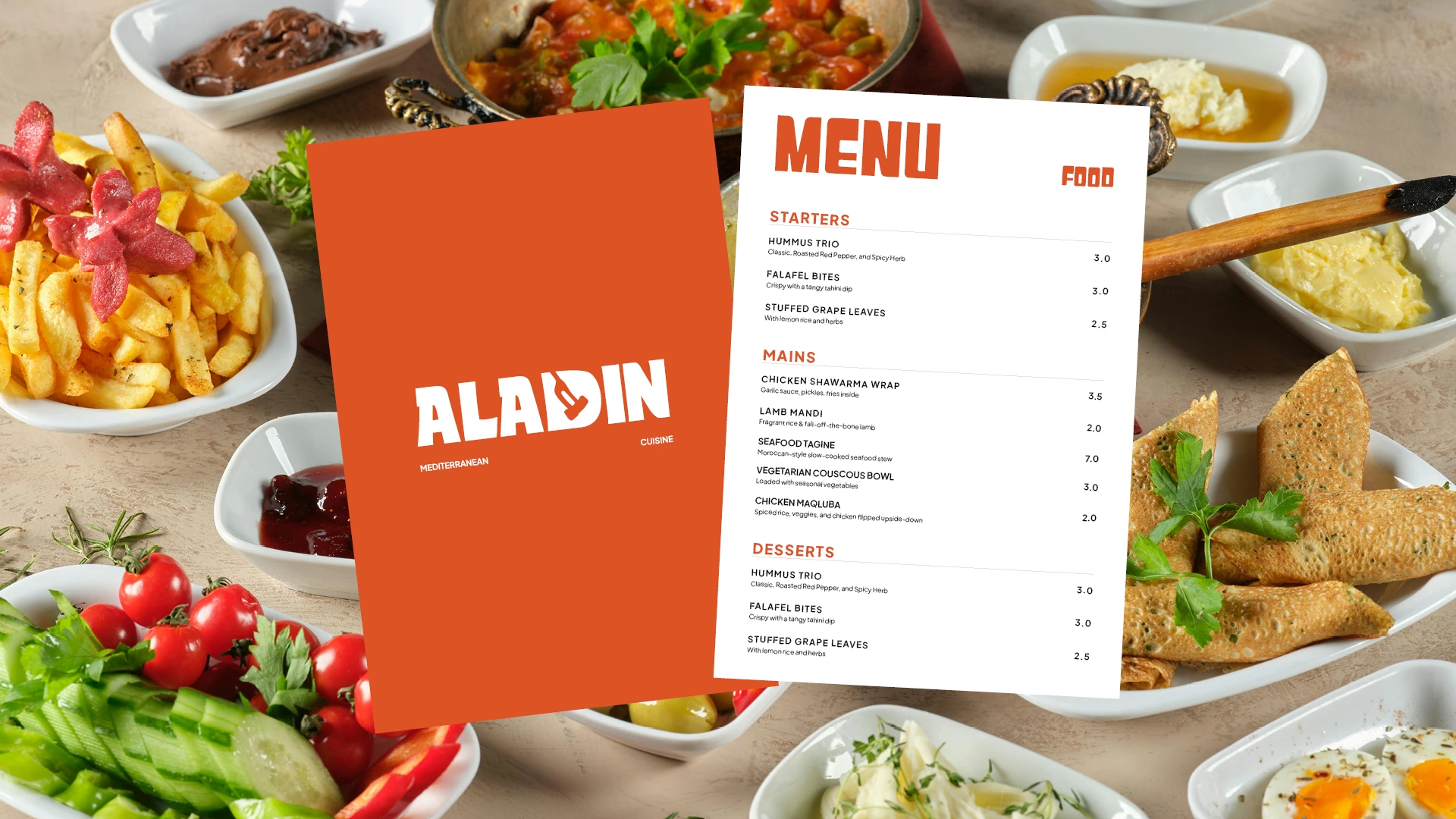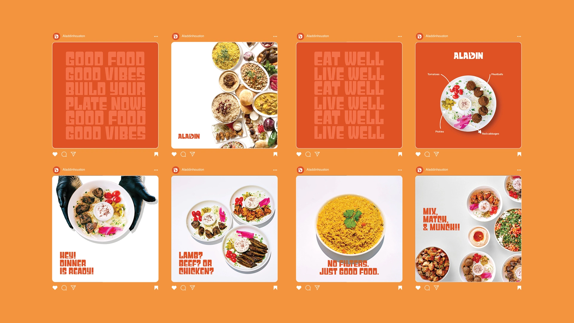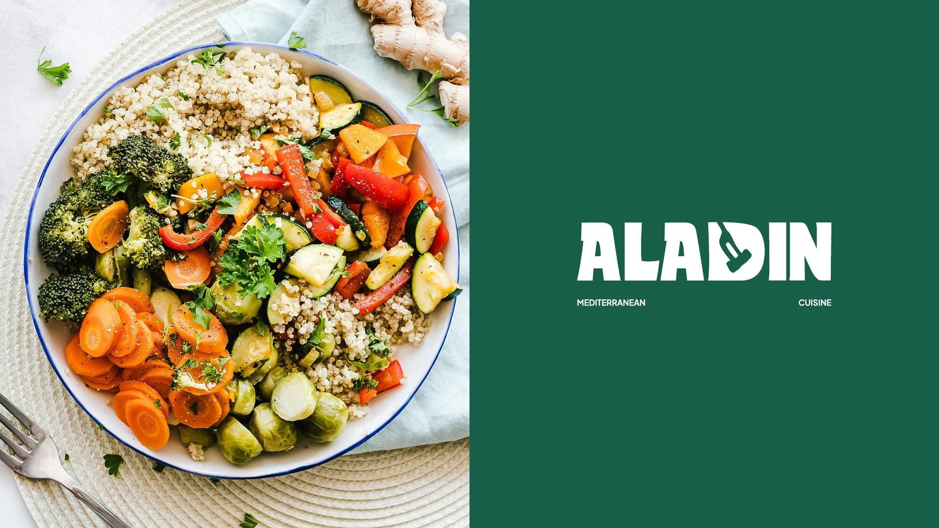 Reimagined Aladdin’s visual identity with a bold logotype, a fresh palette, and unified branding that enhances customer perception and restaurant presence.