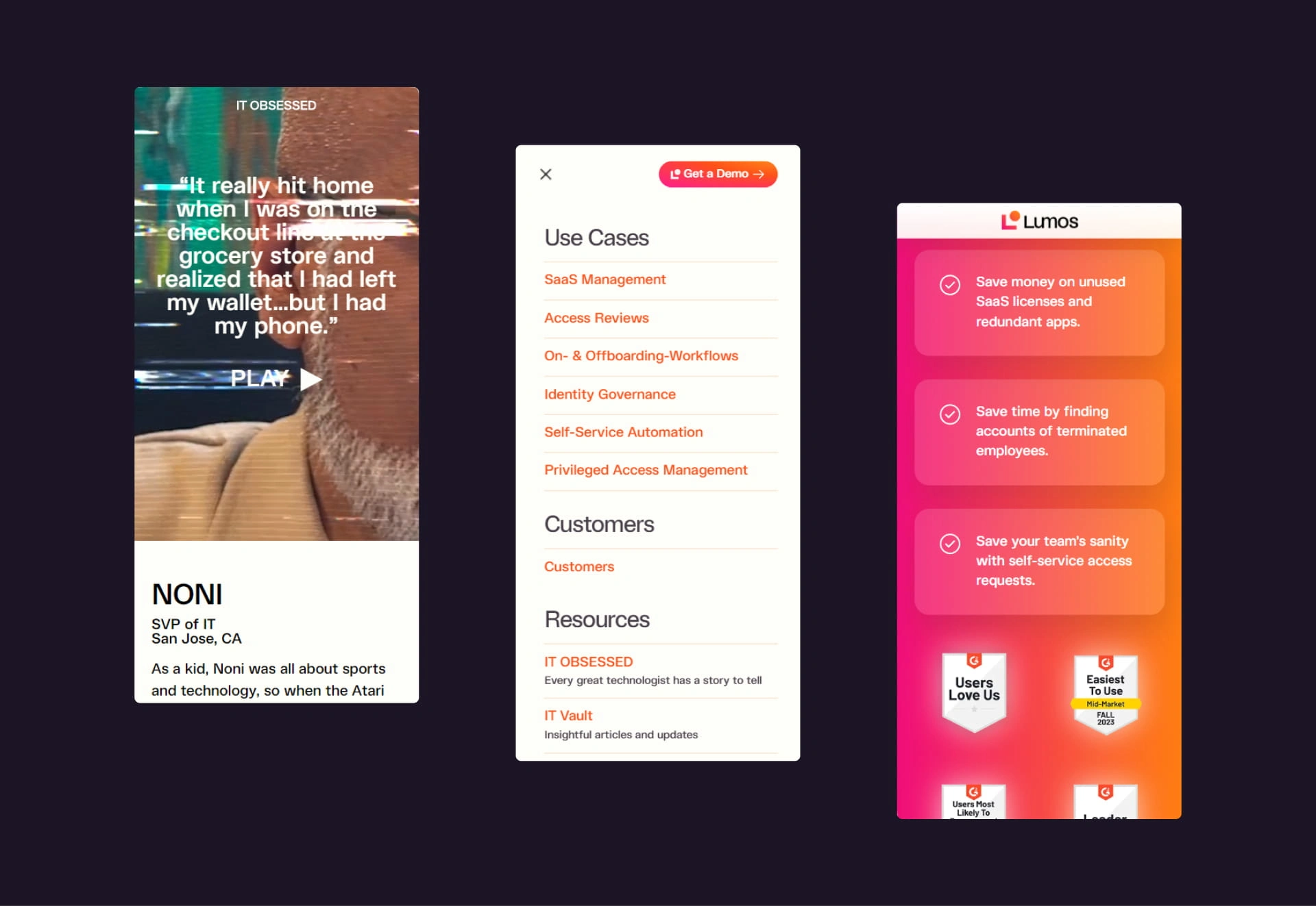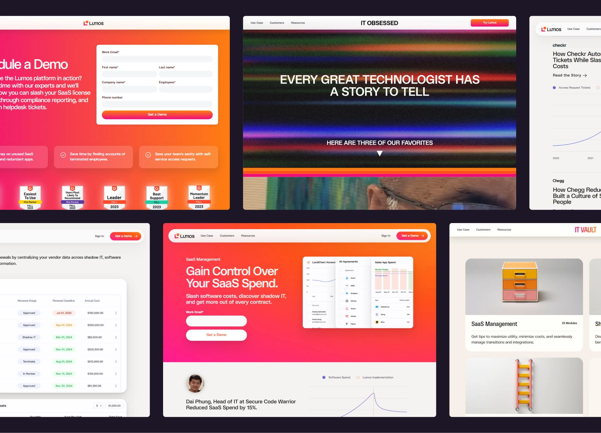 Three-year partnership with Lumos, a San Francisco B2B technology startup. We developed and maintained their complete Webflow website, delivering 100+ pages including landing pages, microsites, interactive games, and event pages. We established agile workflows with their sales, design, and marketing teams, running weekly development sprints.