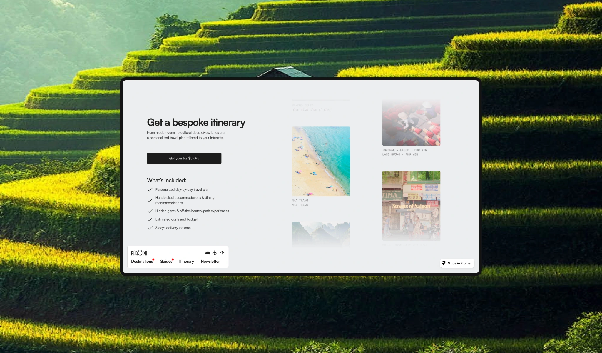 Pagoda is a Vietnam travel platform built for the modern explorer. I developed their brand identity and Framer website from the ground up, creating an immersive digital experience that reflects the richness and diversity of Vietnamese culture.