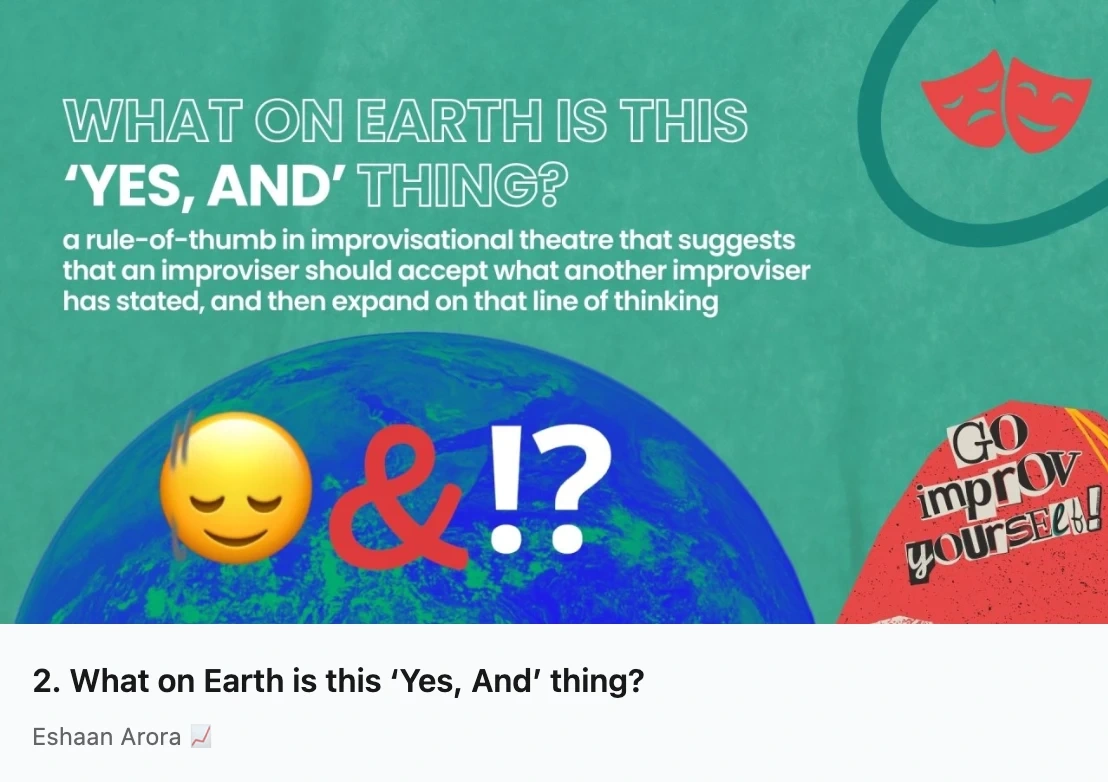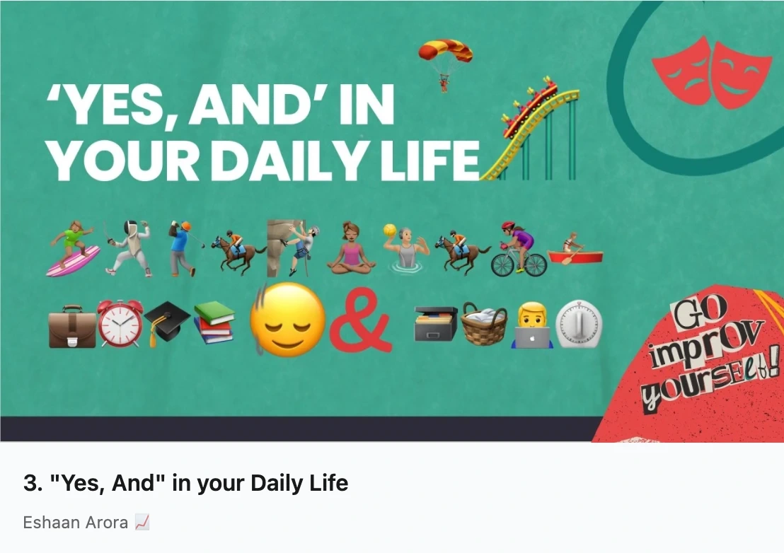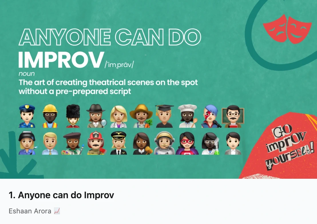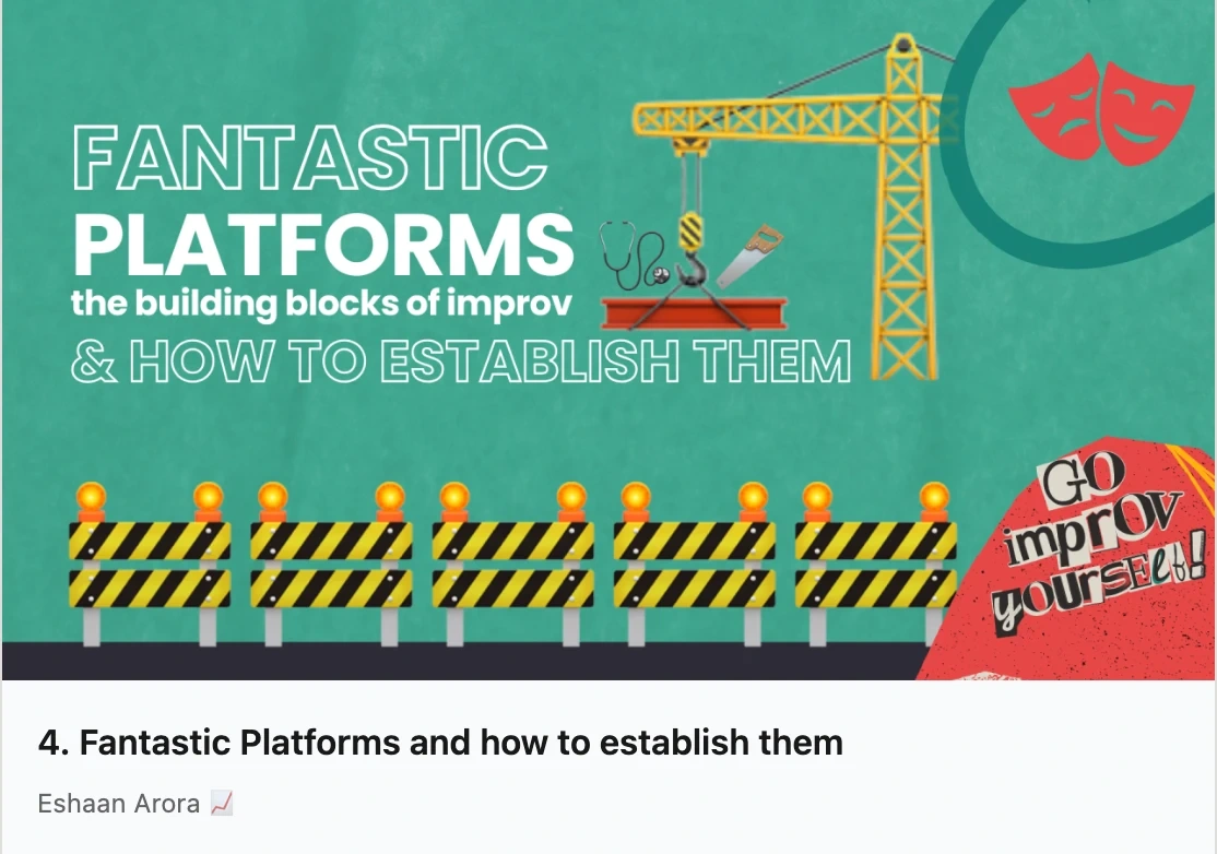 Explores "platforms", i.e., the who, where, and what that form the foundation of any improv scene. Written with both craft and candour, including a personal note on how understanding platforms has helped me navigate social anxiety and ADHD in real conversations.