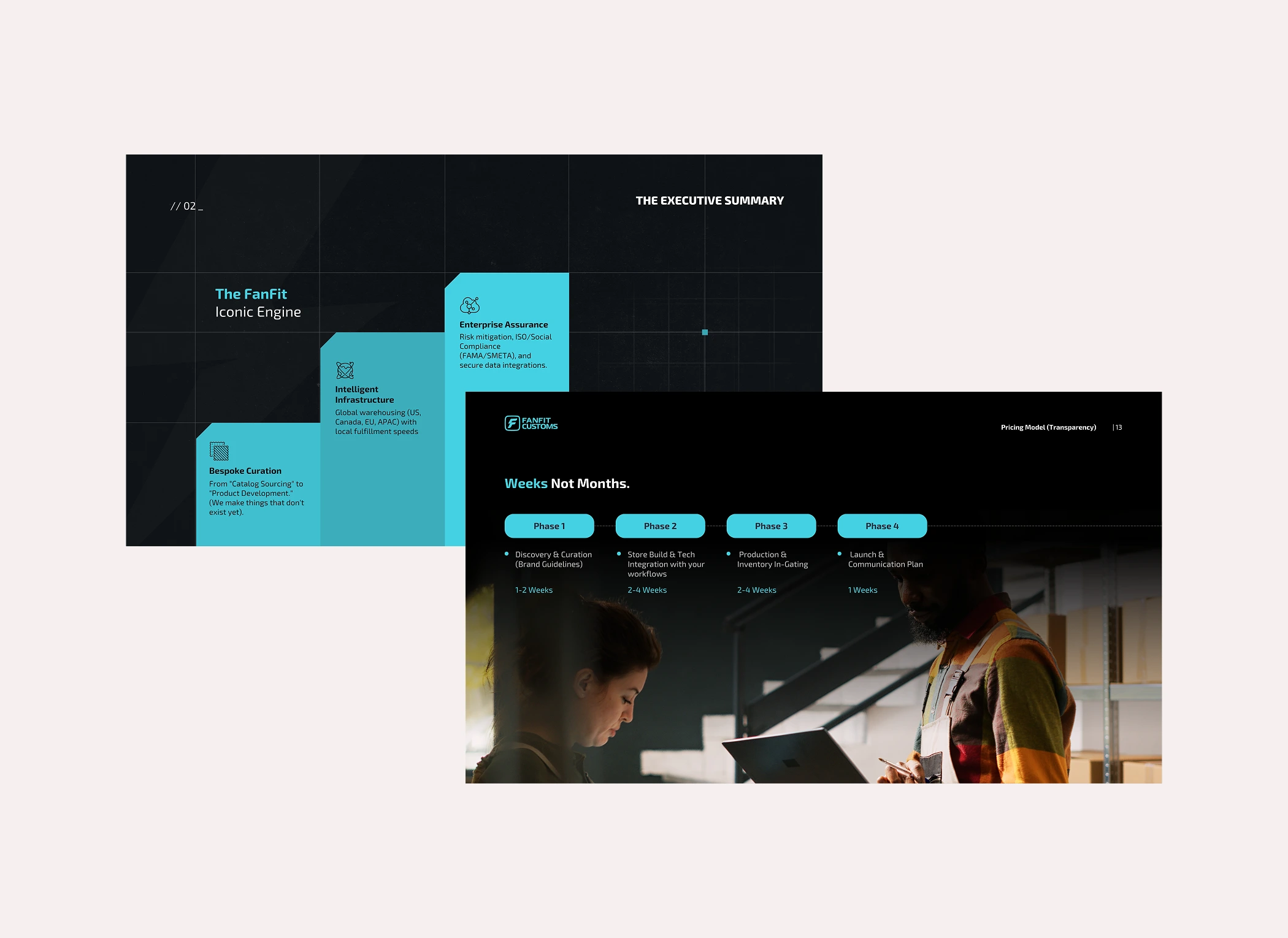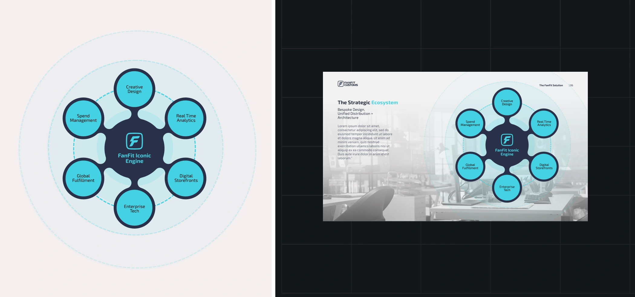 FanFit needed a dynamic, distinctive company profile to standout and attract B2B partnerships. The presentation had to clearly communicate their ecosystem while remaining fully editable in Canva for future updates and internal use.