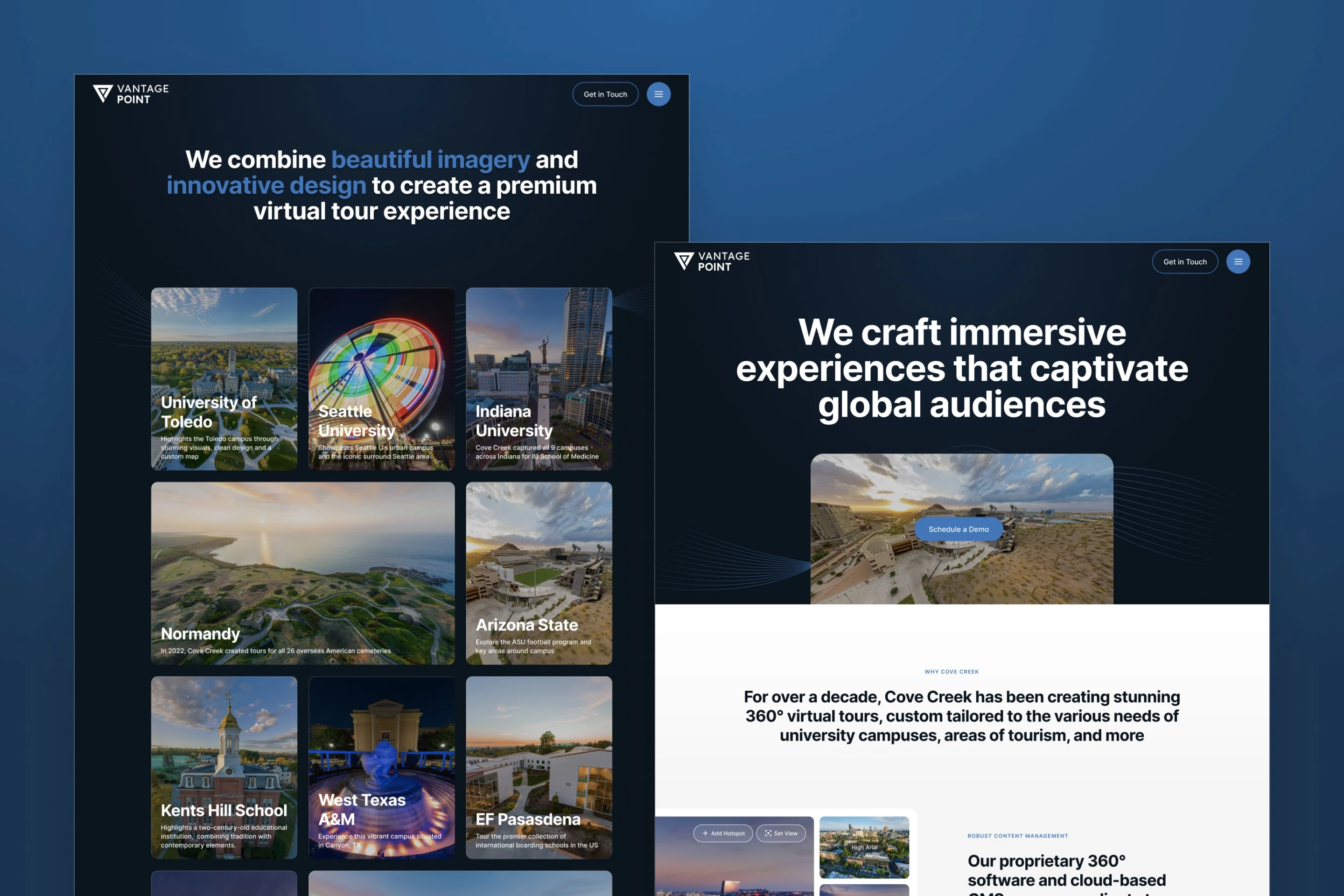 Vantage Point is a creative studio that builds immersive 360° virtual tours to showcase campuses and tourism destinations with stunning detail and interactivity.