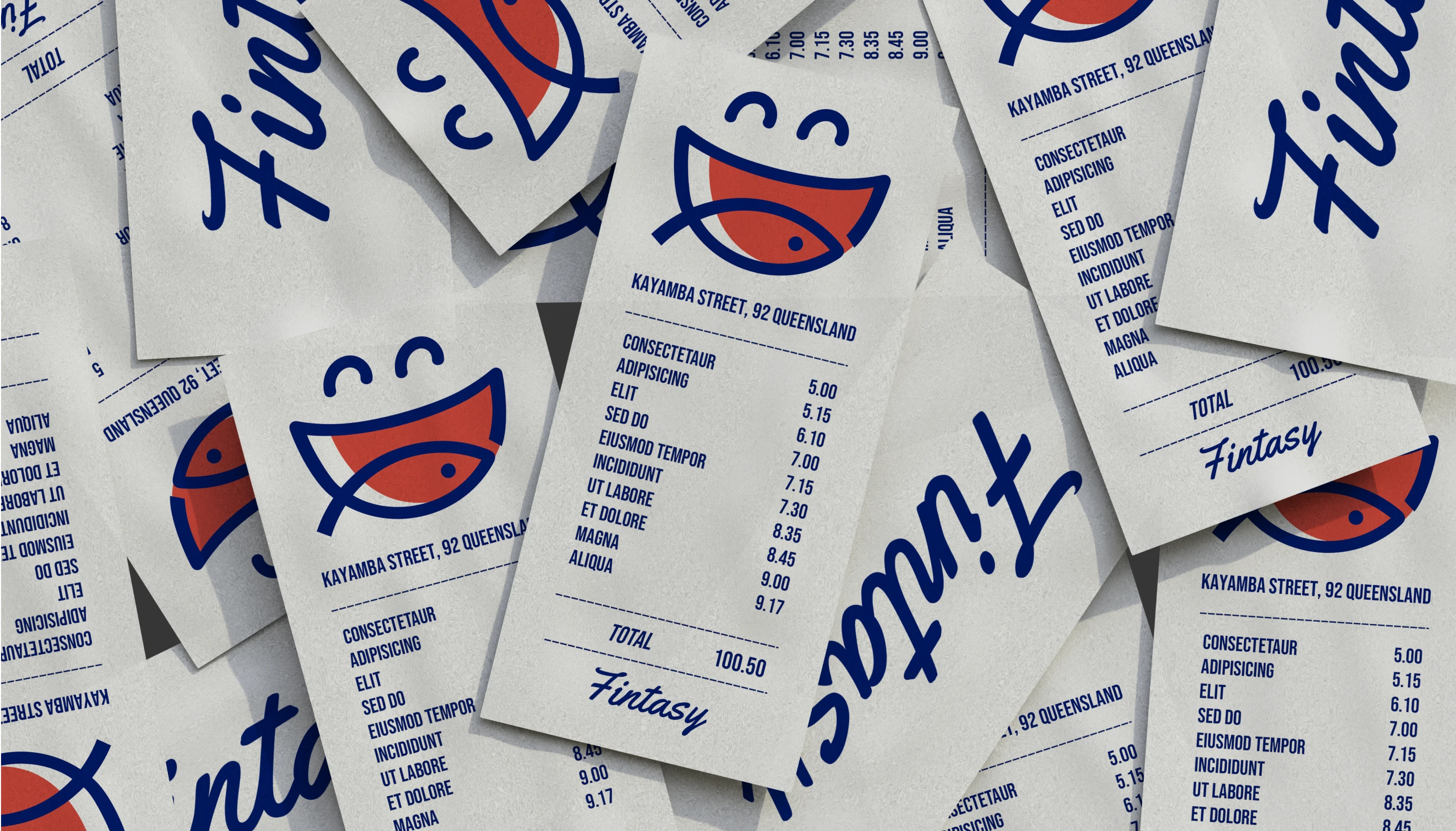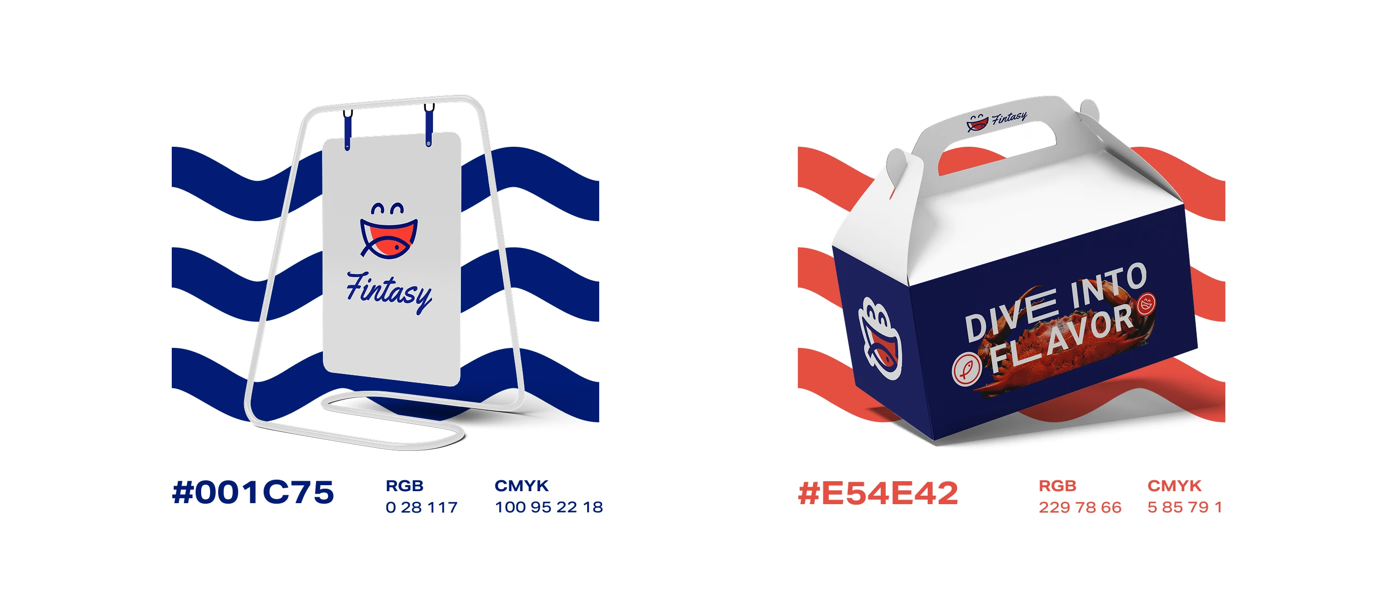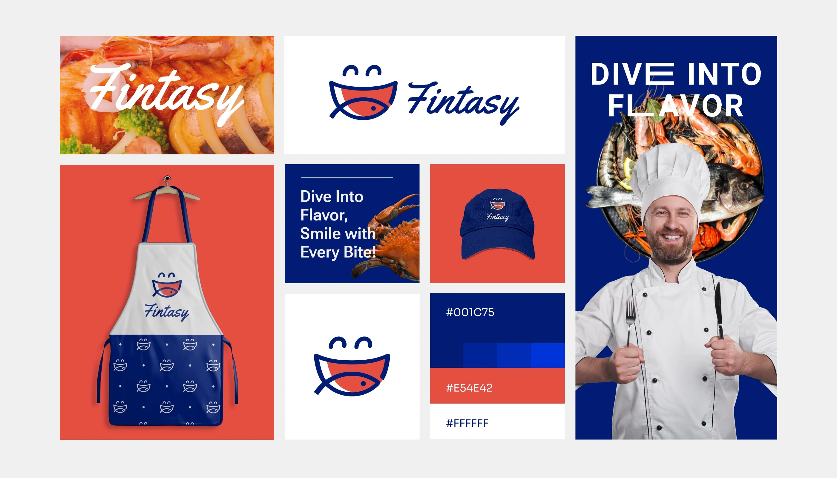 The Fintasy logo combines playfulness and elegance, featuring a smiling fish that symbolizes joy, freshness, and great seafood. The smile-shaped bowl represents both the ocean’s bounty and a delightful dining experience. With bold navy blue for trust and vibrant red-orange for warmth and excitement, the logo is inviting and memorable. Its modern typography reinforces Fintasy’s fun yet high-quality brand identity, making it a standout in seafood dining.