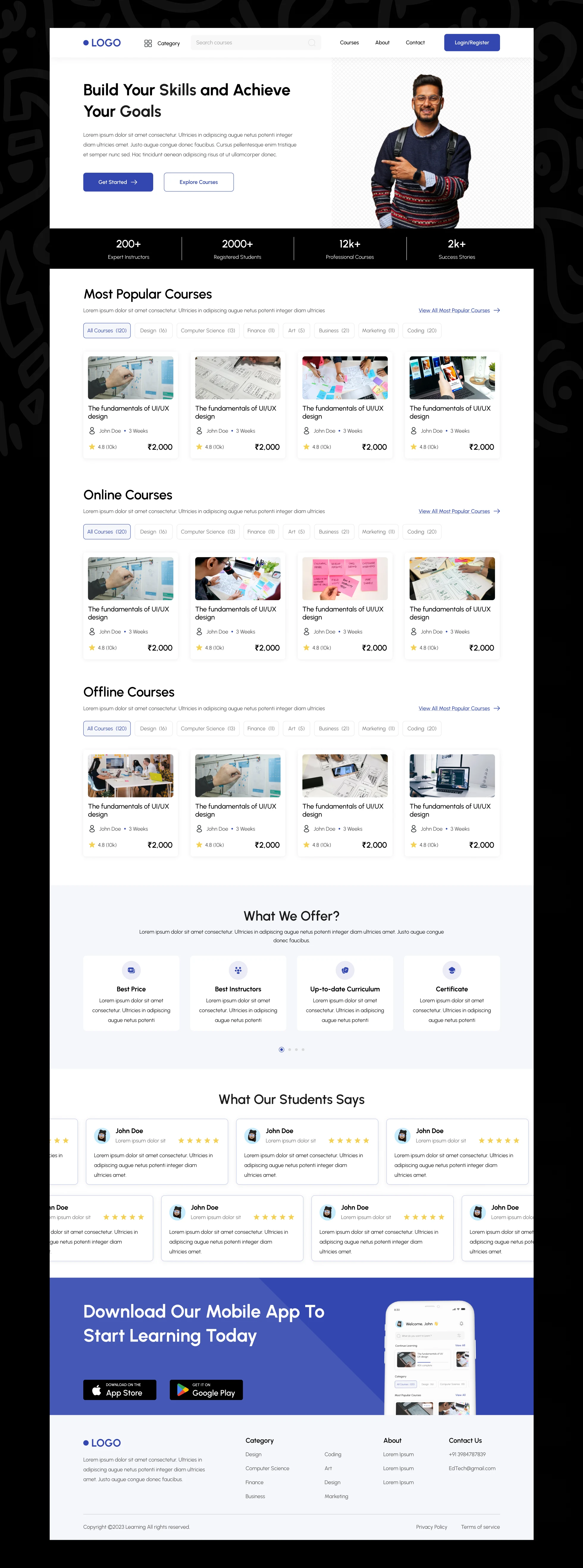 This project focused on designing the landing page for an eLearning website inspired by platforms like Udemy. The goal was to create a visually appealing and conversion-driven homepage that clearly communicates the platform’s value — connecting learners with expert instructors and diverse online courses. The design prioritizes clarity, trust, and user engagement through a clean layout and strong visual hierarchy.