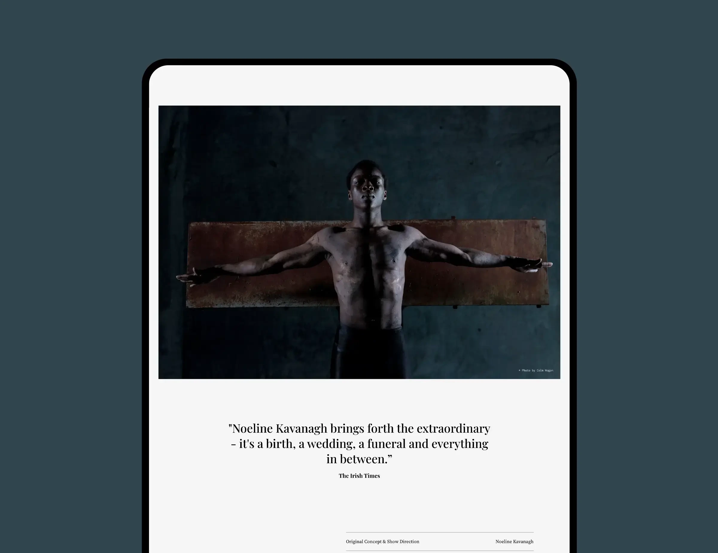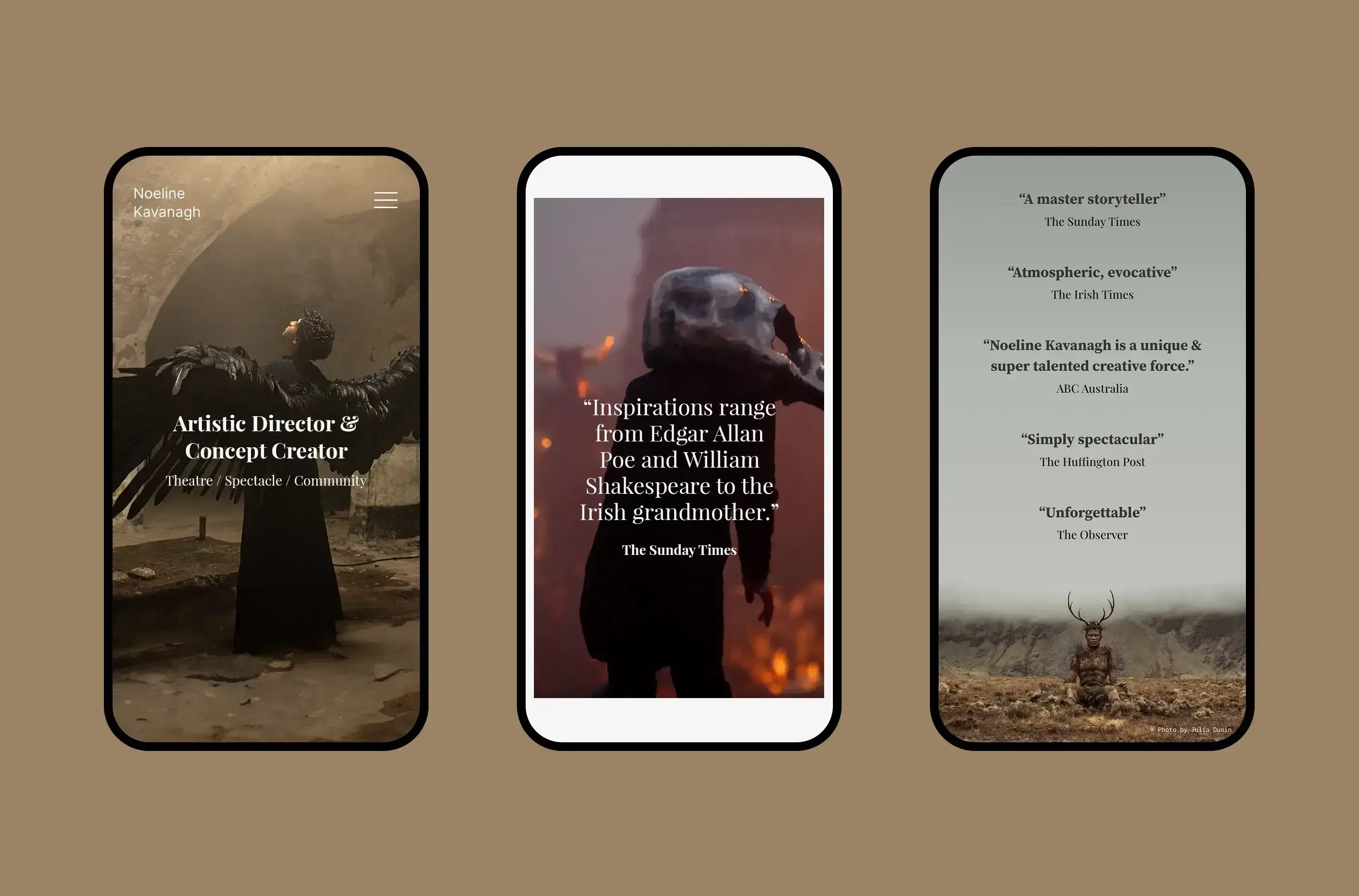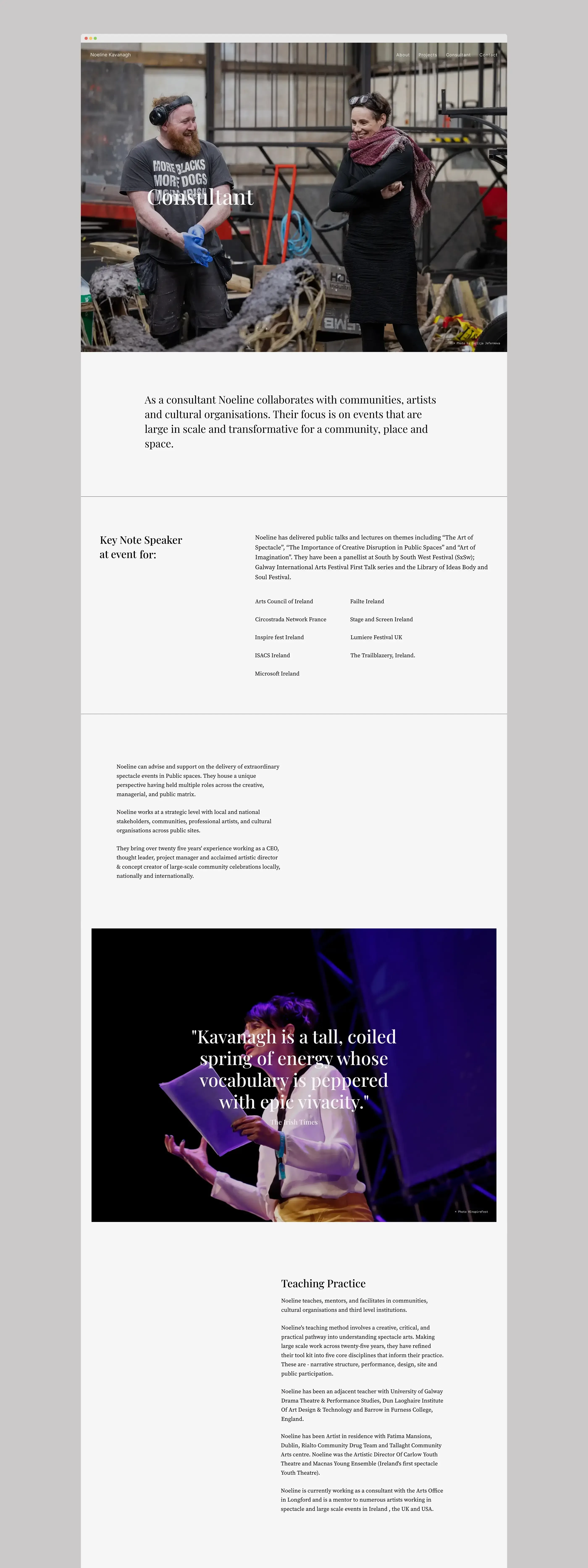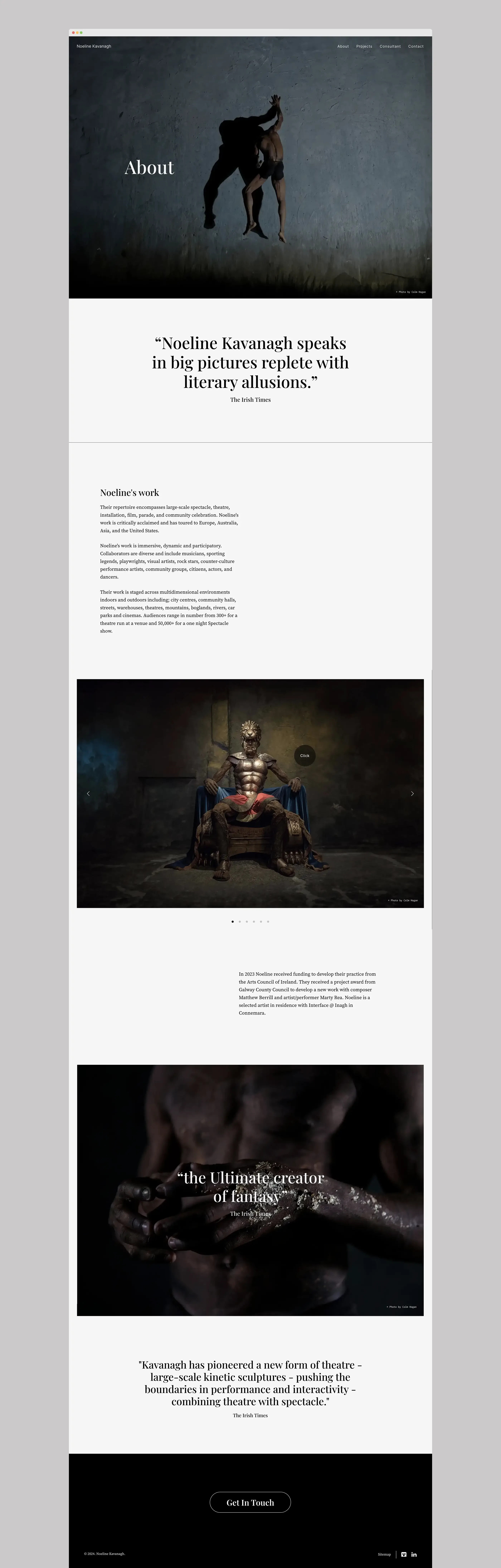 Noeline Kavanagh, an artistic director and concept creator, asked me to create a website that would strikingly present her work. The design uses a crisp, uncluttered layout where her projects stand out, with bold full-screen photography that instantly draws attention to her artistry.