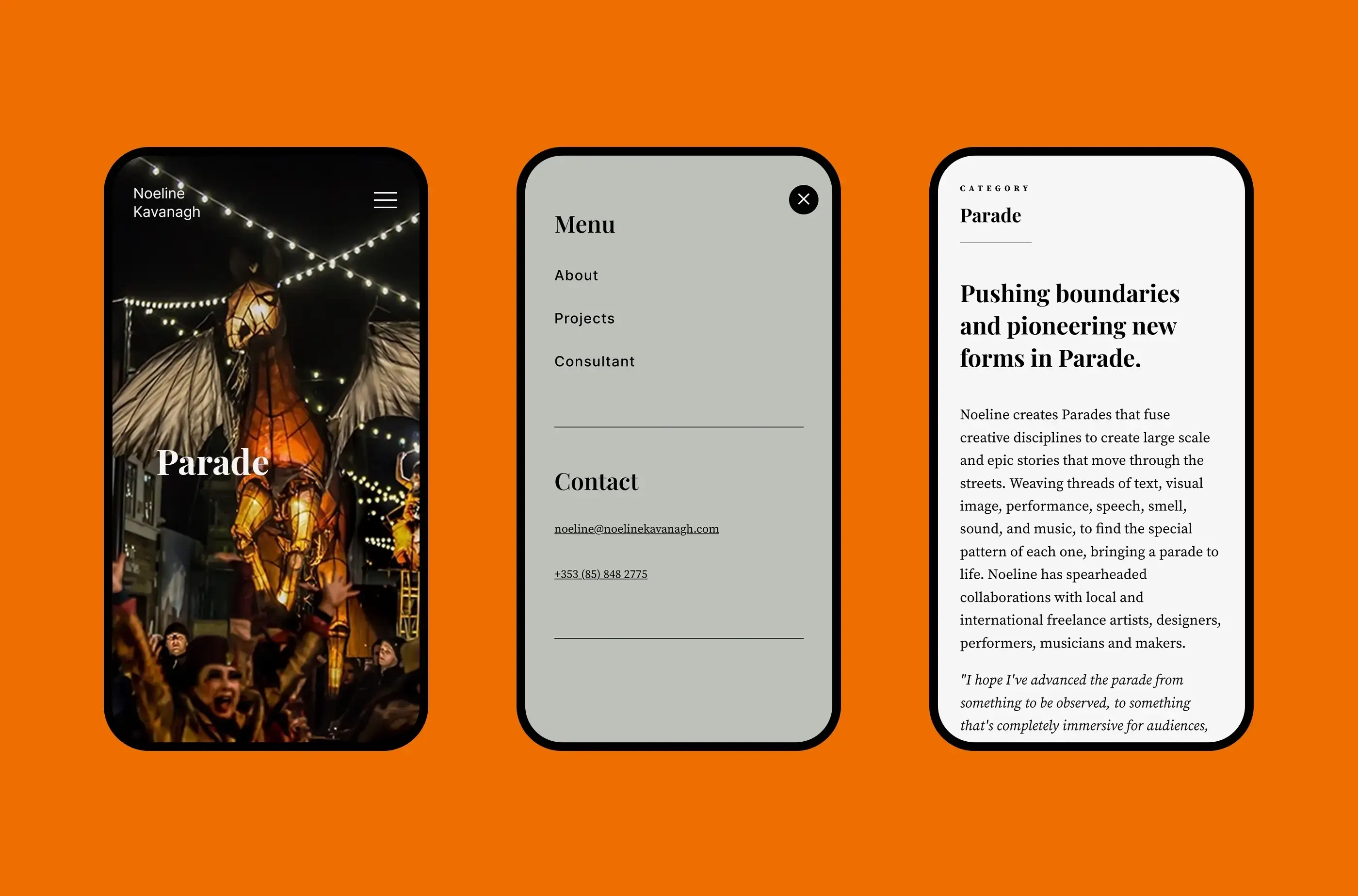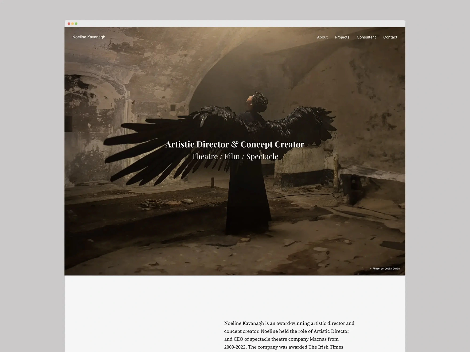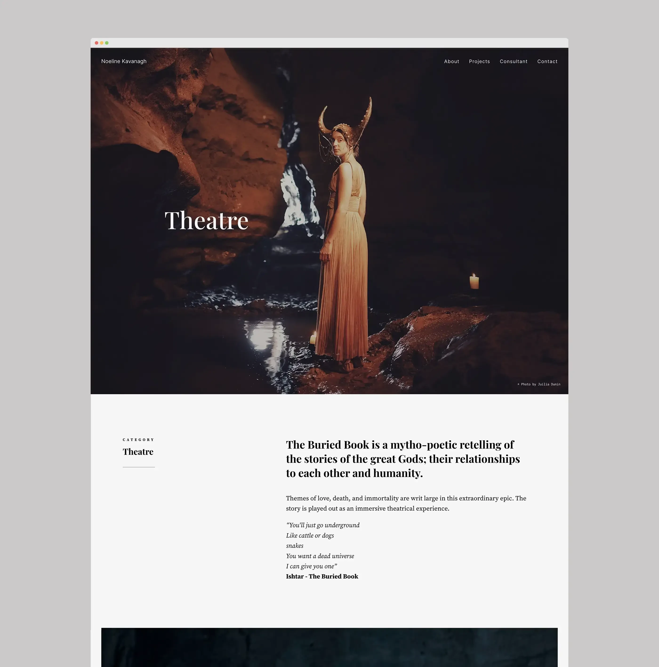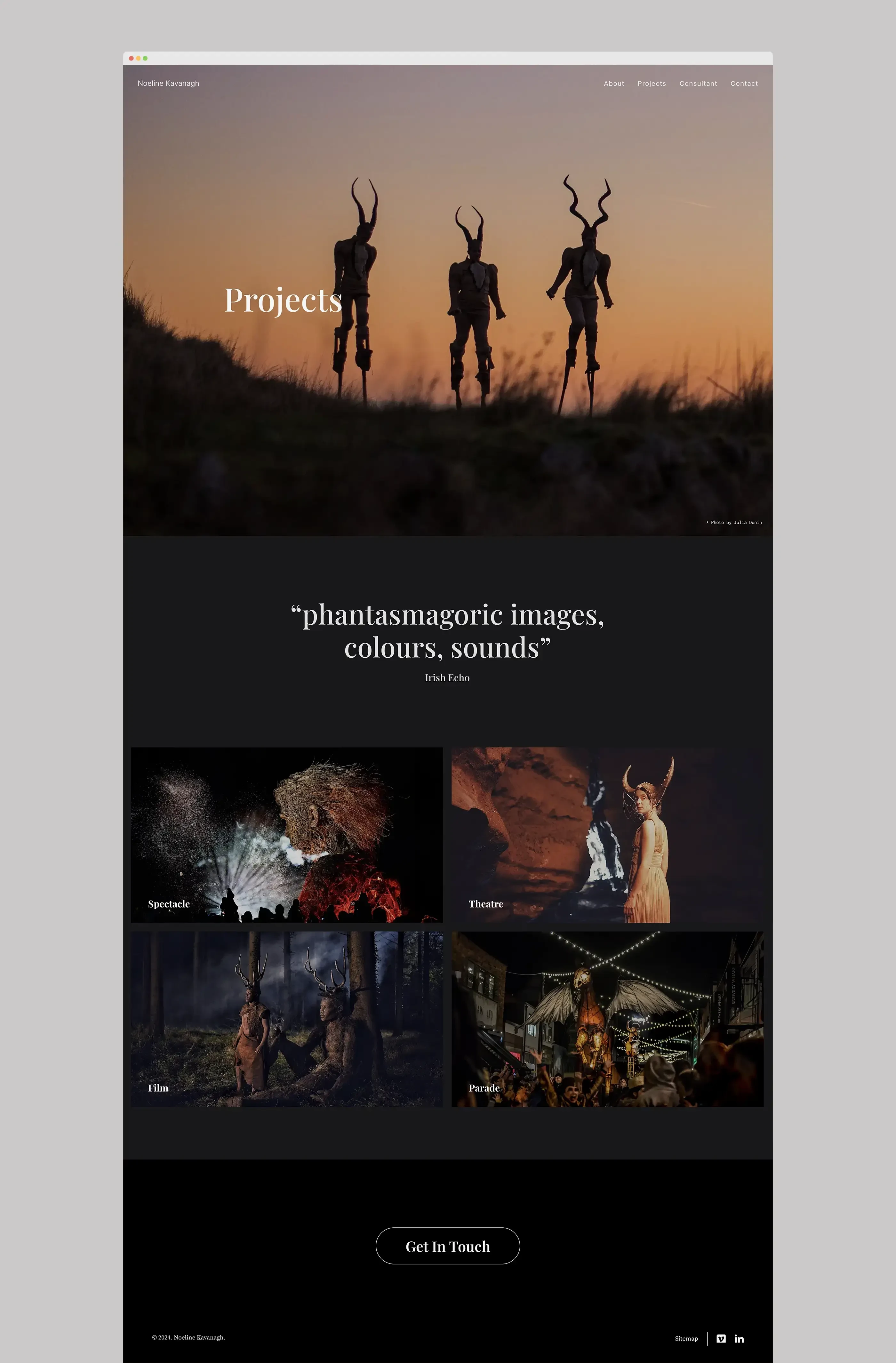 Noeline Kavanagh, an artistic director and concept creator, asked me to create a website that would strikingly present her work. The design uses a crisp, uncluttered layout where her projects stand out, with bold full-screen photography that instantly draws attention to her artistry.