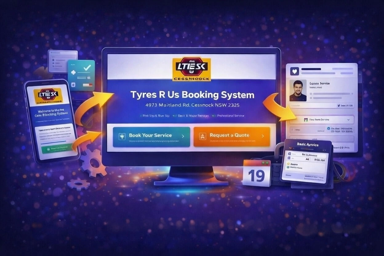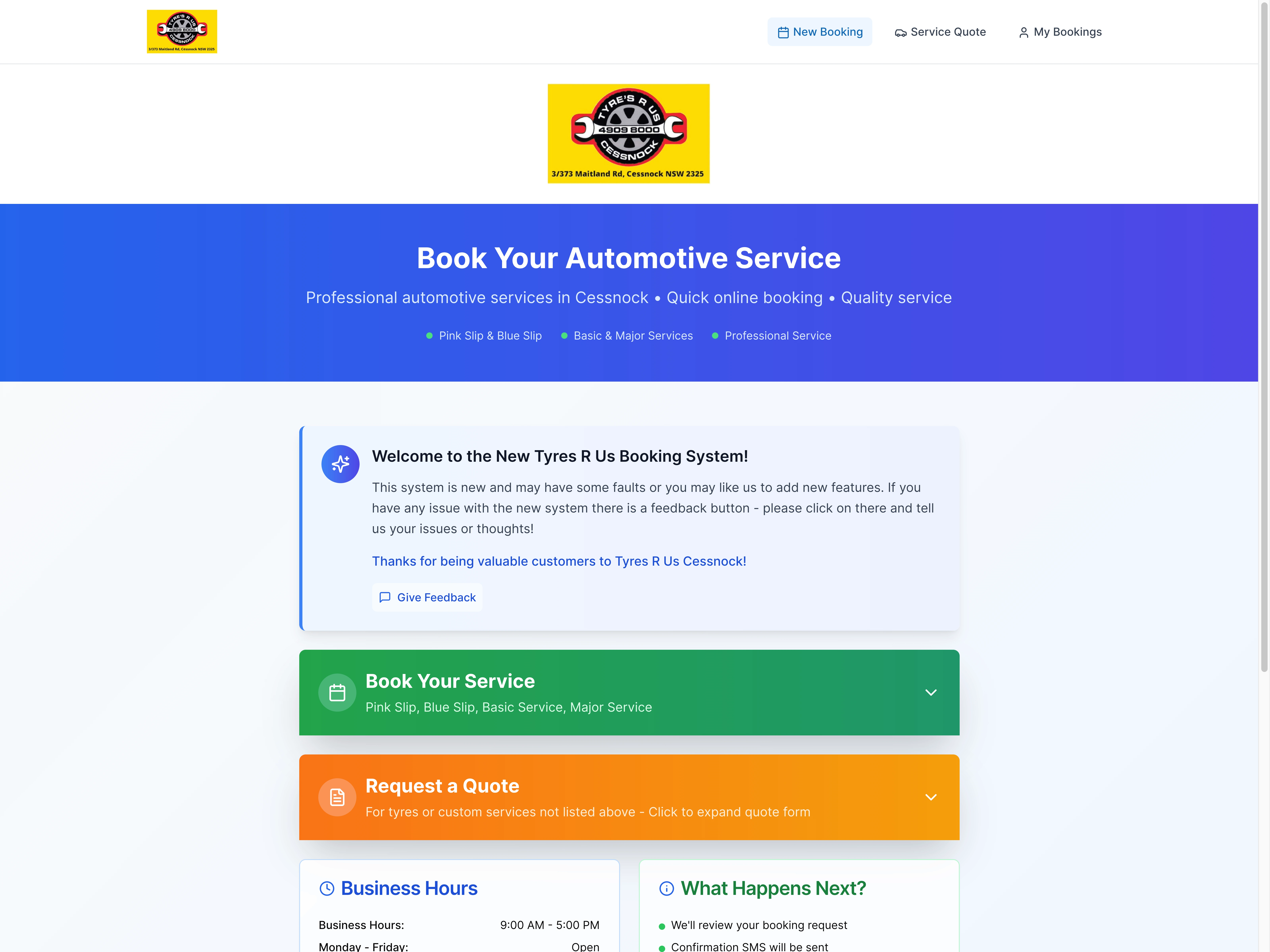This project is a full-stack automotive service booking system for "Tyres R Us Cessnock." Its purpose is to modernize operations, enhance customer engagement, and streamline internal workflows. Key capabilities include online booking, real-time availability, responsive design, online quote requests, integration with external suppliers for pricing, and efficient management of customer and vehicle data. The ambition is to increase efficiency and customer satisfaction.
