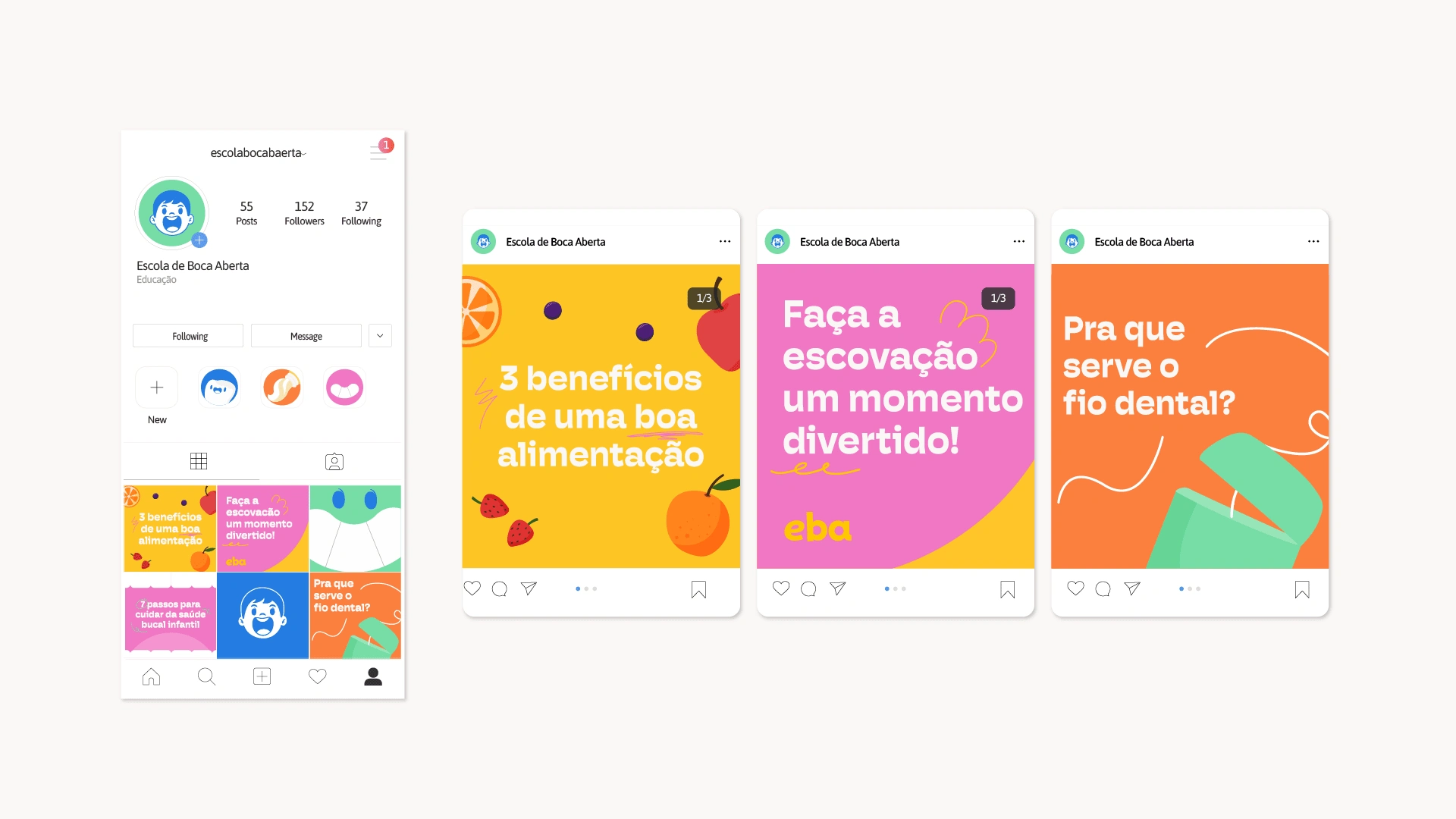 Escola de Boca Aberta (EBA) is a visual identity project for an oral health education initiative for children. The design reflects EBA’s playful and accessible