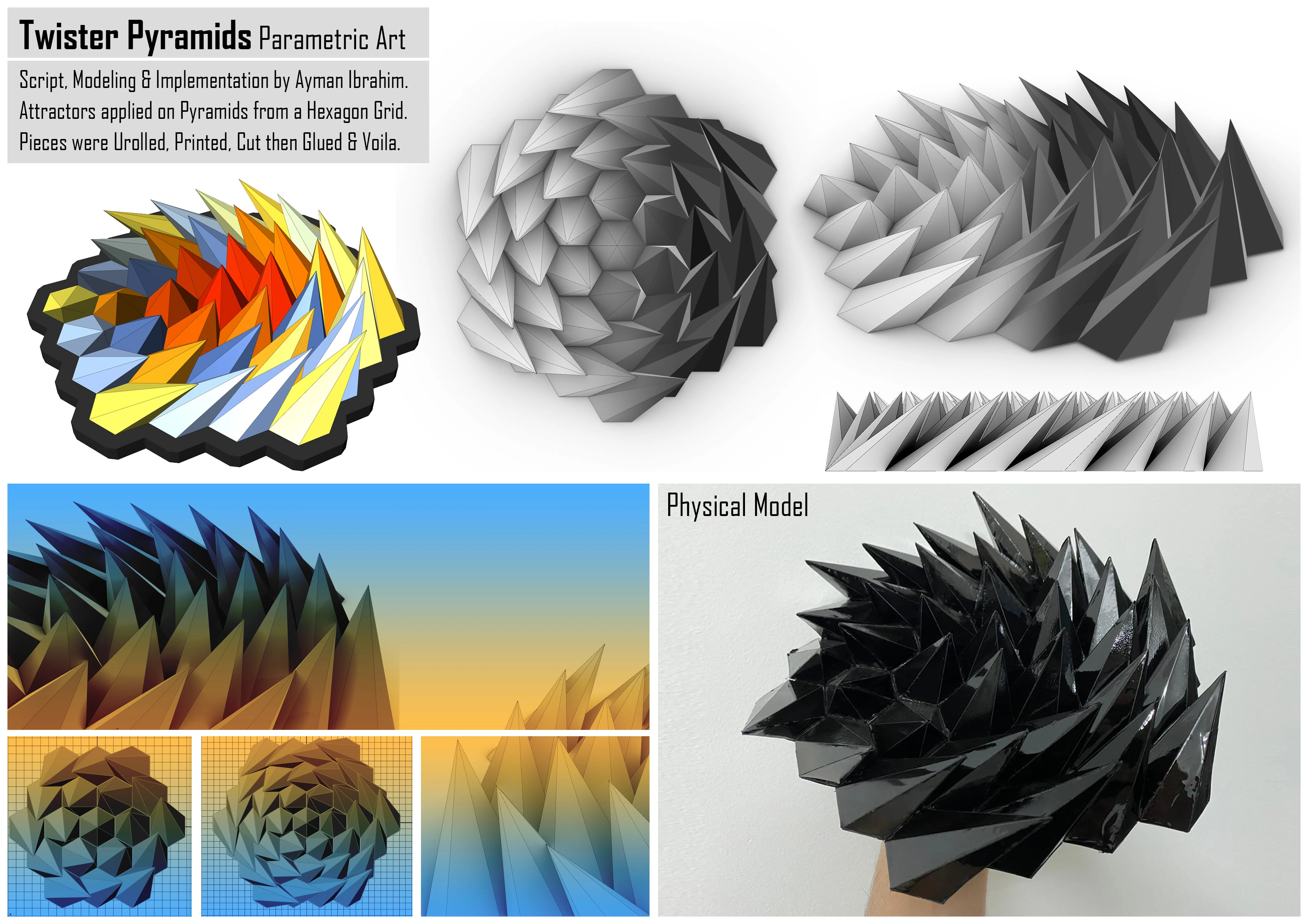 Attractors applied on Pyramids from a Hexagon Grid, then Pieces were Urolled as a preparation for printing them.