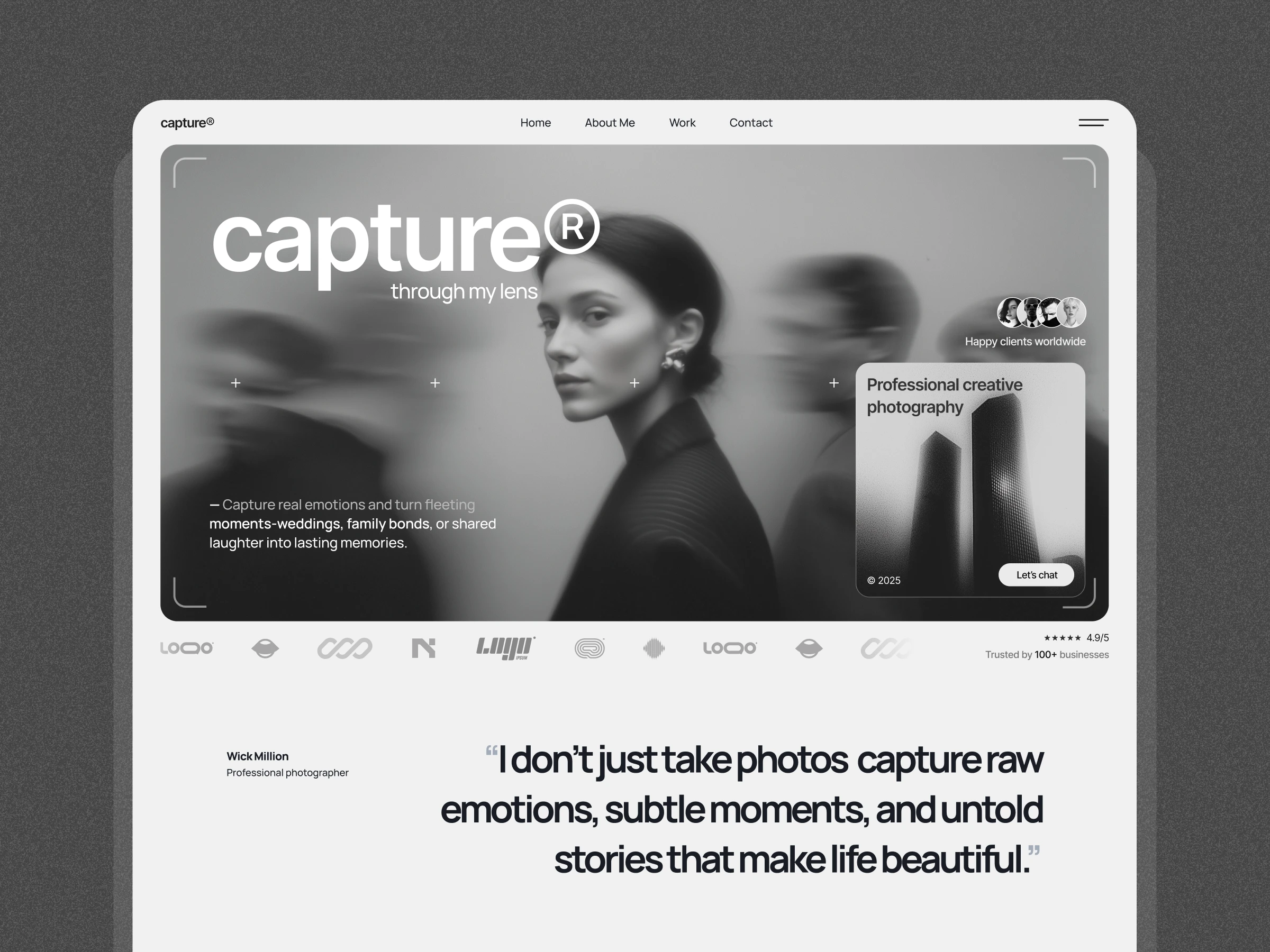 A photographer portfolio website design that’s clean, minimal, and image-focused — crafted to let the photos take center stage. Featuring a bold hero section, elegant grid layouts, smooth transitions, and carefully balanced whitespace, the design highlights visual storytelling while keeping navigation simple. Perfect for showcasing projects, client work, and personal style in a professional yet artistic way.