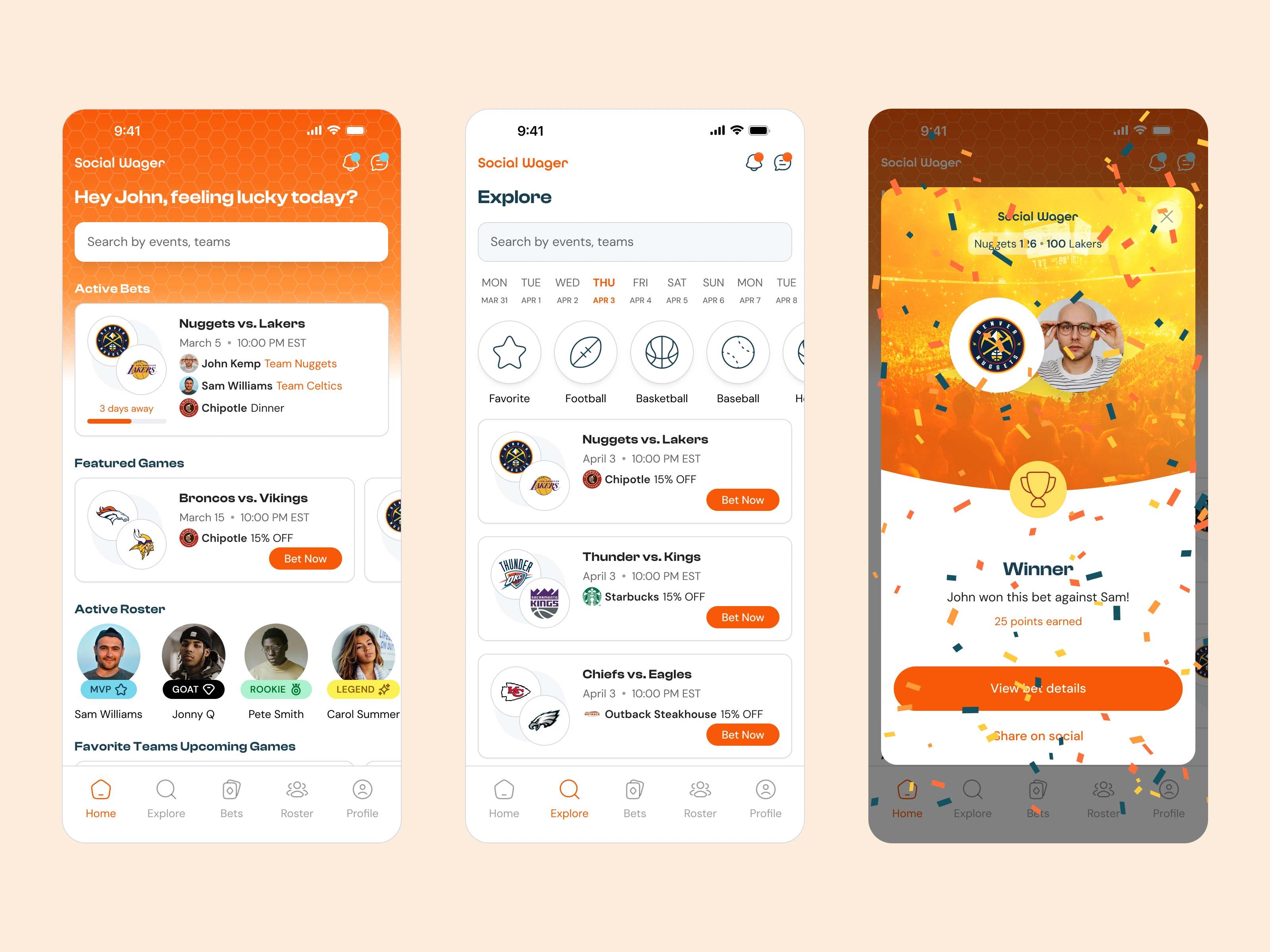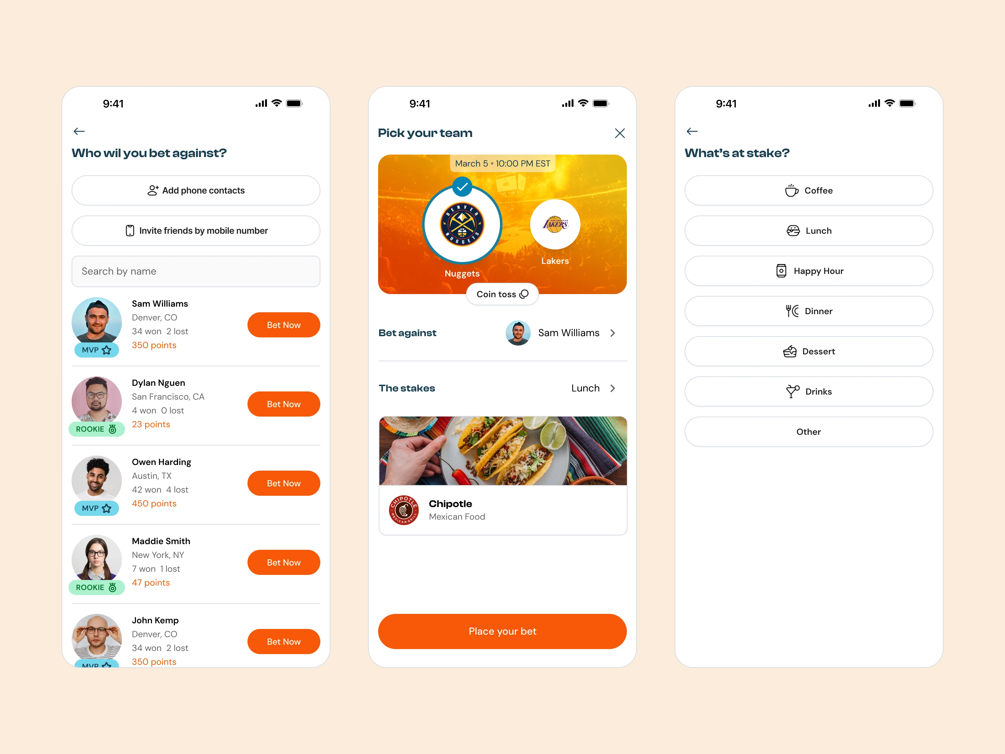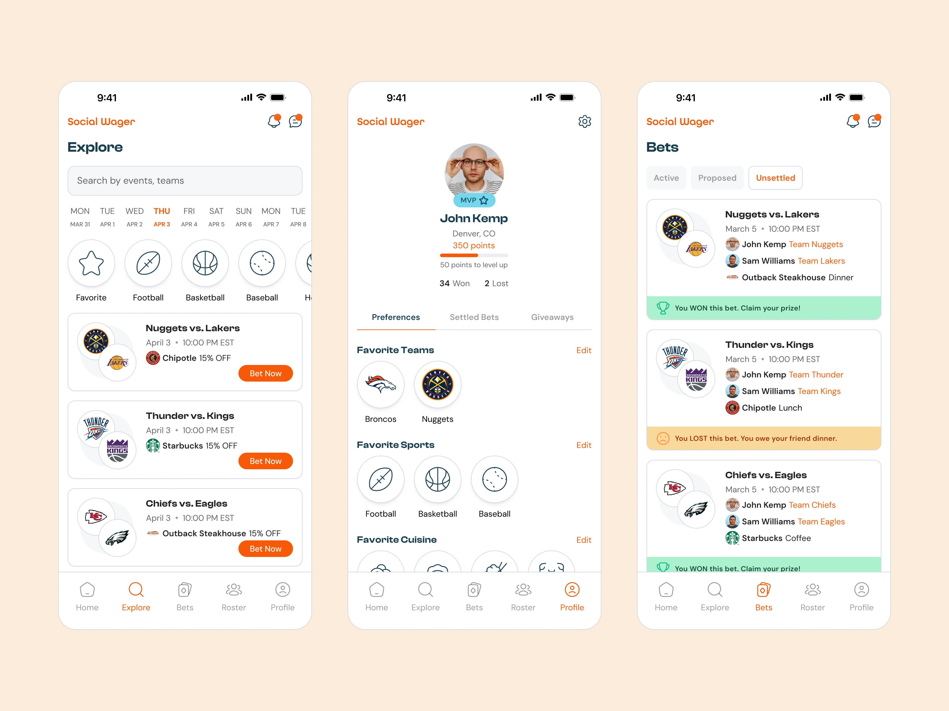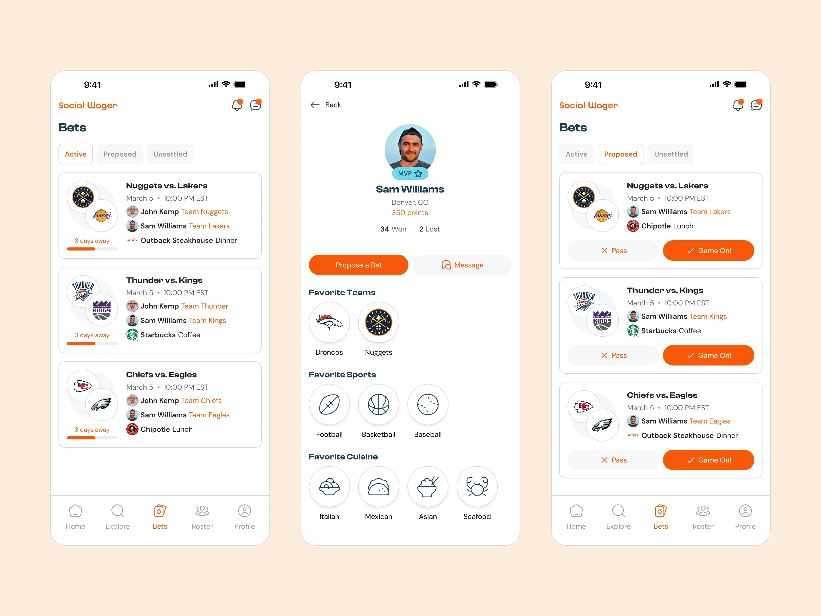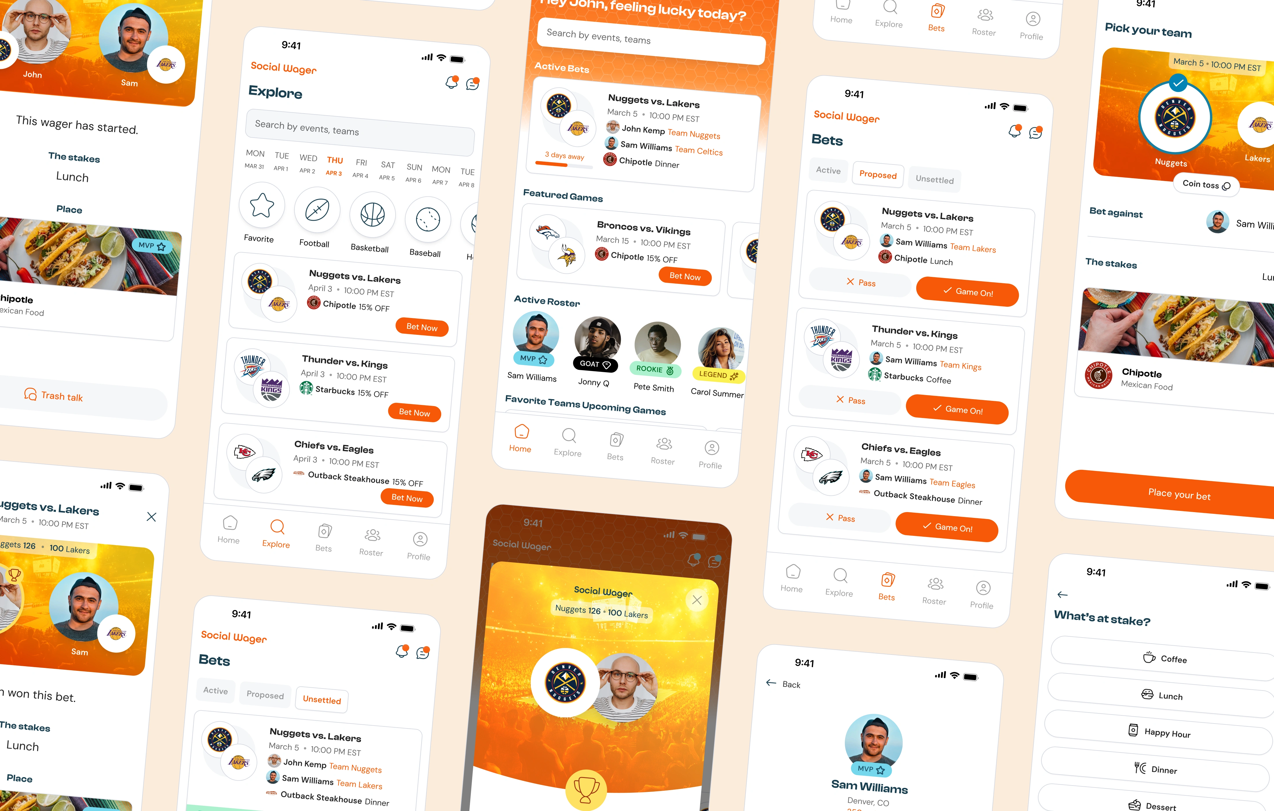 I designed a social wager mobile app that lets friends place casual, low-stakes bets—like dinner, drinks, or friendly dares—on the outcomes of sports games. The app focused on creating a playful and competitive experience rooted in real-life social dynamics rather than monetary gambling. I led the product design from concept to prototype, including user research, feature definition, and end-to-end UI/UX design. Core design goals included simplifying bet creation, fostering friendly engagement through chat and notifications, and reinforcing accountability through fun, lightweight tracking mechanisms. The experience was designed to feel social, secure, and seamless, encouraging recurring use around major sporting events.